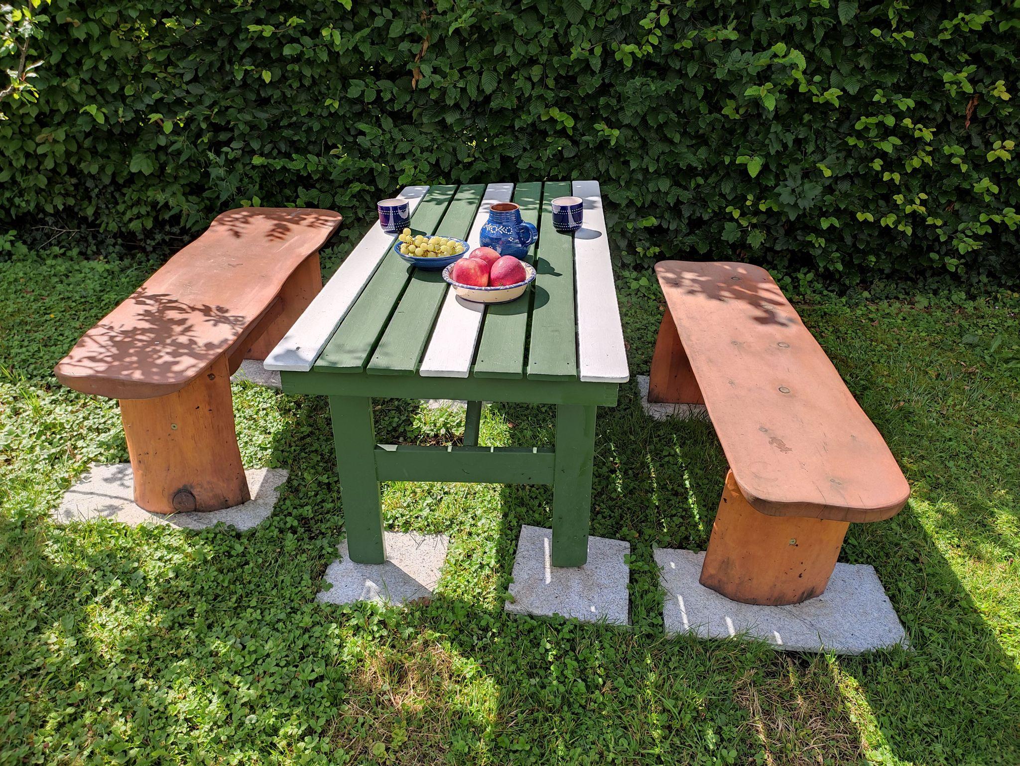 Ein großer Garten mit Liegewiese und verschiedener Sitzmöglichkeite und ein Grill sowie ein separater Balkon am Haus steht allen Gästen zur Verfügung. WLAN und TV kostenlos. 1 Parkplatz vorhanden.