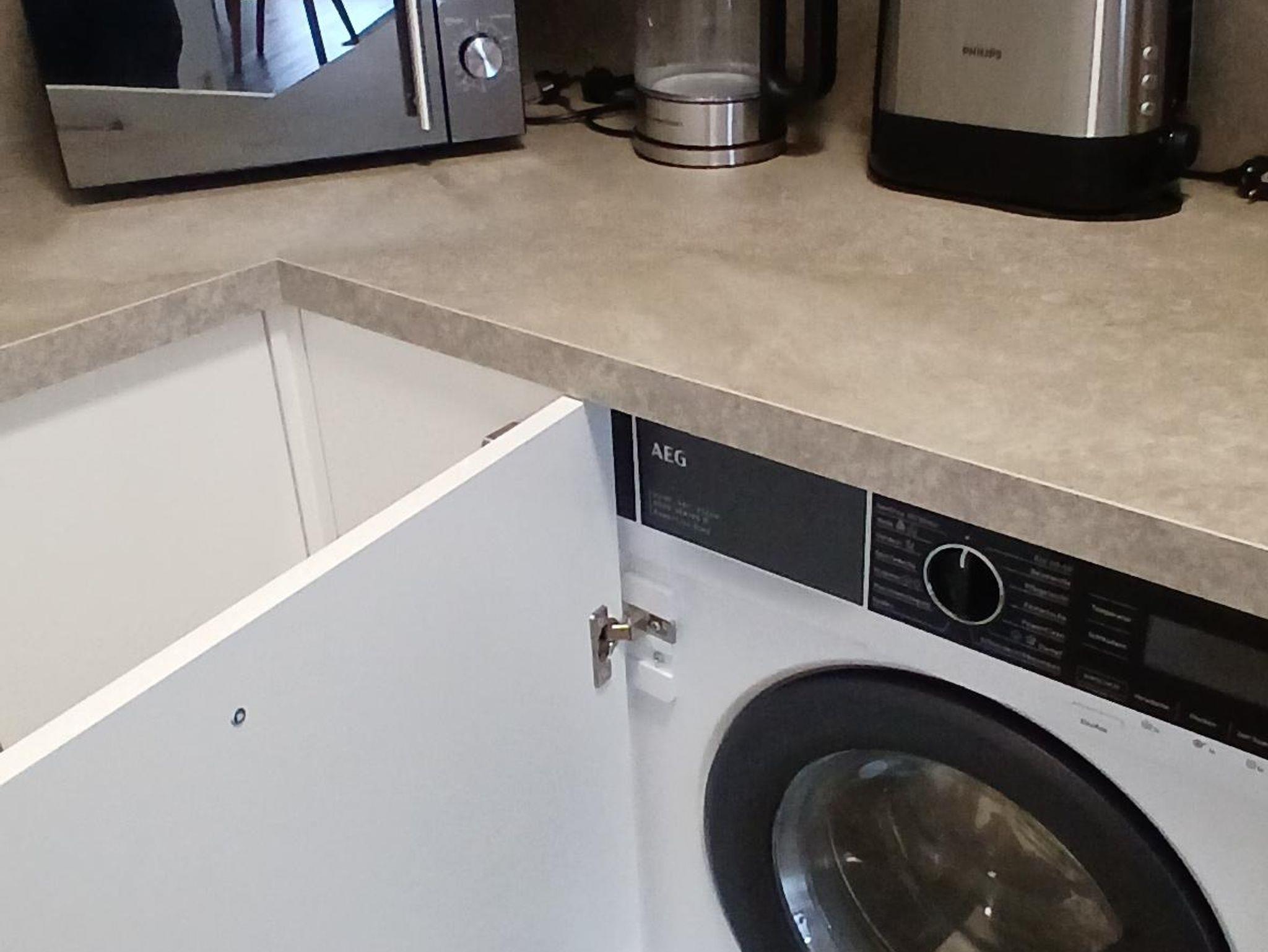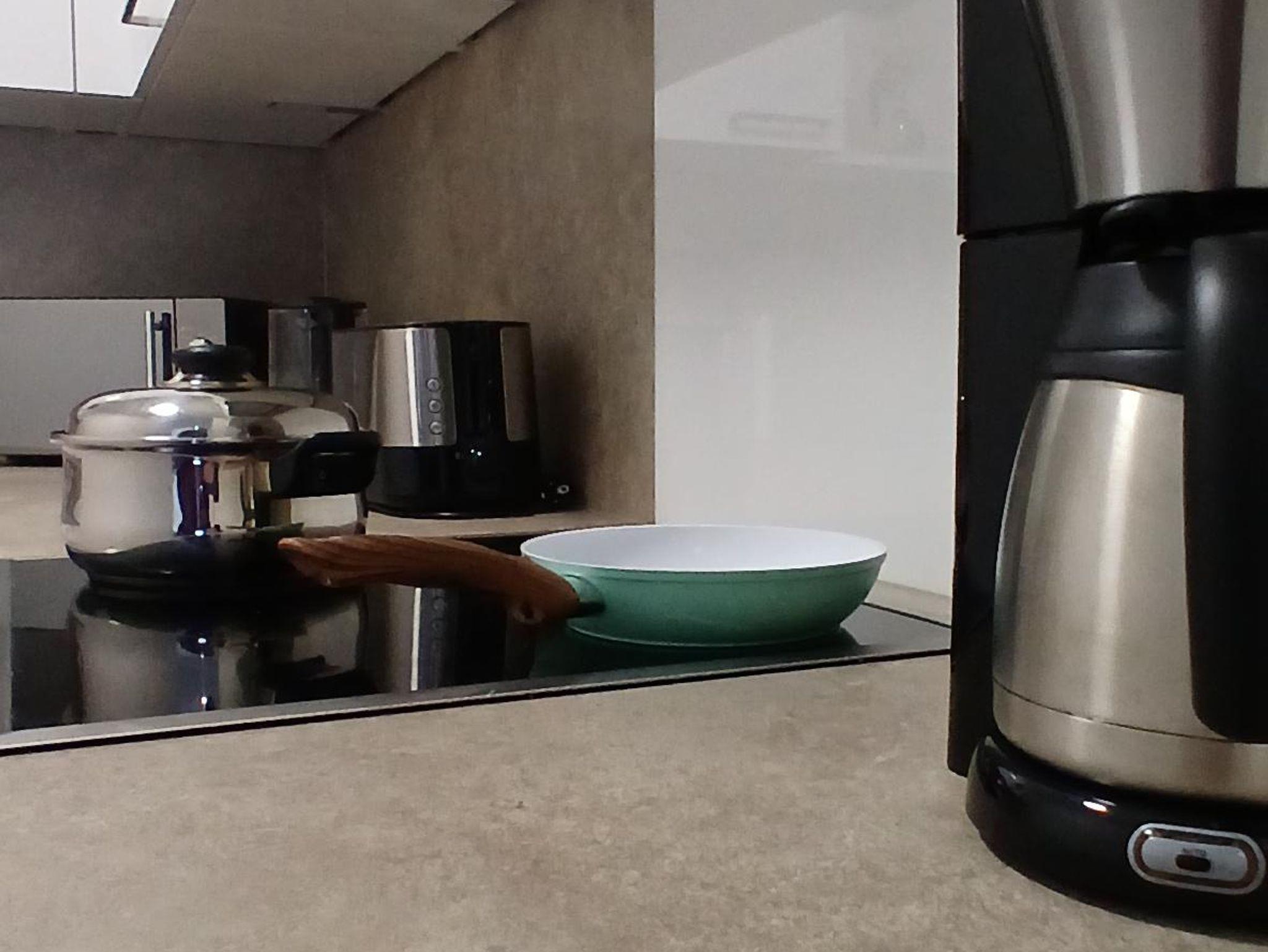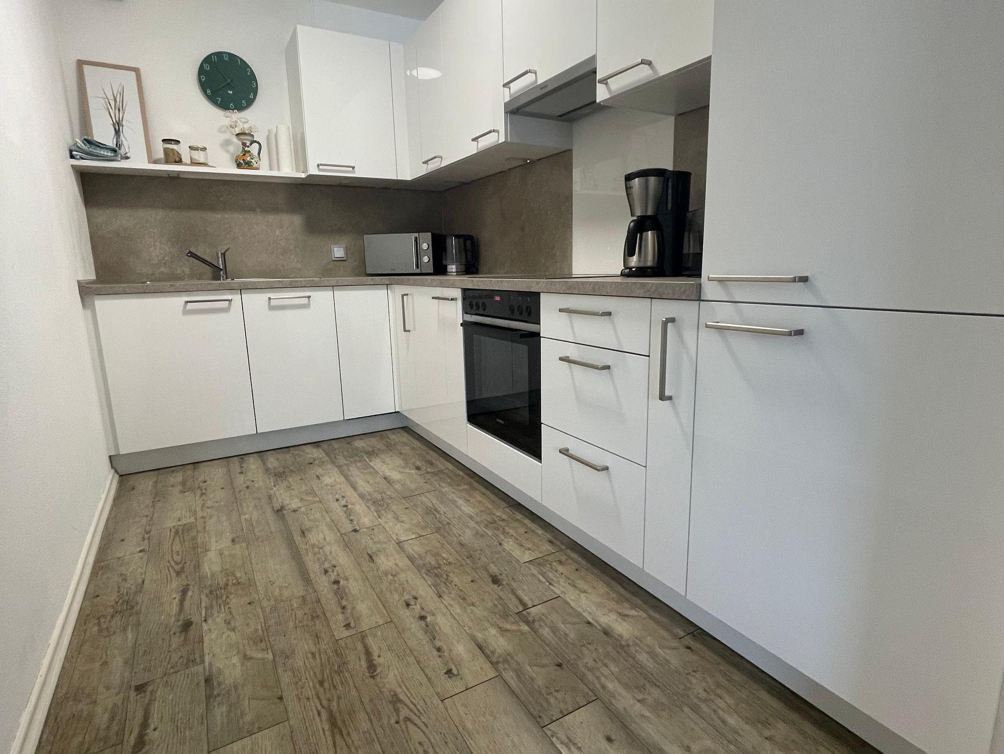 Die **offene Küche** ist voll ausgestattet mit allem, was du brauchst: Cerankochfeld, Backofen, Kühlschrank mit Gefrierfach, Spülmaschine, Kaffeemaschine, Wasserkocher und Toaster – hier lässt sich auch im Urlaub bequem kochen.