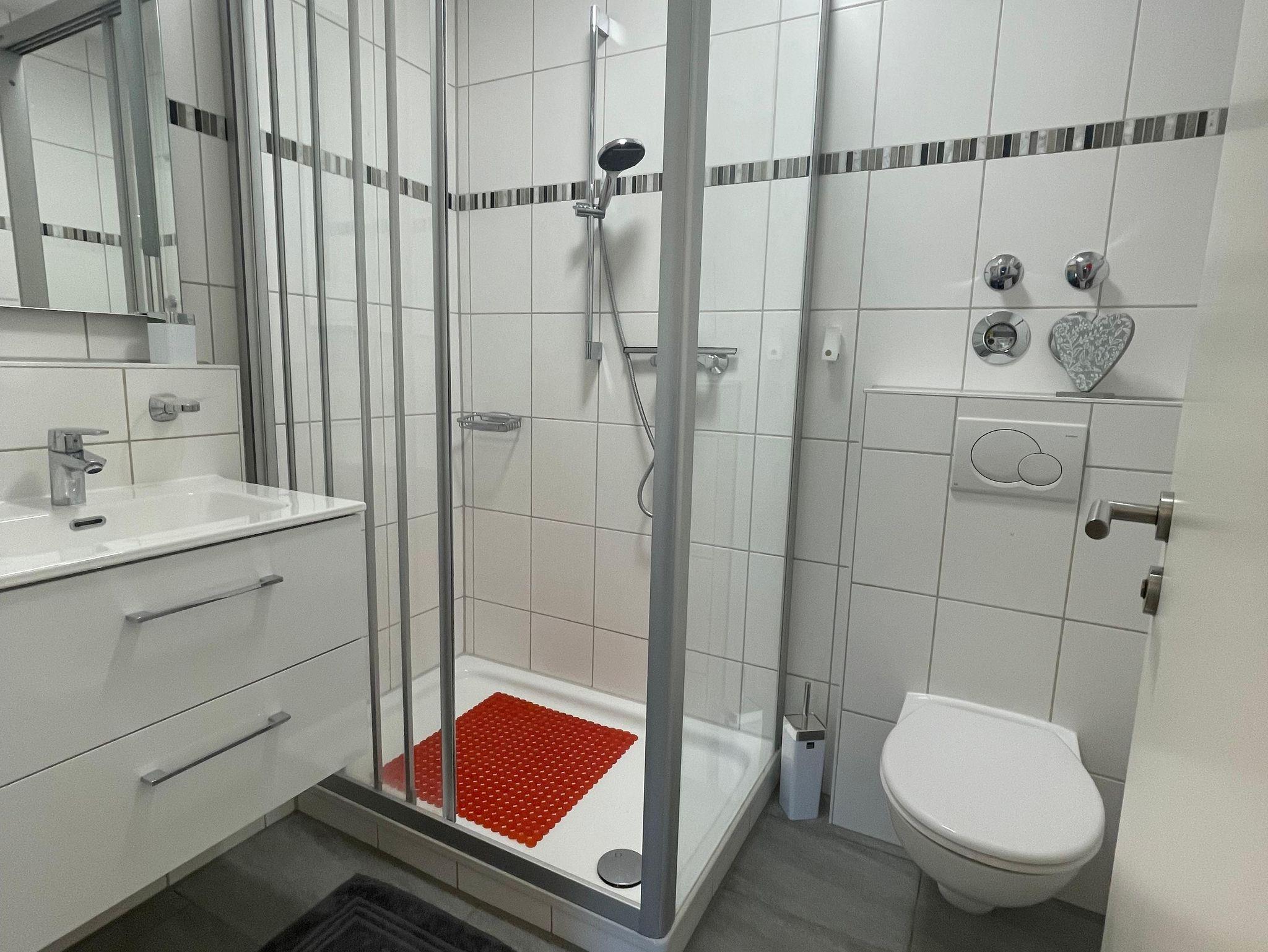 Das **moderne Badezimmer** ist hell gefliest und verfügt über eine geräumige Dusche, WC, Waschbecken sowie einen Handtuchheizkörper. Handtücher und Bettwäsche sind selbstverständlich vorhanden.
