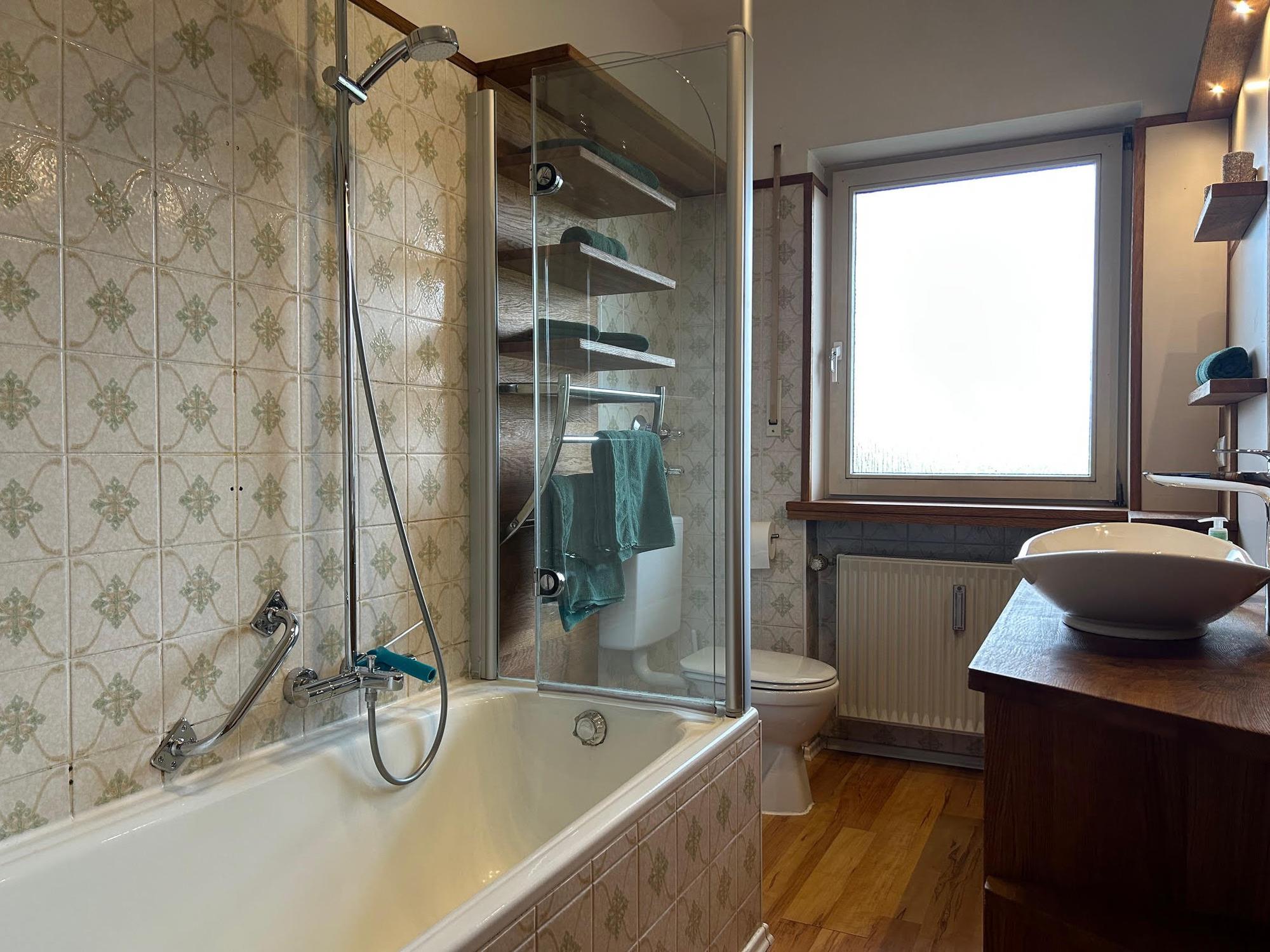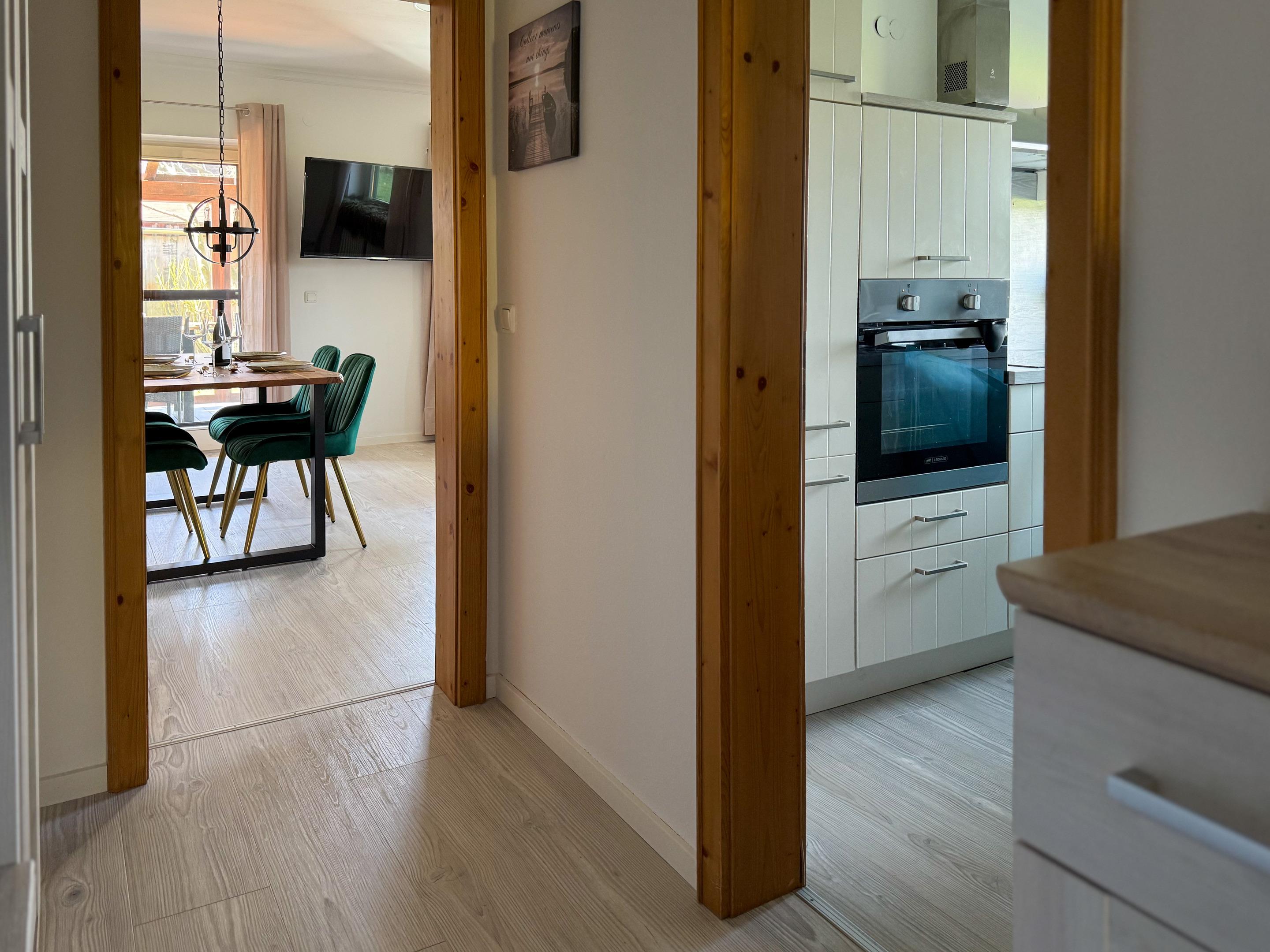 Es erwartet Sie ein Schlafzimmer mit King-Size-Bett (200 x 160), ein großer Wandschrank sowie hochwertige Bettwäsche. Das Badezimmer ist mit Badewanne, Duschwand, Toilette, Fön und Handtüchern ausgestattet. Die voll ausgestattete Küche verfügt über Herd, Ofen, Kühlschrank, Spülmaschine, Filterkaffeemaschine und Wasserkocher – ideal für alle, die gerne selbst kochen. Zusätzlich steht ein Parkplatz, ein abschließbares Gartenhaus für Ski und Fahrräder sowie Waschmaschine und Wäscheständer im Keller zur Verfügung.