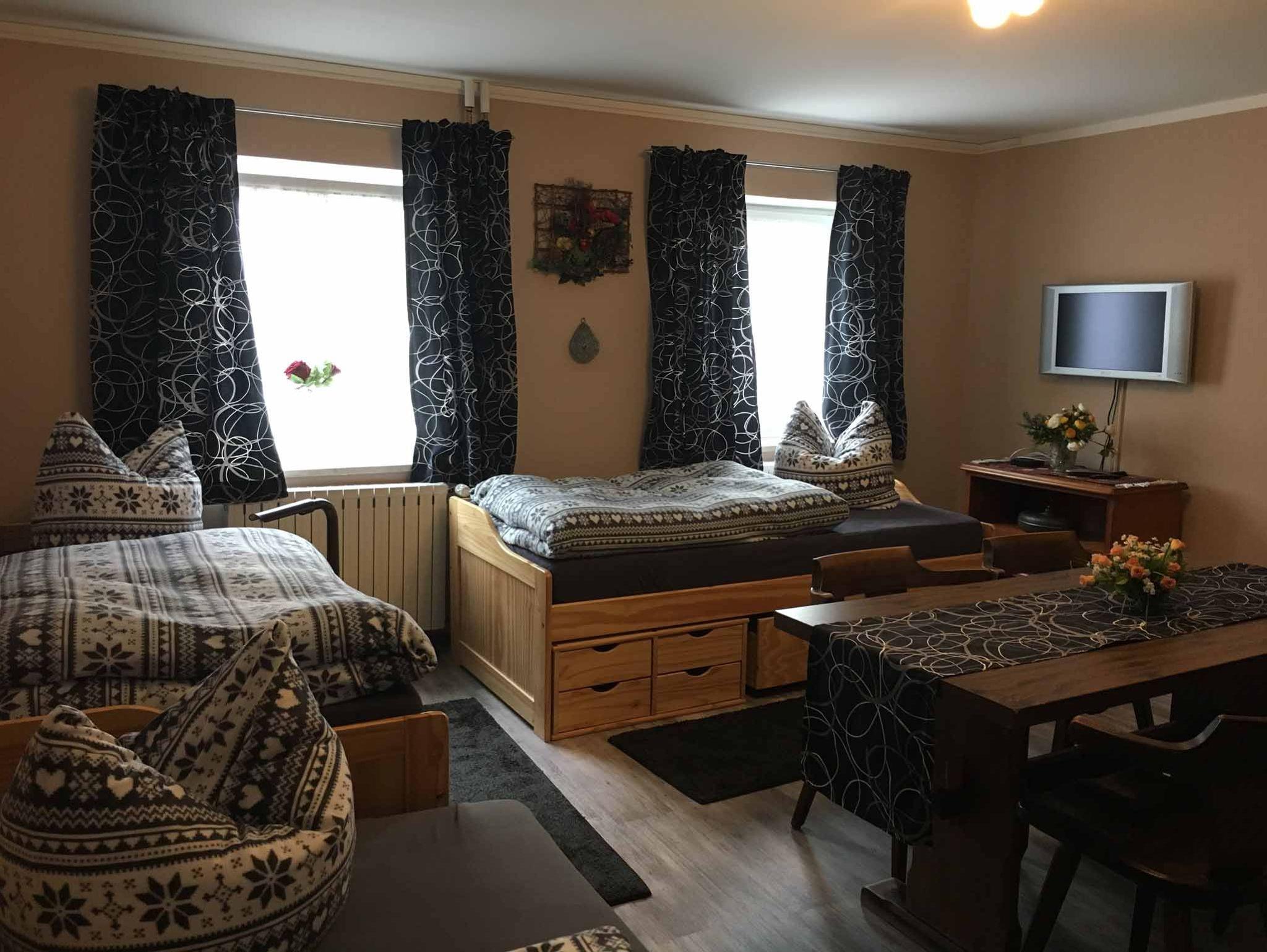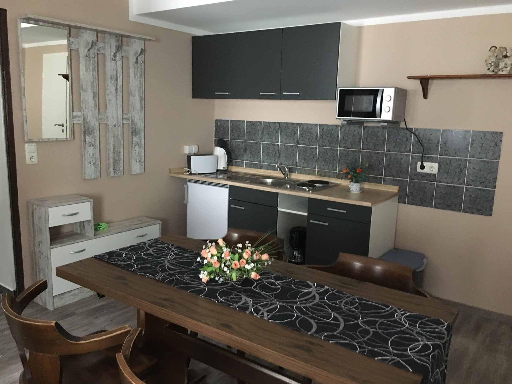 Das Appartement bietet auf 26qm Wohnfläche Platz für bis zu 3 Personen. Der kombinierte Wohn- und Schlafbereich mit zwei Einzelbetten und zusätzlicher Schlafcouch lädt zum Verweilen ein. Die kleine Küchenzeile mit Herdplatten, Kaffeemaschine, Kühlschrank, Toaster und Mikrowelle lässt keine Wünsche offen. Das Badezimmer mit Dusche, WC und Fön rundet das Gesamtbild ab. Außerdem sind die Kosten für Endreinigung, Parkplatz und WLAN-Nutzung im Preis enthalten.