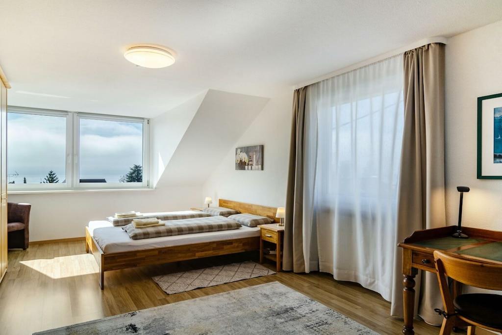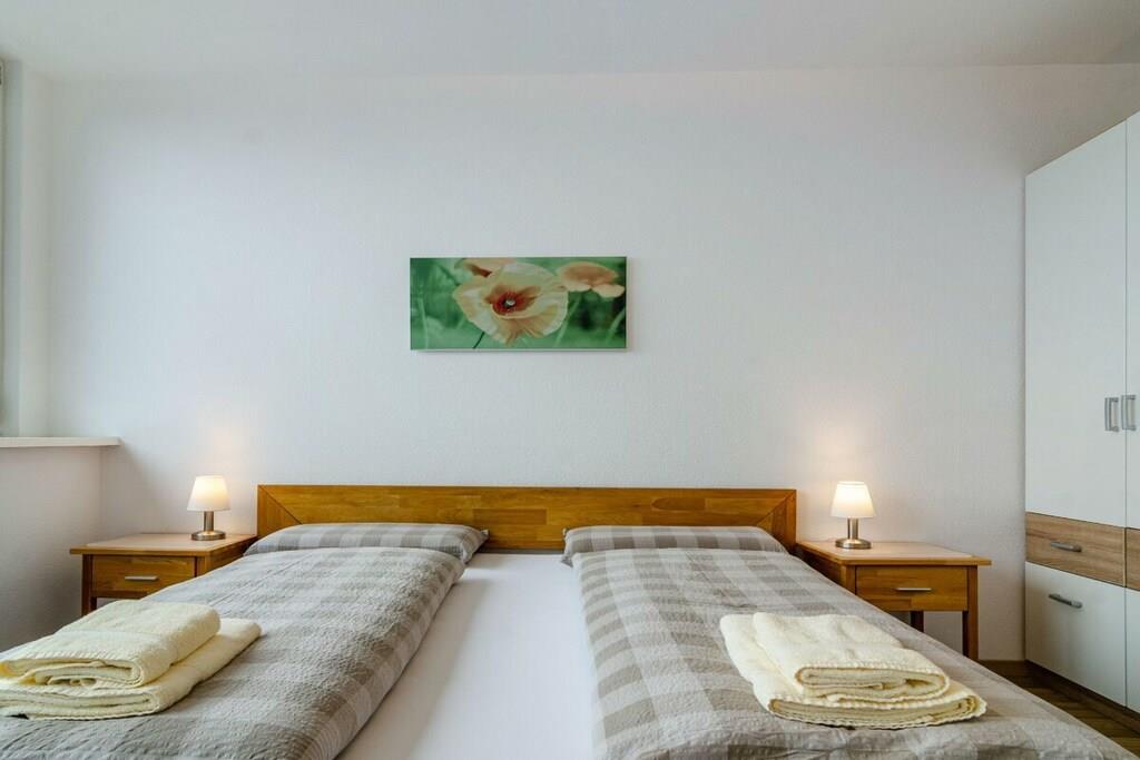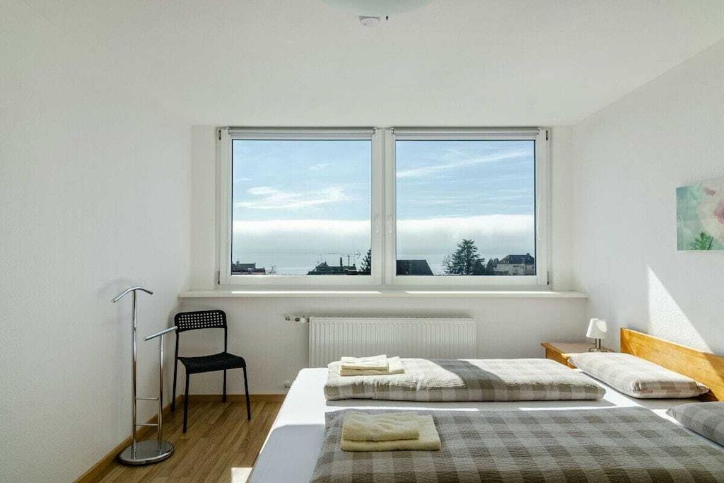 Lys og komfortabel ferielejlighed med søudsigt på første sal (øverste etage) med fantastisk udsigt over søen og bjergene samt en lille balkon. Stor stue og spisestue med integreret køkken. To separate soveværelser. Alt er inkluderet – medbring blot dine personlige ejendele og nyd din ferie. Ca. 80 m², 2 separate soveværelser med dobbeltsenge (180x200 cm), ekstra sovesofa i soveværelset (120x200 cm), stor stue og spisestue med fuldt udstyret køkken, badeværelse med bruser og toilet, lille balkon, aircondition, mørklægningsgardiner, elektriske persienner, fantastisk udsigt over søen og bjergene, separat indgang.
