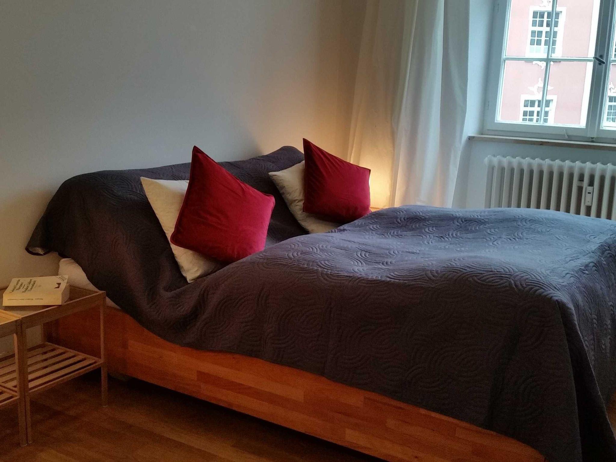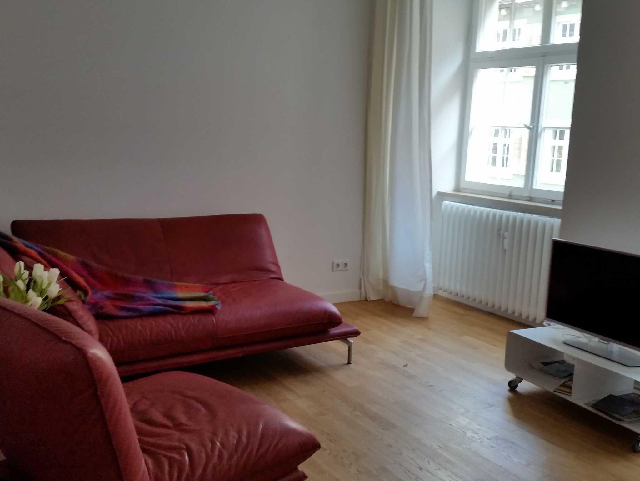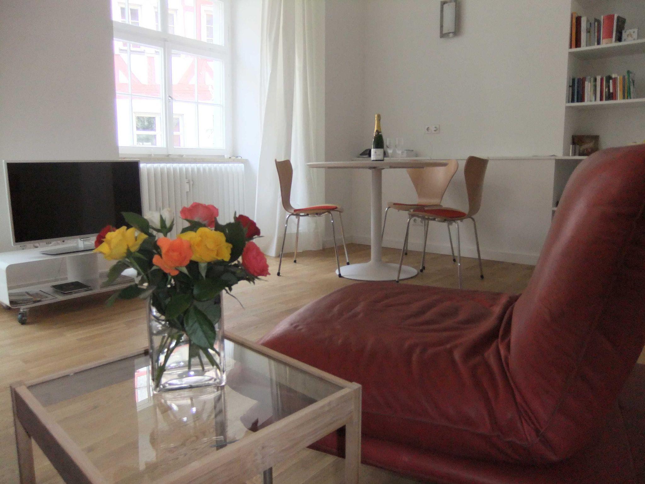 Die Wohnung ist modern und sehr geschmackvoll ausgestattet. Essecke mit Platz für vier. Sitzgarnitur aus Leder, kleine separate Küche, WC/Dusche und geräumiges Schlafzimmer mit 1,60 m breitem Bett. Kostenloses W-Lan, Kabel-TV, Blick auf Schloss und Schlossplatz sowie auf die historische Fachwerkhäuser. Sehr hohe Decken, hochwertiger Eichenholzparkettboden in Wohn- und Schlafraum sowie im Flur.