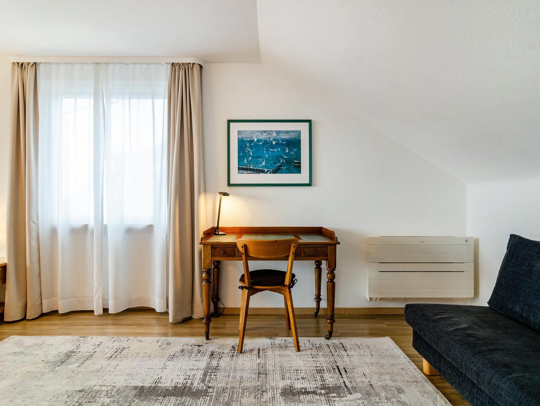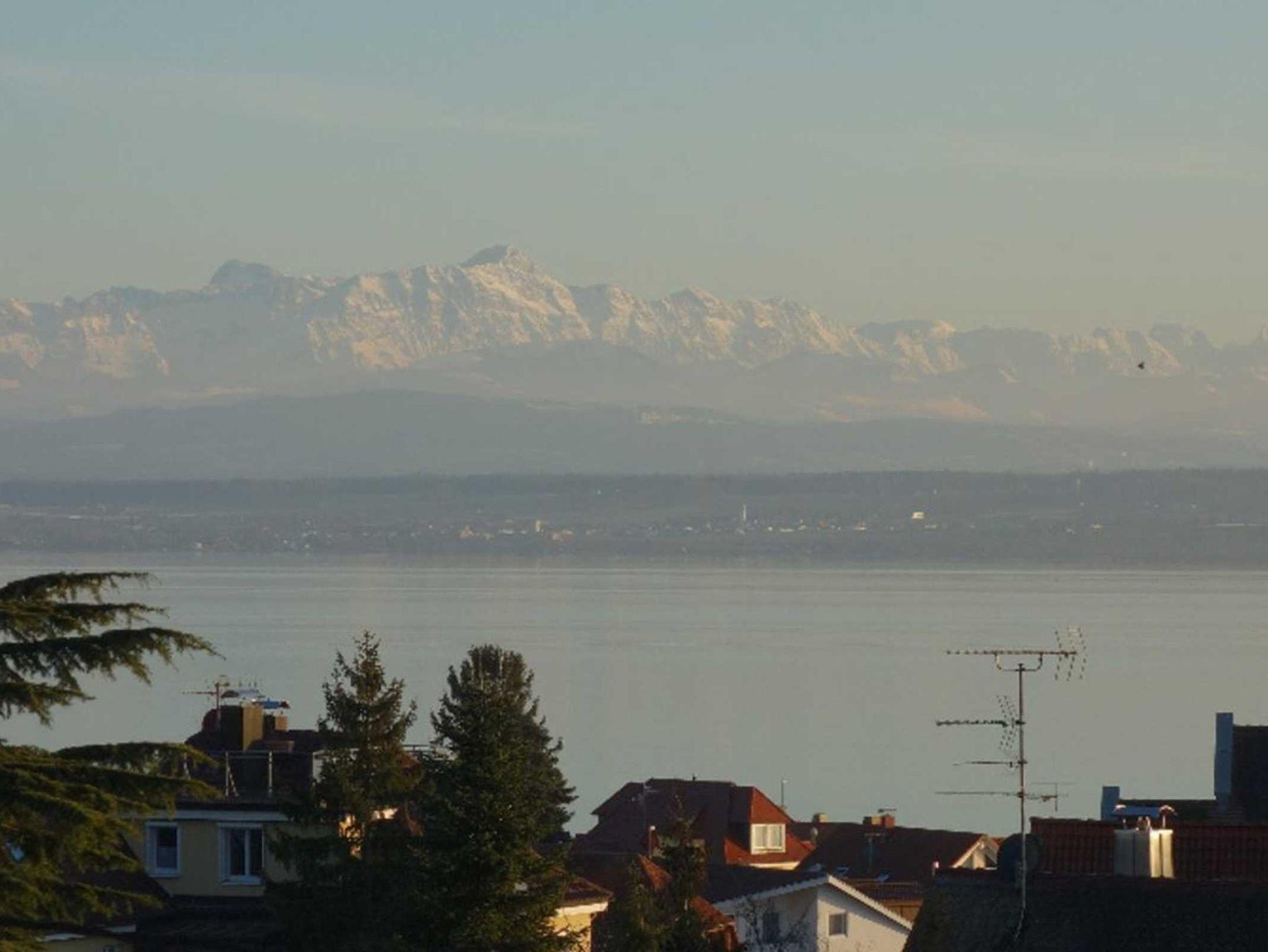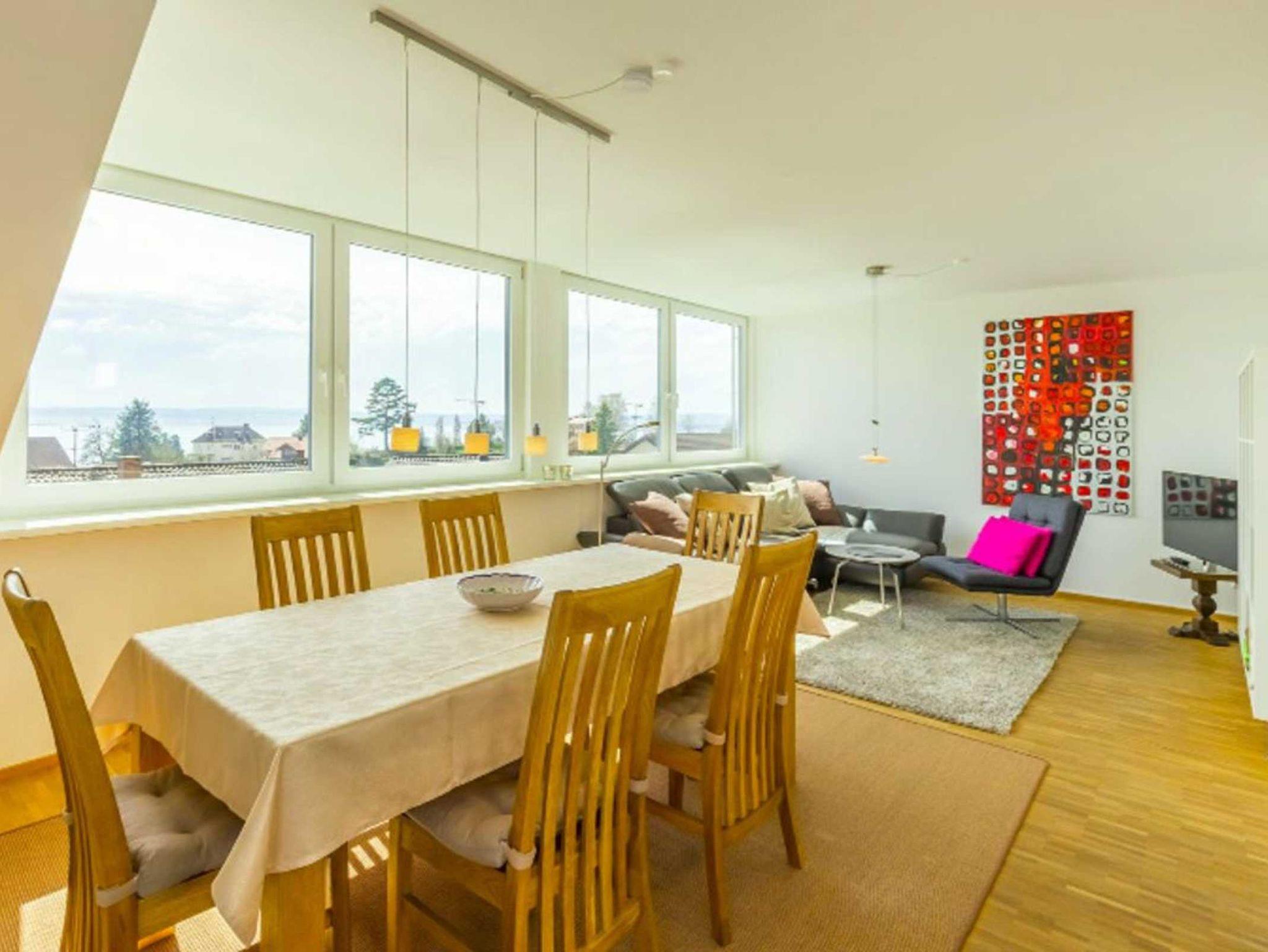 Hochwertige und helle Ferienwohnung im 1. Stock mit herrlichem See- und Alpenblick und kleinem Balkon. Großes Wohn- und Esszimmer mit integrierter Wohnküche, ein großes Schlafzimmer und ein kleines Schlafzimmer, Bad mit Dusche und WC.