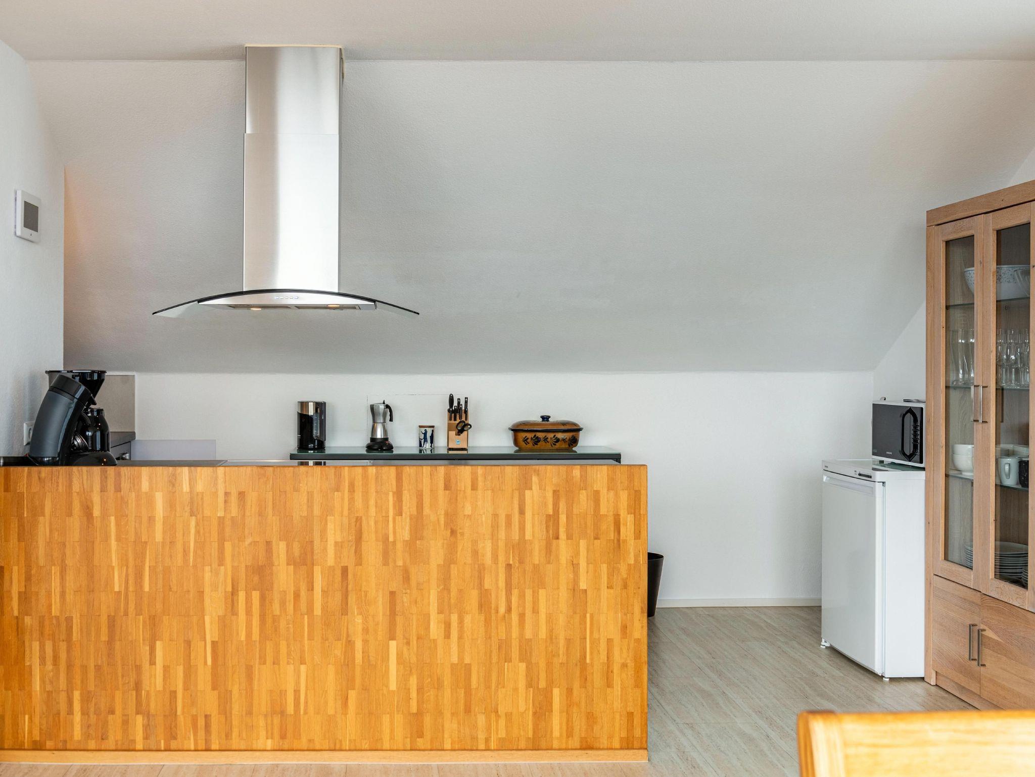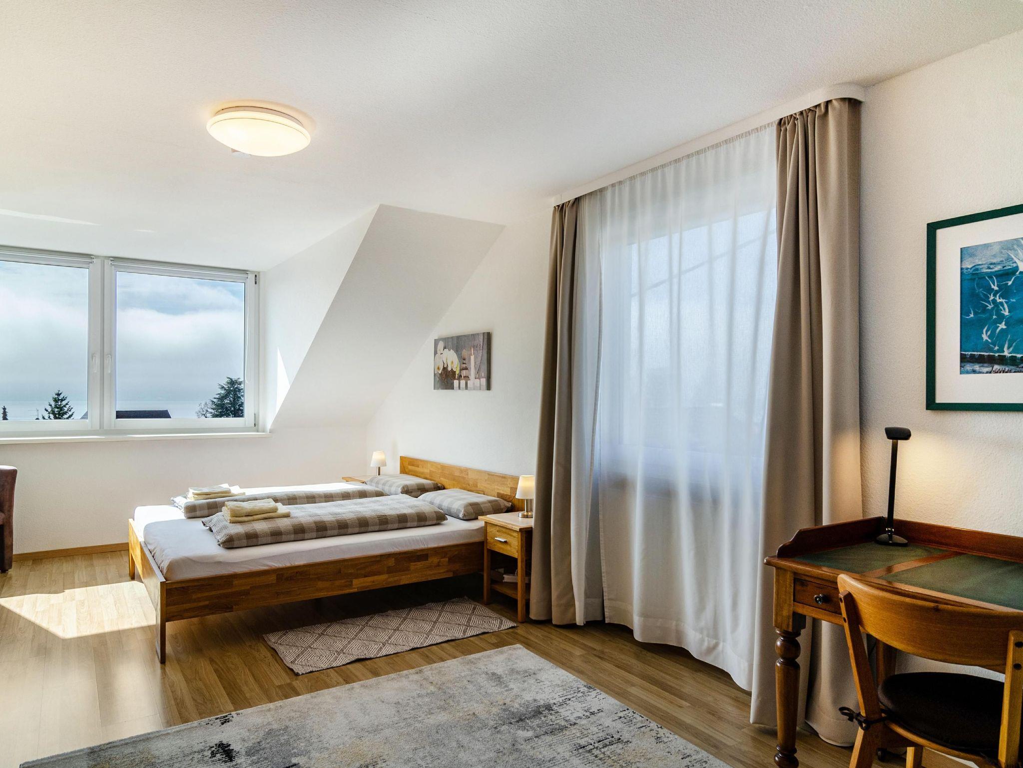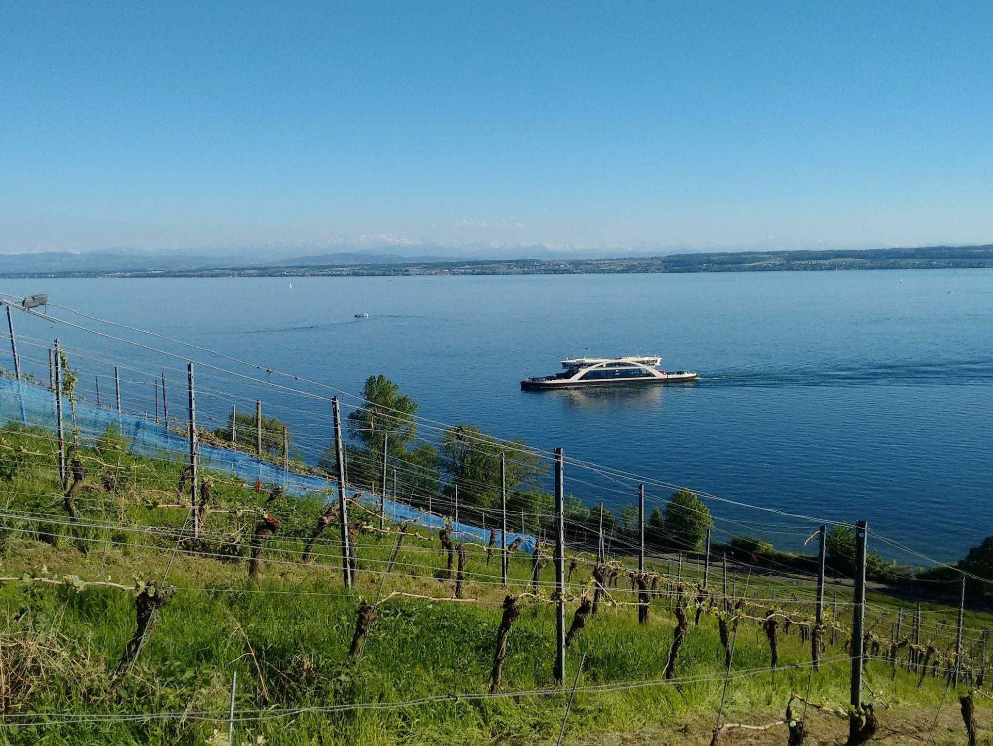Hochwertige und helle Ferienwohnung im 1. Stock mit herrlichem See- und Alpenblick und kleinem Balkon. Großes Wohn- und Esszimmer mit integrierter Wohnküche, ein großes Schlafzimmer und ein kleines Schlafzimmer, Bad mit Dusche und WC.