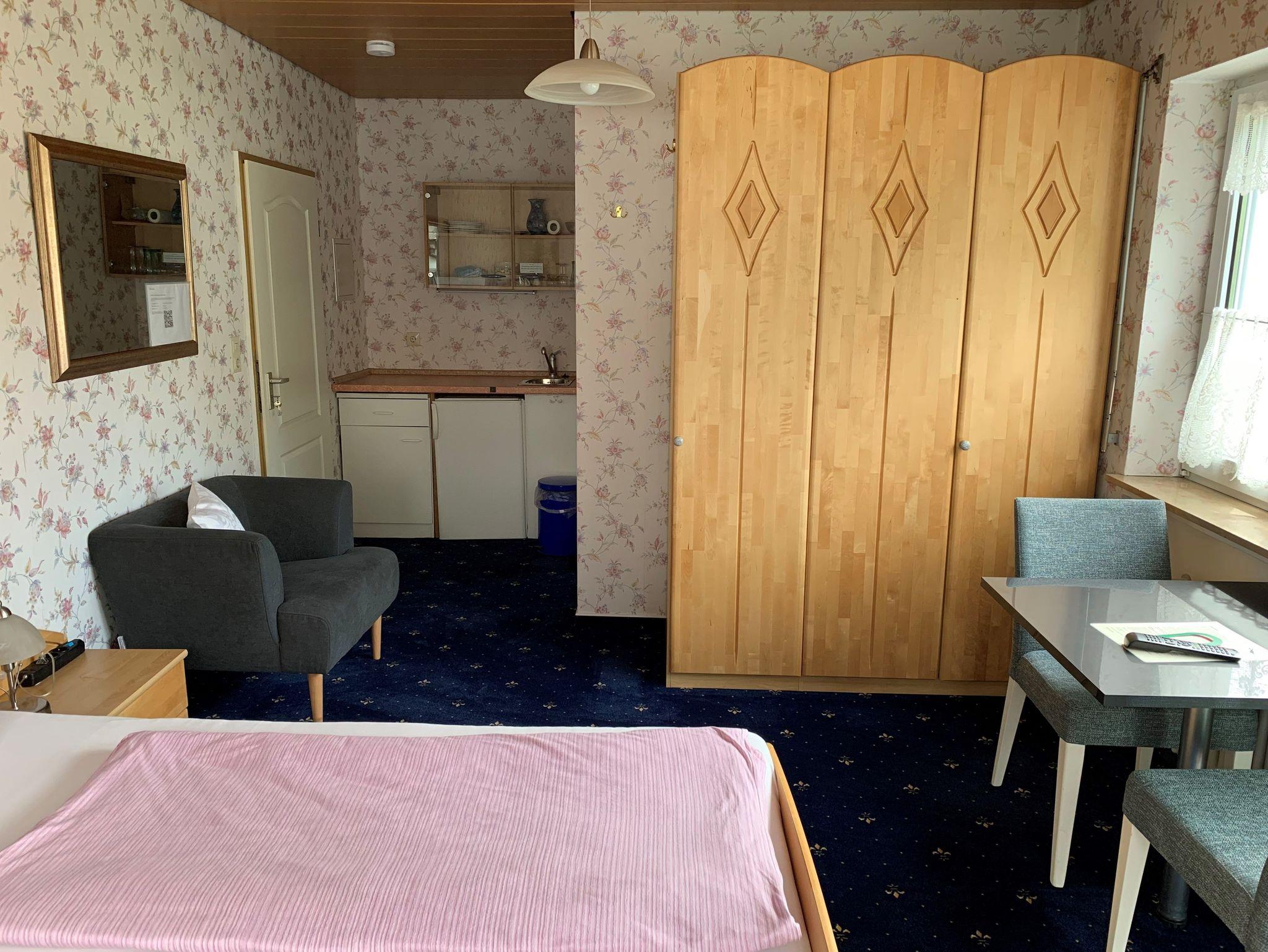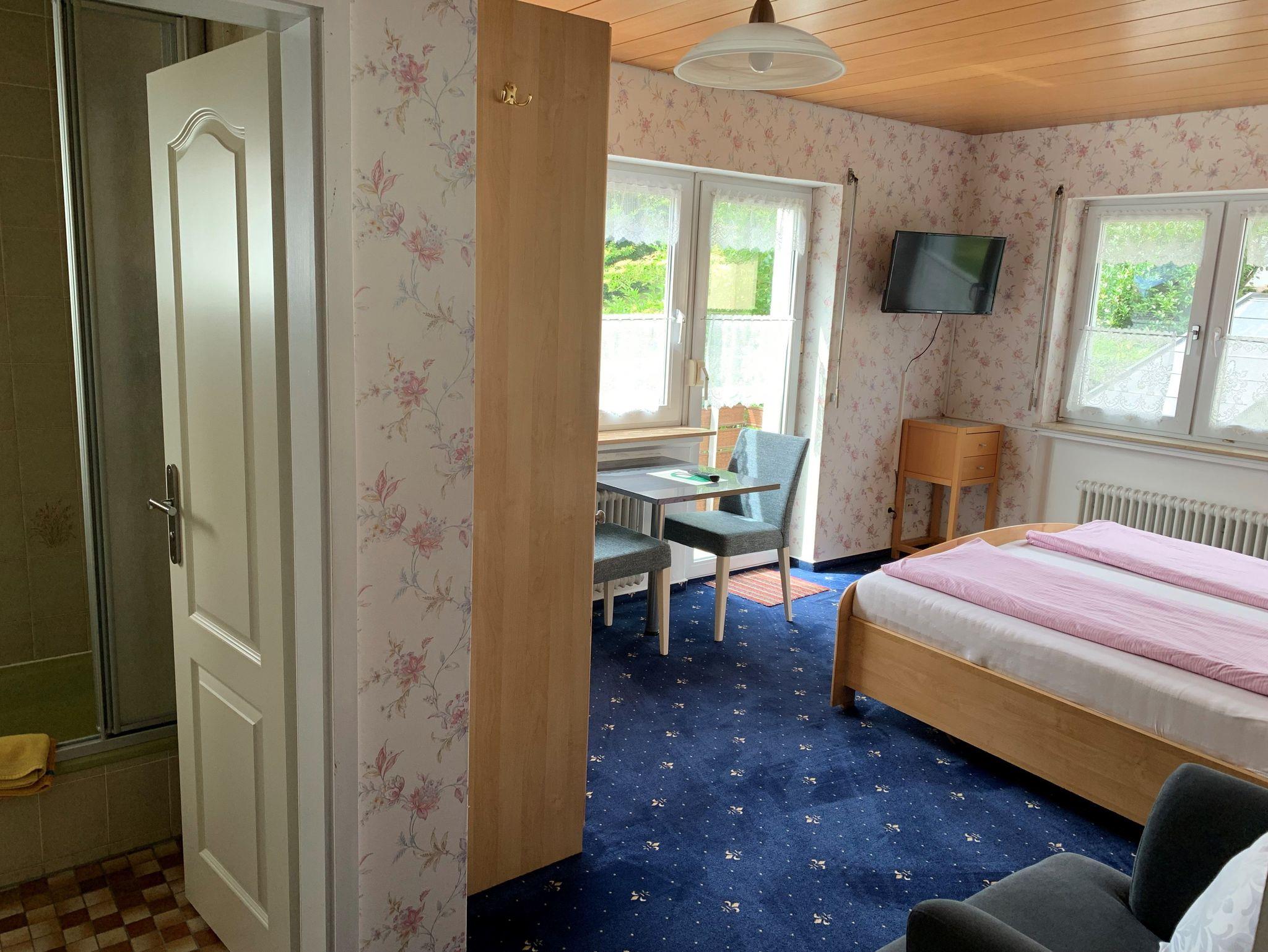 Größeres Doppelzimmer (Nr. 6) in West-Nordlage mit Du/WC, TV, Safe, Kühlschrank, Geschirrschrank, Kaffeemaschine, Wlan, Balkon in Westlage. Das Zimmer befindet sich im 2. Stock.