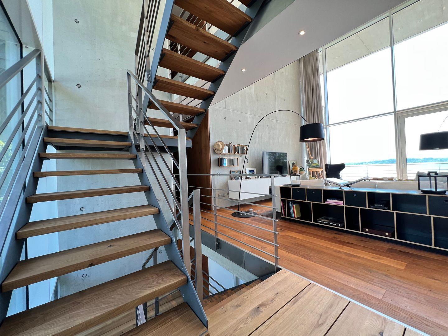 Das hochwertige Luxusferienhaus bietet im Erdgeschoss ein Schlafzimmer mit Doppelbett (160x200cm), ein Badezimmer mit Badewanne, ein zusätzliches Gäste-WC, einen Ruheraum mit Teeküche, einen Büro-Raum sowie einen offenen Wohnbereich. Sie Die offen gestaltete Holz-Treppe führt Sie in das Obergeschoss, wo sich zwei weitere Schlafzimmer (180x200 cm und 160x200 cm) mit zwei Badezimmern (Dusche, WC und Waschtisch), ein weiterer Ruheraum, ein Wäscheraum (Miele Waschmaschine und Trockner) sowie das Master-Schlafzimmer befinden.