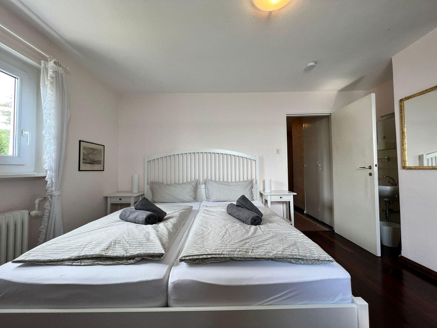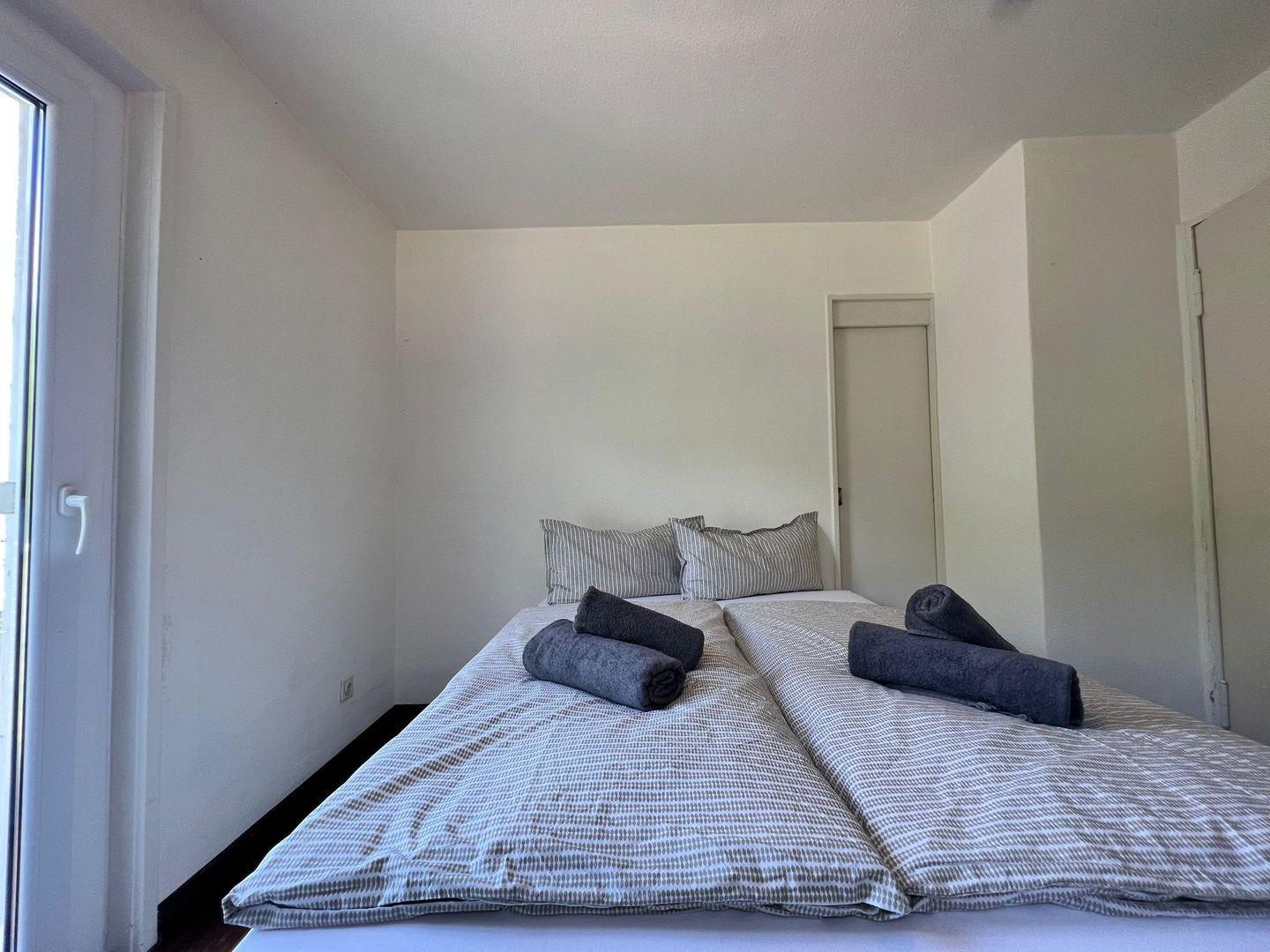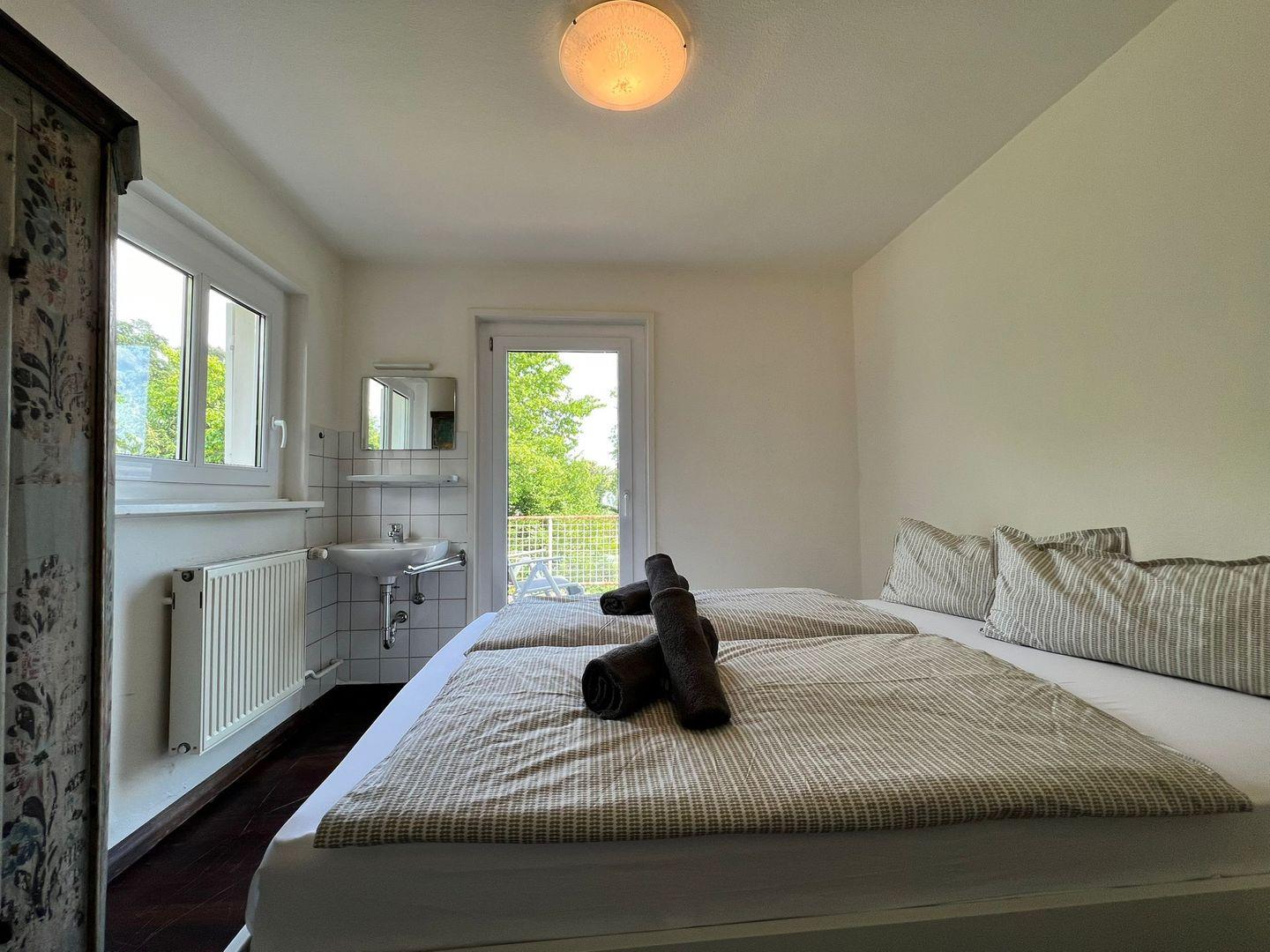 Im Obergeschoss des Anwesens finden Sie ein Schlafzimmer mit einem Doppelbett (180x200 cm) sowie drei weitere Schlafzimmer mit Doppelbetten (160x200 cm). Drei der Schlafzimmer verfügen über eigene Waschbecken. Das Obergeschoss beherbergt ein Badezimmer mit Duschwanne und zwei Waschbecken. Im Ferienhaus stehen insgesamt zwei separate WC zur Verfügung.