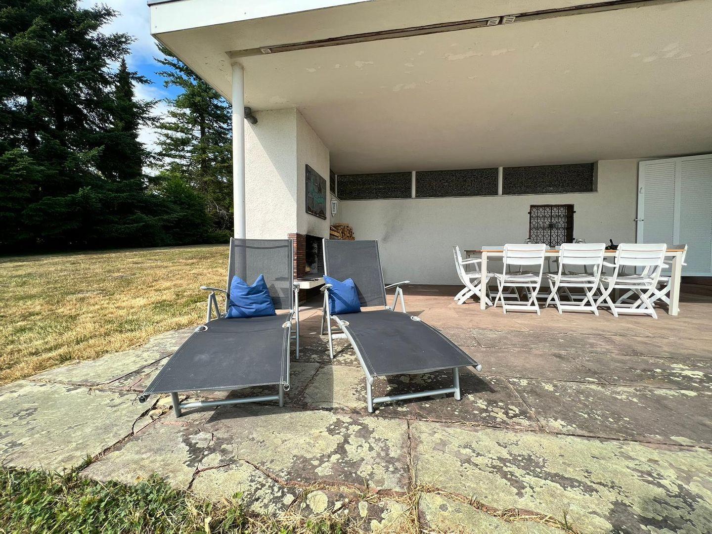 Im Erdgeschoss lädt ein großzügiges Wohnzimmer mit Kamin, komfortabler Wohnlandschaft und TV zu gemütlichen Stunden ein. Das separate Esszimmer bietet Platz für bis zu 8 Personen. Vom Erdgeschoss gelangen Sie auf die großzügige Terrasse mit Essplatz für 8 Personen, bequemen Gartenliegen und einem Außen-Kamin. Ein Holzkohlegrill steht für gesellige Grillabende zur Verfügung. Die vollausgestattete Küche mit Kühlschrank, Herd, Backofen, Kaffeevollautomat, Spülmaschine und Waschmaschine lässt keine Wünsche offen.