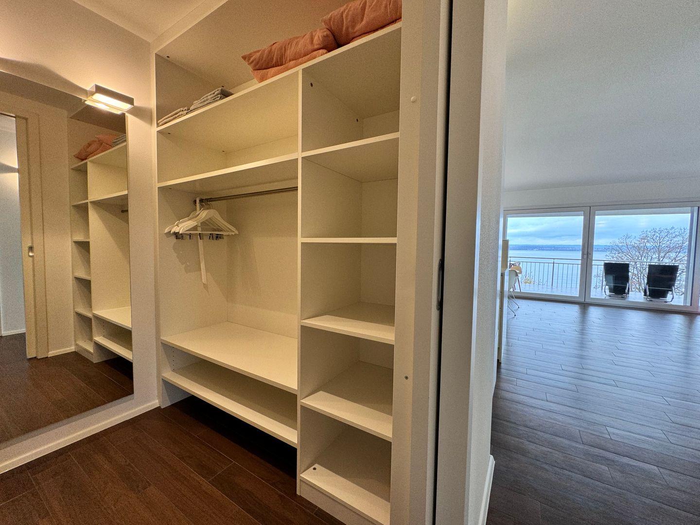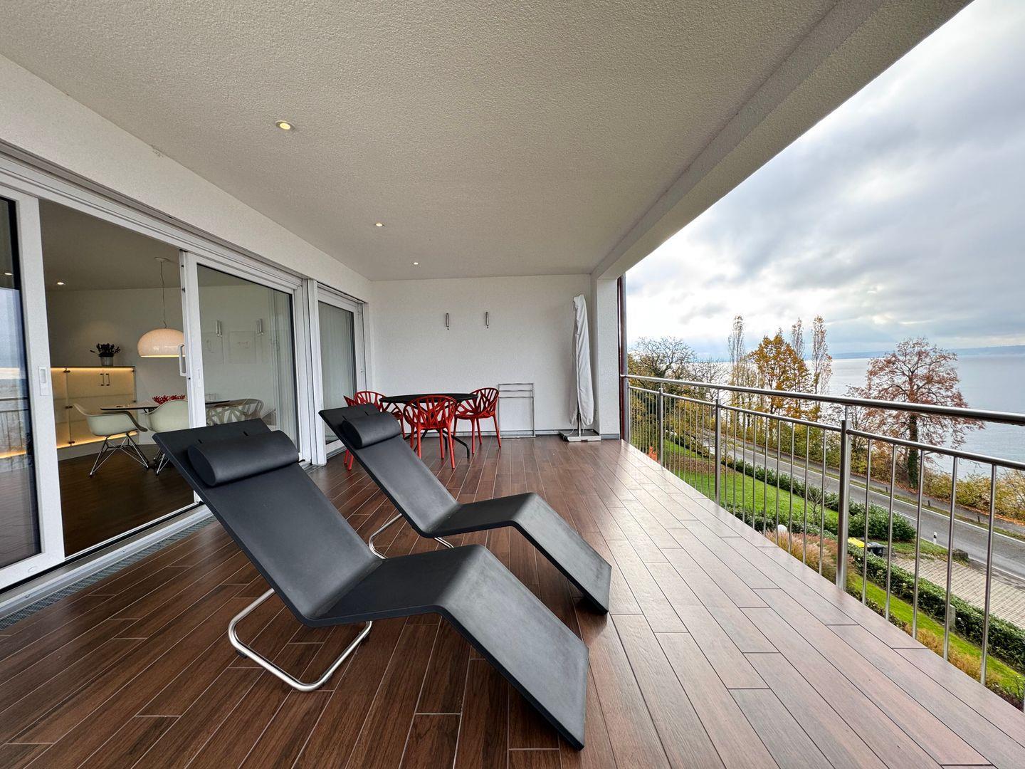 Zu den besonderen Highlights gehört der überdachte und geschlossene Balkon (25 m²), der einen außergewöhnlich guten Seeblick, Gartenblick sowie Ausblicke auf die umgebende Landschaft bietet. Hier finden Sie Gartenmöbel und Sonnenliegen für entspannte Stunden im Freien. Durch die ländliche Lage im Dorf profitieren Sie von einer ruhigen Umgebung und sind gleichzeitig nur 400 Meter vom Bodenseestrand entfernt. Restaurants und das Stadtzentrum erreichen Sie nach einem kurzen Spaziergang von 500 Metern, Einkaufsmöglichkeiten sind in etwa 2 km Entfernung verfügbar. Die hervorragende Anbindung an die öffentlichen Verkehrsmittel (30 m entfernt) und die Nähe zur Fähre (500 m) machen die Unterkunft besonders attraktiv für Reisende, die flexibel bleiben möchten. Auch ein Privatparkplatz direkt am Haus steht zur Verfügung.