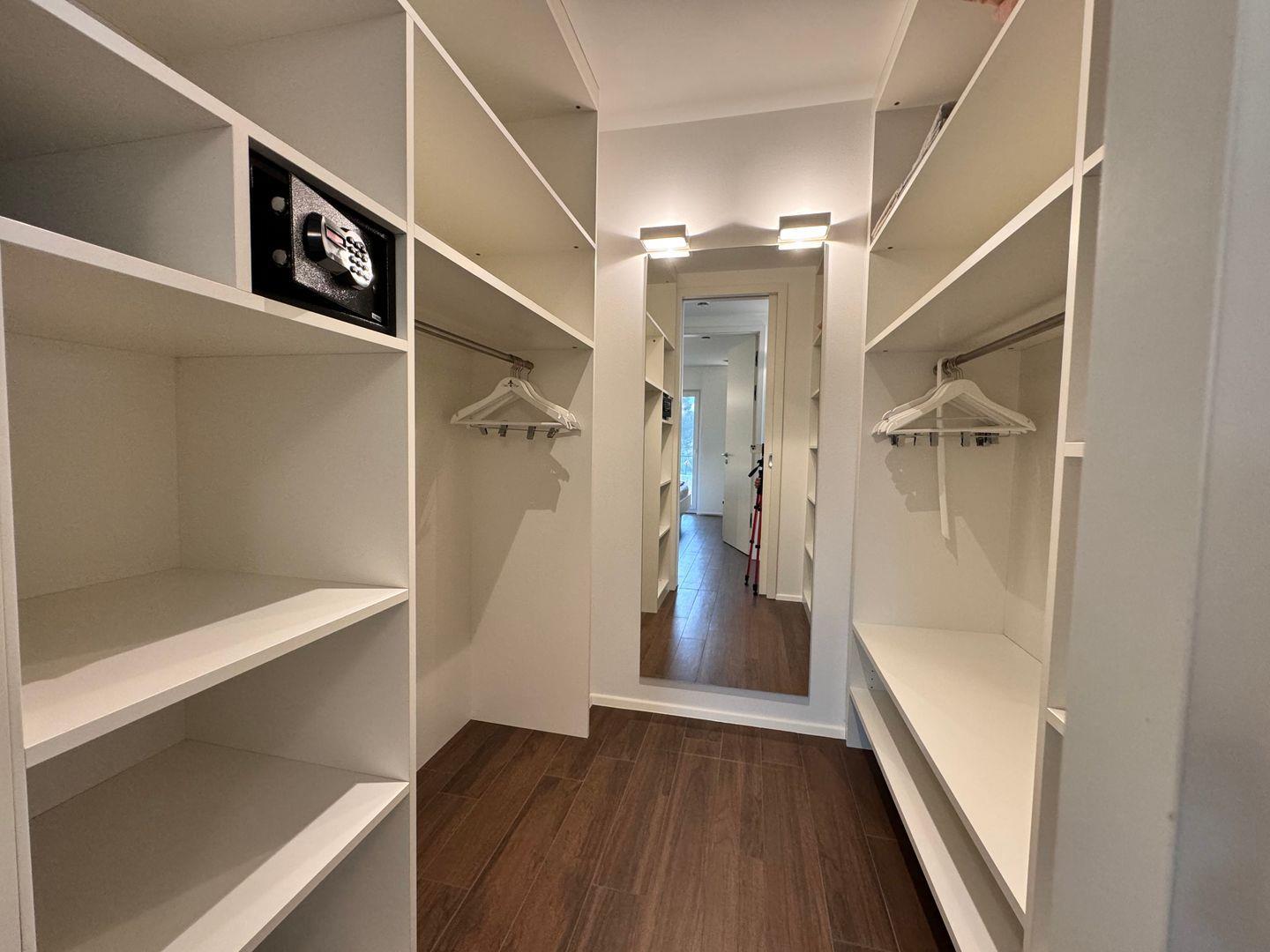 Das Badezimmer bietet moderne Sanitäranlagen, darunter eine bodengleiche Dusche, Waschbecken, Kosmetikspiegel und Haartrockner. Zusätzlich befindet sich ein separates Gäste-WC im Apartment. Zur Ausstattung zählen außerdem ein Ganzkörperspiegel sowie umfassende Verdunkelungsmöglichkeiten und Sichtschutz an allen Fenstern. Waschmaschine und Trockner können gemeinschaftlich genutzt werden.