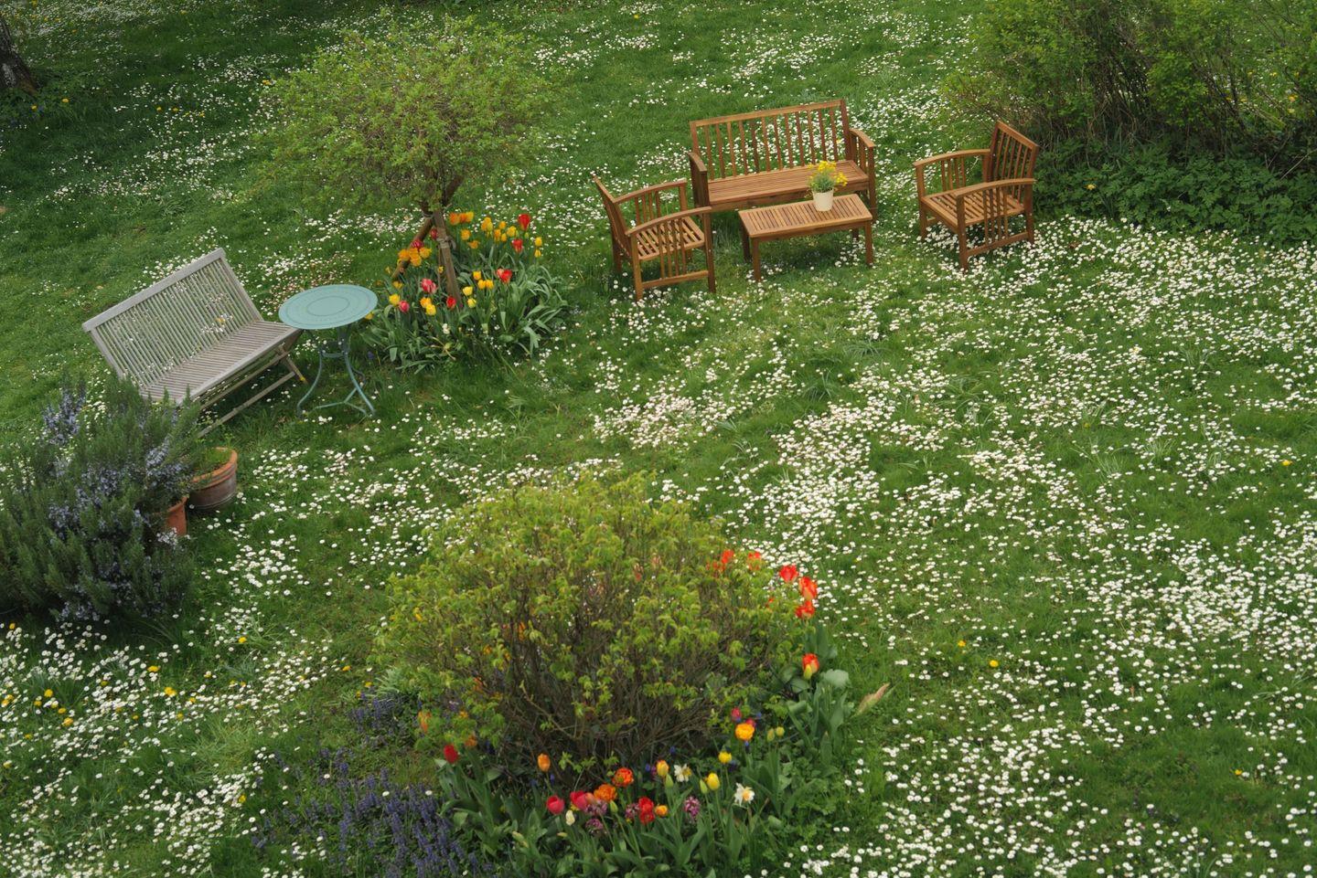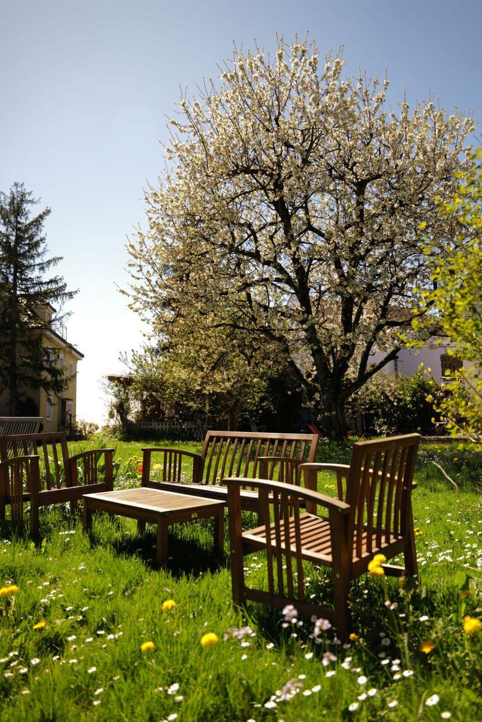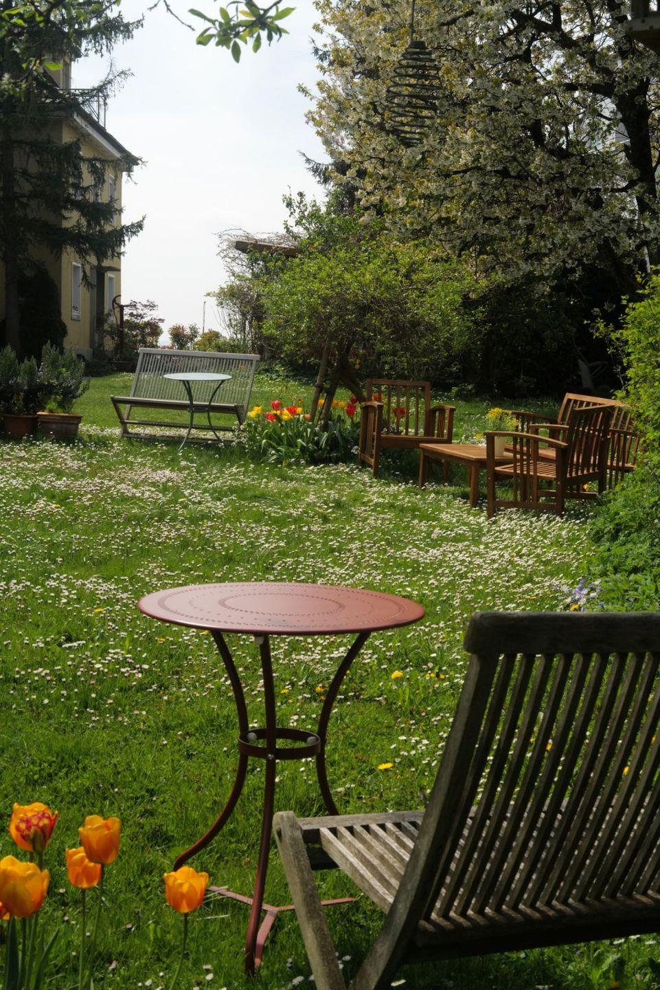 Zur Ferienwohnung gehört ein großzügiges Grundstück mit liebevoll angelegtem Gästegarten, der den Gästen zur Mitnutzung zur Verfügung steht. Mehrere Sitzmöglichkeiten, viel Grün und eine ruhige Umgebung machen den Garten zu einem besonderen Rückzugsort.