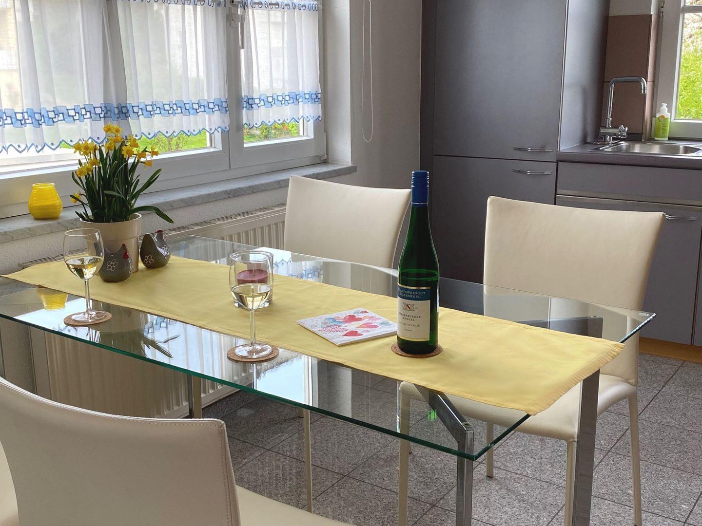 Die voll ausgestattete Einbauküche mit angrenzendem Essbereich eignet sich ideal für die Selbstversorgung im Urlaub. Der Wohnbereich bietet direkten Zugang zum Balkon, der mit Blick ins Grüne und Richtung Bodensee zu entspannten Stunden im Freien einlädt. Ein modernes Badezimmer sowie ein separates Gäste-WC erhöhen den Wohnkomfort zusätzlich.