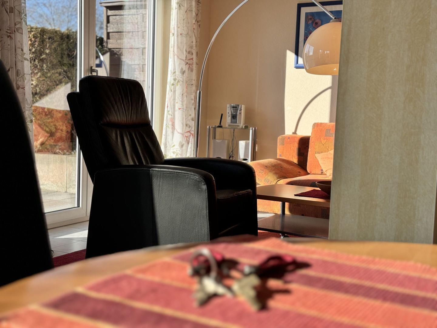 Das helle und einladende Wohnzimmer ist mit einer Schlafcouch ausgestattet, die einer dritten Person ausreichend Platz bietet. Durch die liebevolle Gestaltung eignet sich die Wohnung besonders gut für Paare oder kleine Familien.
