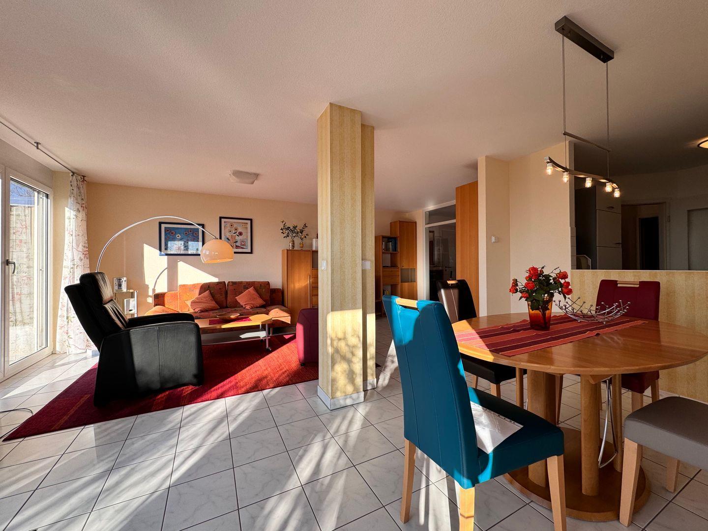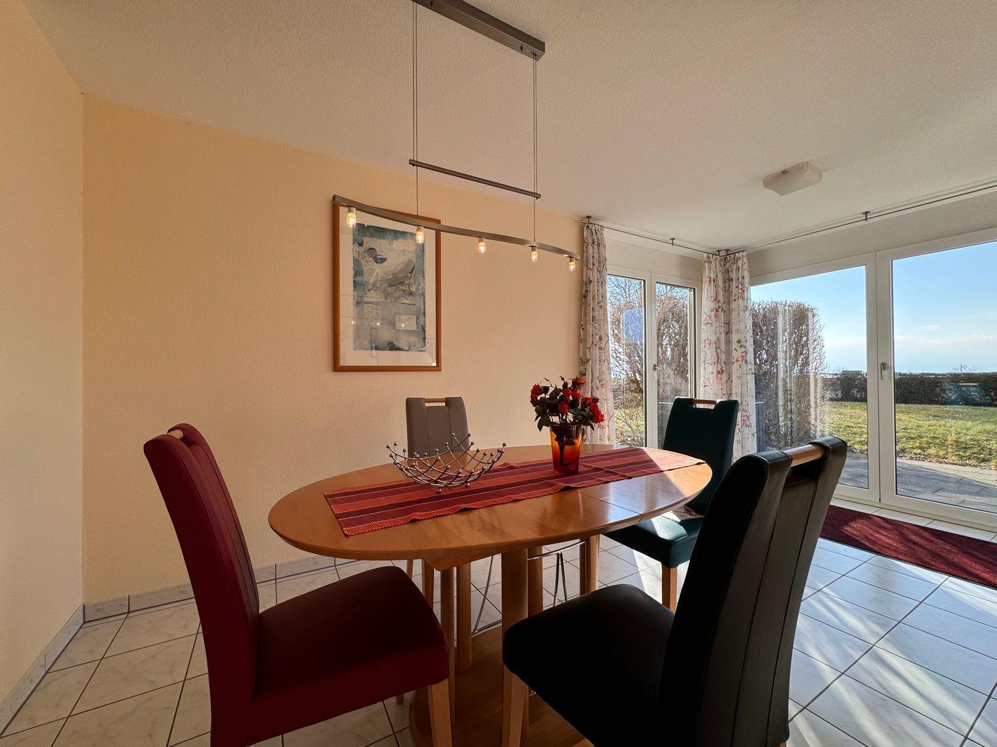 Unsere 76 Quadratmeter große Ferienwohnung bietet Platz für bis zu drei Personen, ein Schlafzimmer, ein Badezimmer mit Dusche und Badewanne, eine voll ausgestattete Küche, ein Wohnzimmer mit Schlafcouch, eine Terrasse mit Teilseeblick, einen Tiefgaragenstellplatz und eine gemeinschaftliche Liegewiese.