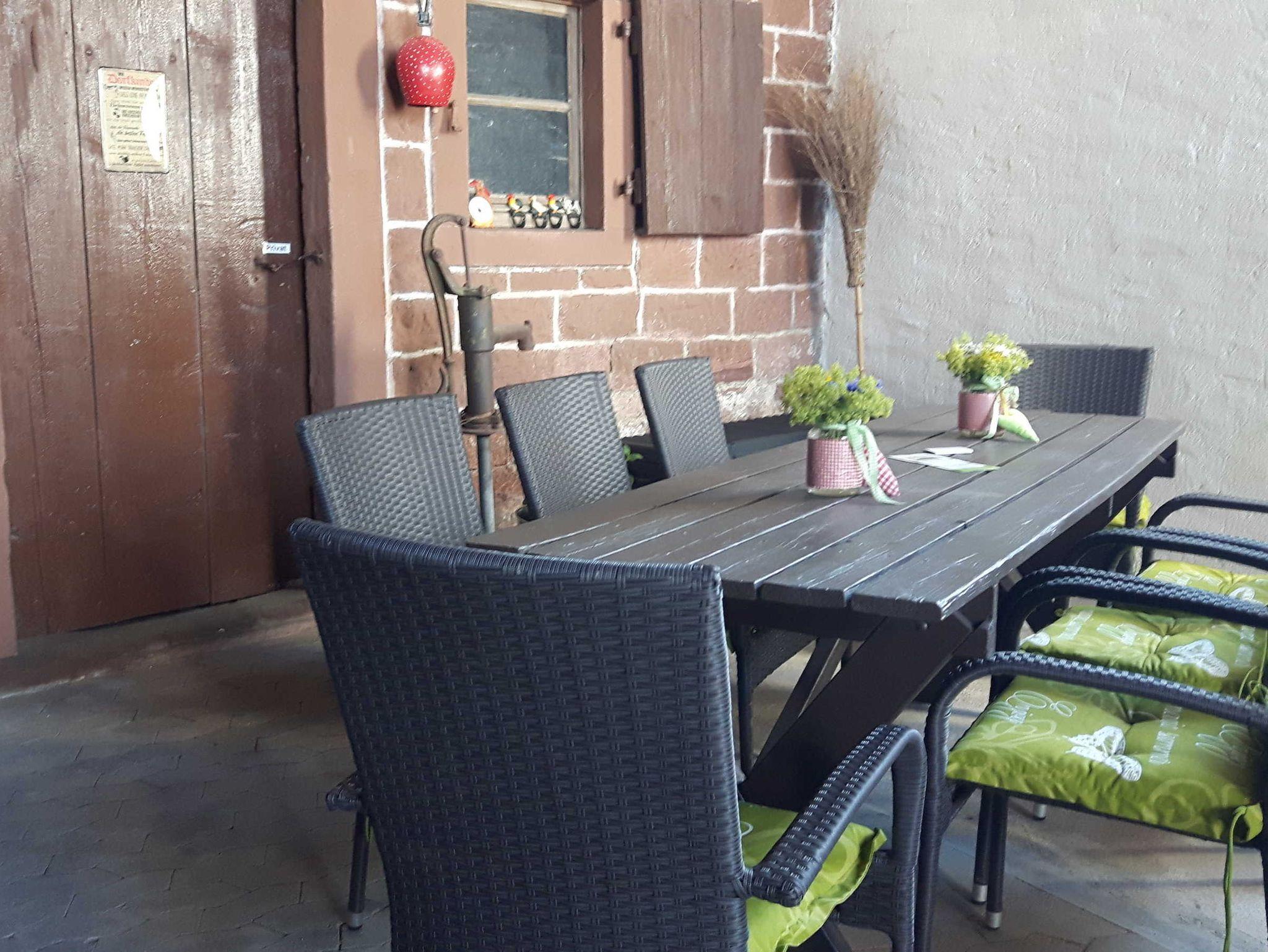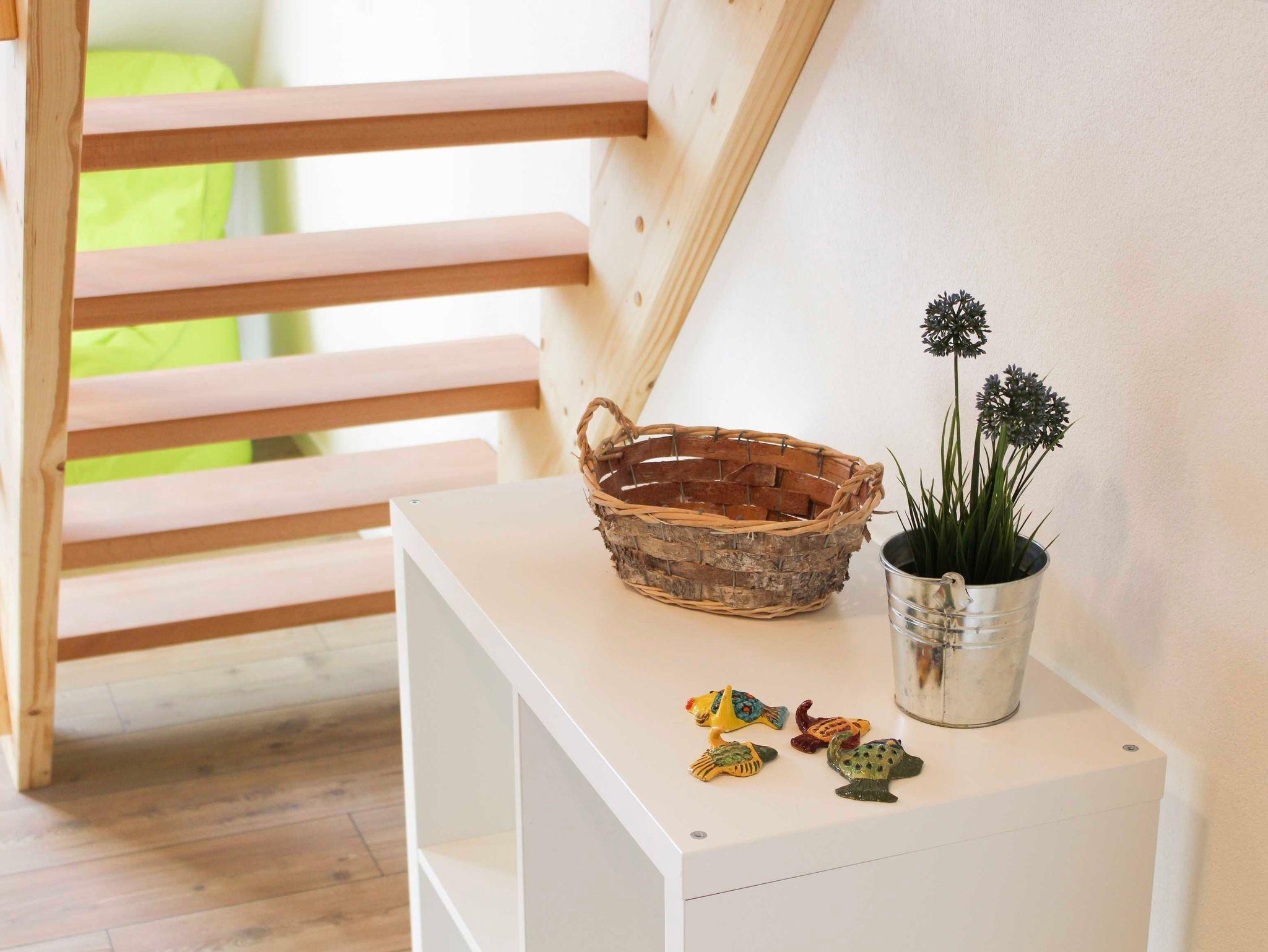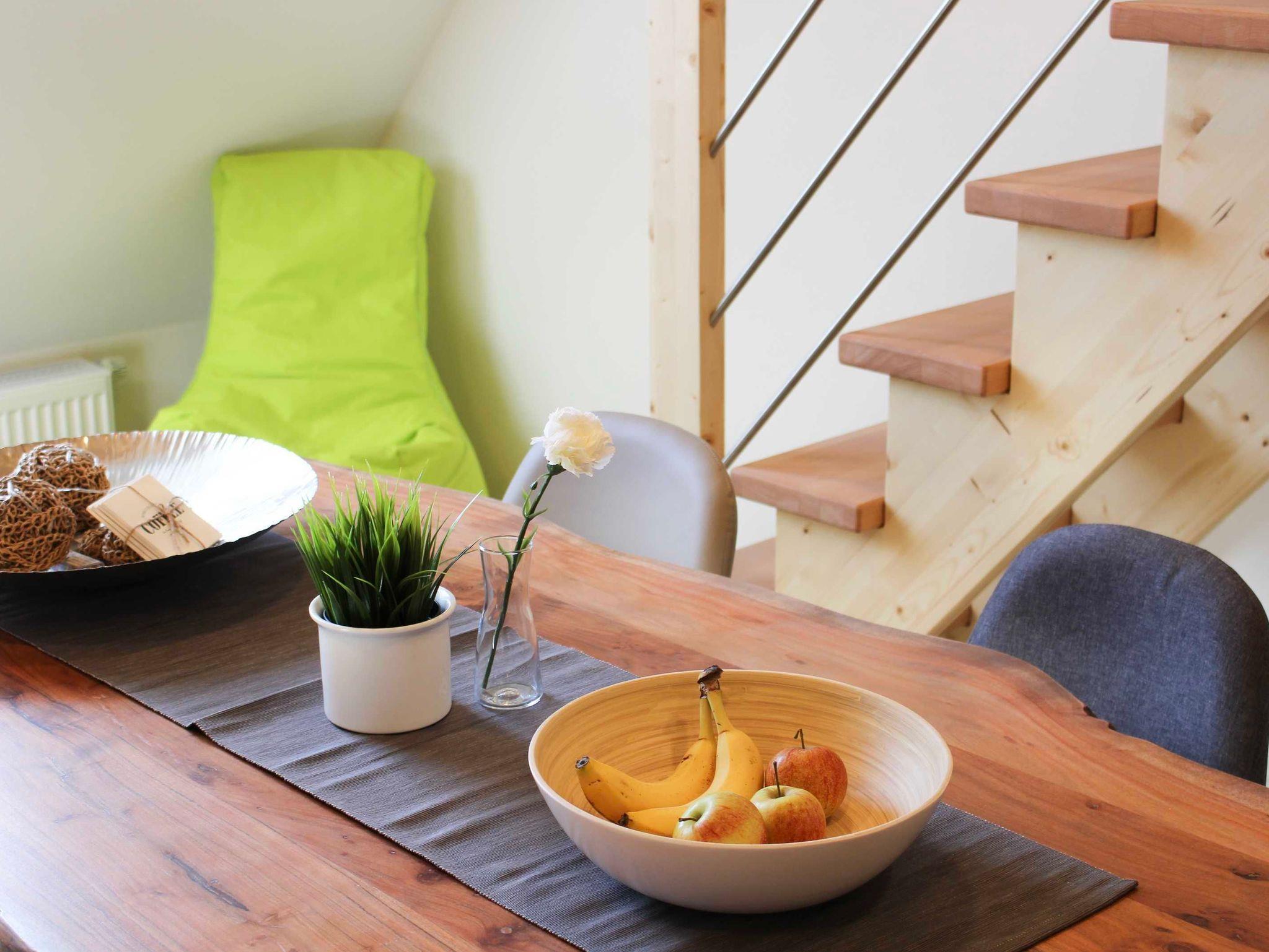 Ein Appartement für Familie und Freunde- nicht für Monteure. Als Maisonette über 2 Etagen auf runden 50 qm, verfügt es im unteren Bereich über einen großzügigen Ess- und Wohnbereich samt Badbereich und unter dem Dach über einen ungetrennten Schlafbereich für beispielswiese 2 Erwachsene und 2 Kinder oder 3 Erwachsene. Für Babys wegen der steilen Treppe nicht geeignet. Ein Flatscreen befindet sich an der Wand. Unsere Bettwäsche verfügt über Komfortgröße in den Maßen 1,55 x 2,20 m. Unsere Matratzen sind H2/H3 Qualität für unterschiedliche Gewichtsklassen. Der offene Küchen-, Ess- und Wohnbereich besticht durch sein modernes Ambiente. Ein großer Esstisch mit einer ausrechenden Anzahl an Stühlen lädt zum gemeinsamen Essen ein. Die offene Küche ist voll ausgestattet: Einbauküche mit Cerankochfeld & Backofen, Kühlschrank mit Tiefkühlfach, Spülmaschine, Kaffeepadmaschine, Wasserkocher, Toaster, Töpfe, Pfannen und Küchenutensilien, Geschirr & Besteck sowie Geschirrtücher. Eine moderne Sanitärausstattung befindet sich im Bad: Dusche mit niedrigem Einstieg, beleuchteter Spiegel und ein großes Fenster zum Lüften. Ausreichend Handtücher, Badetücher und ein Föhn stehen hier kostenfrei zur Verfügung. Ihre Kleidung können Sie in der Garderobe oder auf mehreren Kleiderständern mit Fächern verstauen. Im Innen- und Außenbereich verfügen wir über kostenfreies Wlan. Die kostenfreien Parkplätze befinden sich direkt im Hof. Eine ausreichende Anzahl an Sitzmöglichkeiten im teilweise überdachten und mit Pflanzen flankierten Außenbereich ist vorhanden. Eine Außentoilette ist diesem Bereich angegliedert. Waschmaschine und Trockner befinden sich in einem weiteren Funktionsraum. Sie können gerne gegen eine kleine Gebühr genutzt werden.