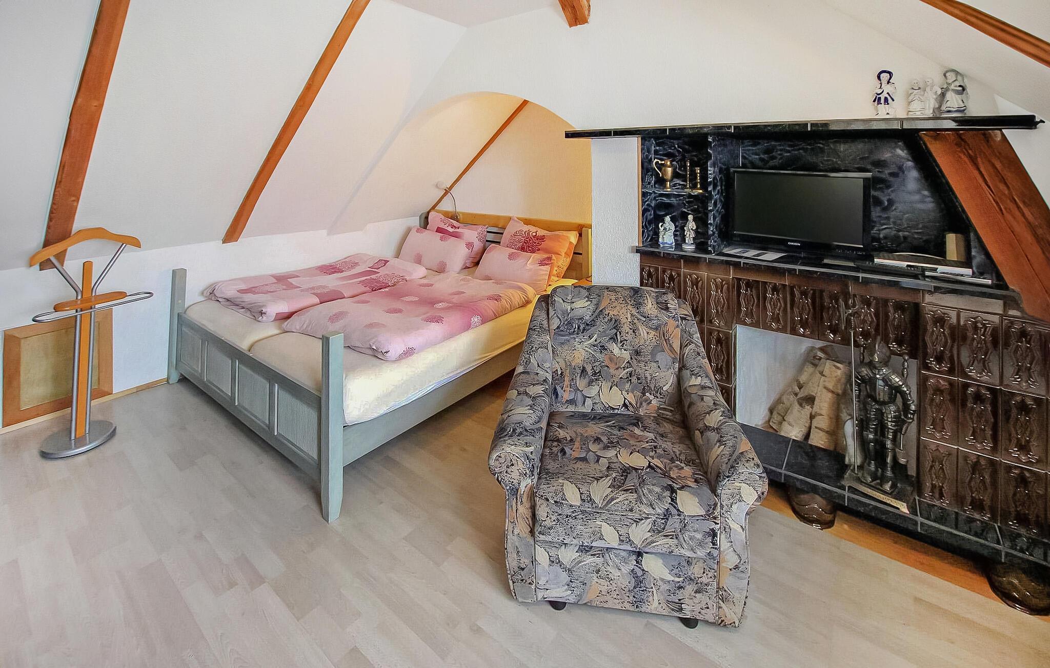 Roligt i udkanten af Meiersberg og kun ca 200 m fra skoven ligger den hyggelige ferielejlighed til op til 4 personer i et udhus på ejernes ca 2.000 kvadratmeter indhegnede boligejendom. Der ligger en restaurant kun få minutters gang derfra, og der er indkøbsmuligheder i Ueckermünde. Den cirka 45 kvadratmeter store ikke-ryger ferielejlighed med separat indgang er centralvarme, ligger på første sal og kan nås via en pladsbesparende trappe. Det er udstyret med to kombinerede stue-soveværelser (1 x som et sammenhængende rum med to enkeltsenge, sofa, fladskærms-tv, 1 x med dobbeltseng, to lænestole, fladskærms-tv, stort skab), køkken med spiseplads område (elkomfur, ovn, køleskab, diverse små køkkenmaskiner) og et badeværelse med brus/toilet. Derudover er der en møbleret terrasse, parkeringsplads, cykelrum, grill og liggestole samt gratis Wi-Fi (afhængigt af tilgængelighed, ingen ensartet netværksdækning!) til rådighed. Derudover kan den store have bag ferielejligheden bruges med flere opholdsområder, pool, separat grillplads med bålplads og (i samråd med værten) en højtstående bjælkehytte bruges som en særlig naturoplevelse. Ejeren brygger selv øl og tilbyder efter anmodning informationsaftener om bryggekunsten eller en bryggedag, hvor gæsterne kan lave deres egen øl (hvis vejret tillader det). Den samlede pris inkluderer slutrengøring, sengelinned, håndklæder samt vand- og energiforbrug Kæledyr - ingen kamphunde - er tilladt i denne ejendom. Ejerne har selv en hund (Labrador). Den rolige by Meiersberg, omgivet af skov, ligger cirka 8 km sydvest for Ueckermünde, ved den lille flod Zarow og er et ideelt udgangspunkt for cykel- og vandvandringer i naturparken "Stettiner Haff", som løber gennem den naturlige natur. , ubebyggede dele af lagunen kyster Haffwiesen, brede skovkomplekser af Ueckermünder Heide, lavlandet af Uecker- og Randow-floderne og Brohmer-bjergene. Relevant information og udflugtstips findes i naturparkens besøgscenter i Eggesin - cirka 16 km væk - formidlet. Både og flåder kan også lejes i den idylliske naturhavn. En fin sandstrand med en smuk promenade, butikker og restauranter samt en zoologisk have findes i havnebyen Ueckermünde, cirka 8 km væk.