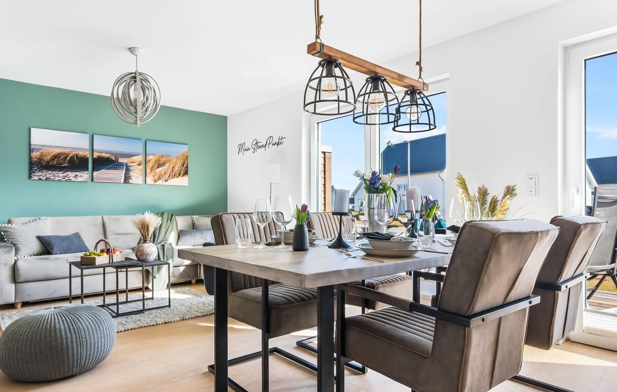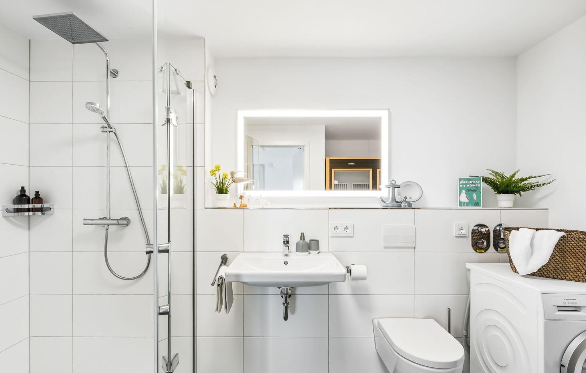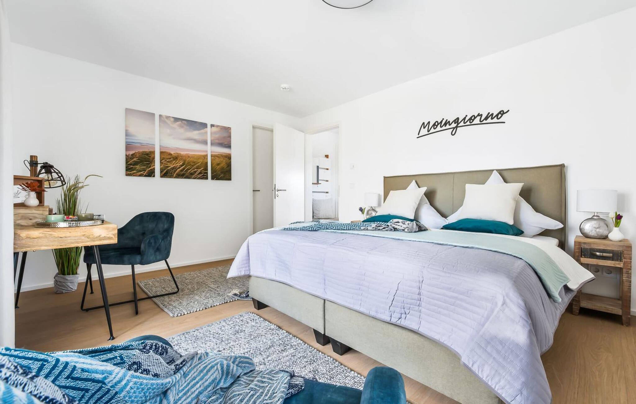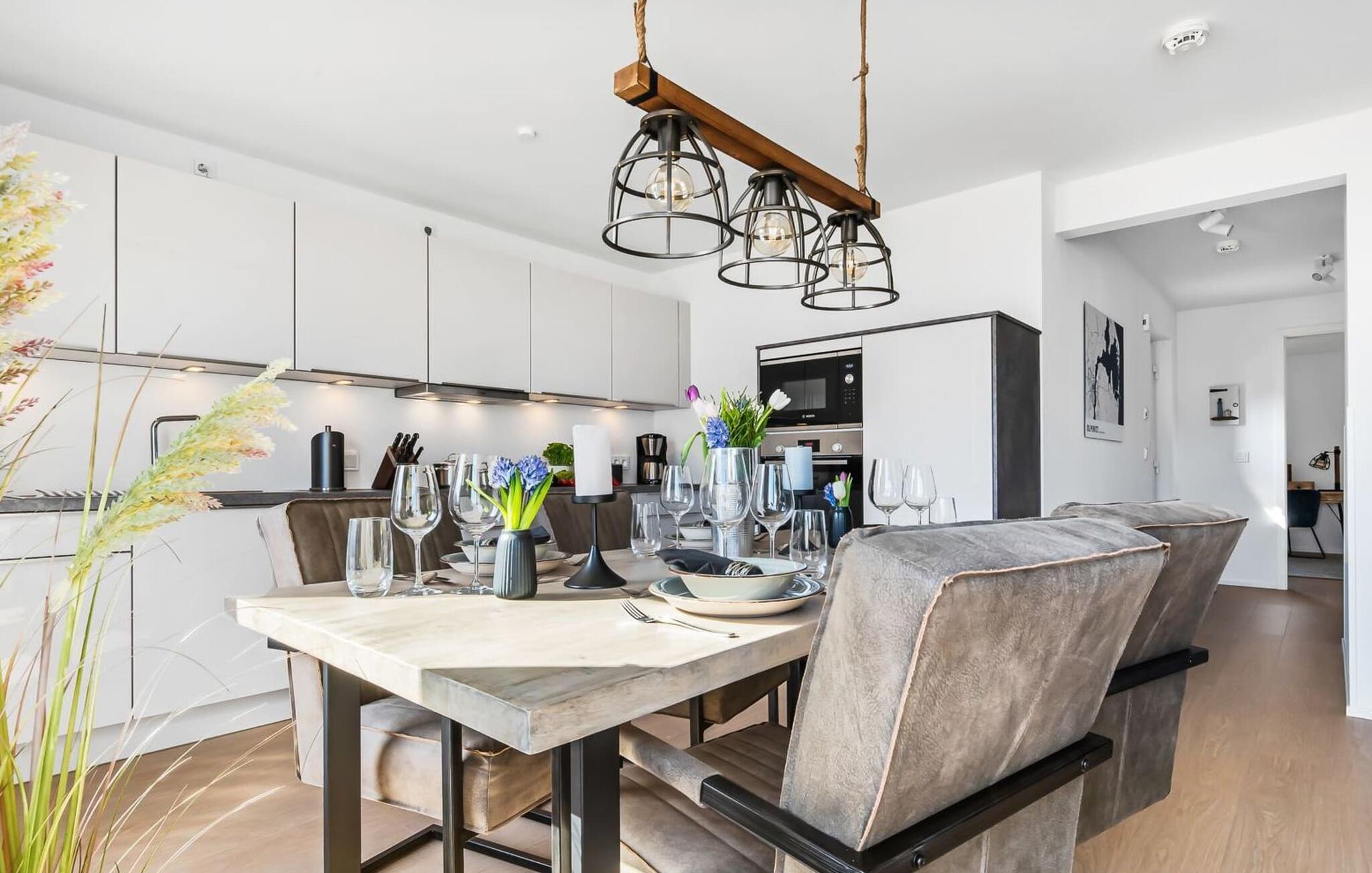 My StrandPoint er en rummelig ferielejlighed i stueetagen for op til fire personer. Havnepromenaden i OstseeResort Olpenitz med dets voksende udbud og indkøbsmuligheder samt sejl- og sportsbådshavnen ligger kun få meter fra ferielejligheden. Den maritime minigolfbane og Weidefelder-stranden ligger i umiddelbar nærhed og byder på sjov for hele familien. Med vinduesfronten fra gulv til loft og den store tilstødende terrasse er den åbne og lyse stue/alrum lejlighedens hjerte. I kan tilbringe afslappende aftener i den hyggelige opholdsstue. Uanset om I har en god bog i hånden eller til en filmaften sammen. Selv i dårligt vejr kan I finde jer godt tilpas her. Den knitrende pejs giver hyggelig varme og hygge. Det integrerede køkken er perfekt udstyret og lader intet tilbage at ønske. At lave mad sammen er sjovt! I kommer direkte ind på den store terrasse fra opholdsstuen. Nyd solen fra morgen til aften på de medfølgende havemøbler. Lad dagen slutte af med en grillaften sammen. Start dagen med udsigt over havnebassinet. I soveværelset er der udgang til den anden terrasse og walk-in-closet. En dobbelt boxmadras er tilgængelig i soveværelset til afslapning om natten. Der er to ekstra sovepladser på den komfortable sovesofa i stuen. Der er indrettet et lille 'feriekontor' område i soveværelset til dig, hvis I planlægger at kombinere det hyggelige med det nyttige. Badeværelset med en rummelig regnbruser i gulvniveau og en infrarød sauna byder på uforglemmelige wellness-øjeblikke og sikrer den perfekte afslutning på en begivenhedsrig feriedag. Ferielejligheden har egen ekstra bred parkeringsplads, som ligger få meter fra indgangen til ferielejligheden. Vores favoritsted: Fald i søvn og vågn op i en behagelig seng med udsigt over havnen... Bemærk venligst: OstseeResort Olpenitz er meget populært, og der bygges fortsat i parken. Ikke desto mindre kan I se frem til en 5-stjernet standard og et førsteklasses ophold. Byggeaktiviteterne kommer ikke til at forstyrre jer på ferien, og derfor gives der ikke yderligere afslag i prisen.