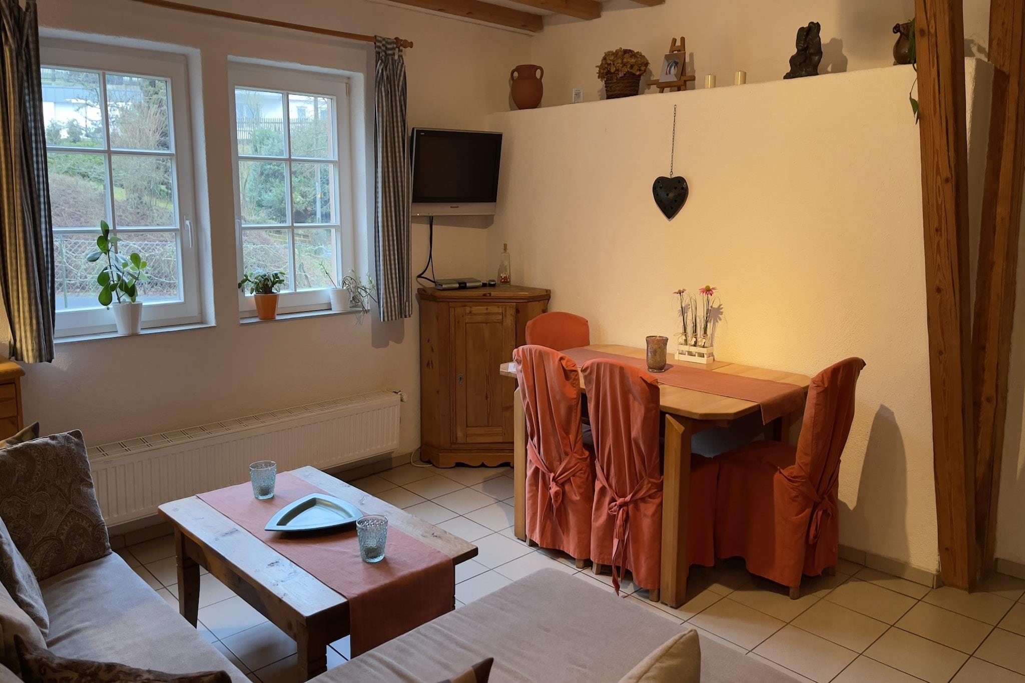 I den lille og rolige Eifel by Meisburg finder du lejlighederne Nyd jeg og II. Bygningen har desuden en lille café og en hyggelig gårdhave / gårdhave med en flot indrettet terrasse. Lejligheden Nyd Jeg er lyse og moderne møblerede og er ideel til 2 gæster men tilbyder gennem den generøse sovesofa i stuen indkvartering op til 4 personer. Meisburg er en stille landsby, centralt beliggende i Vulcanic Eifel med en kirke og en lille legeplads. Selvfølgelig kan du nyde vandreture og cykling i den smukke natur. Området byder også på mange muligheder for udflugter. Kendt er de to slotte i den middelalderlige by Manderscheid. Hvor kan du nyde et måltid i en af de mange gode restauranter. Et tip er en vandretur gennem Salmtalet, hvor den smukke Himmerodkloster ligger, hvis oprindelse går tilbage til 1137. Klosteret er stadig i brug, og du kan købe lokale produkter og nyde en klosterøl. På varme dage skal du gå til Meerfeld, hvor du kan svømme i den vulkanske kratersø. For en dagstur er den ældste by i Tyskland Trier absolut et besøg værd