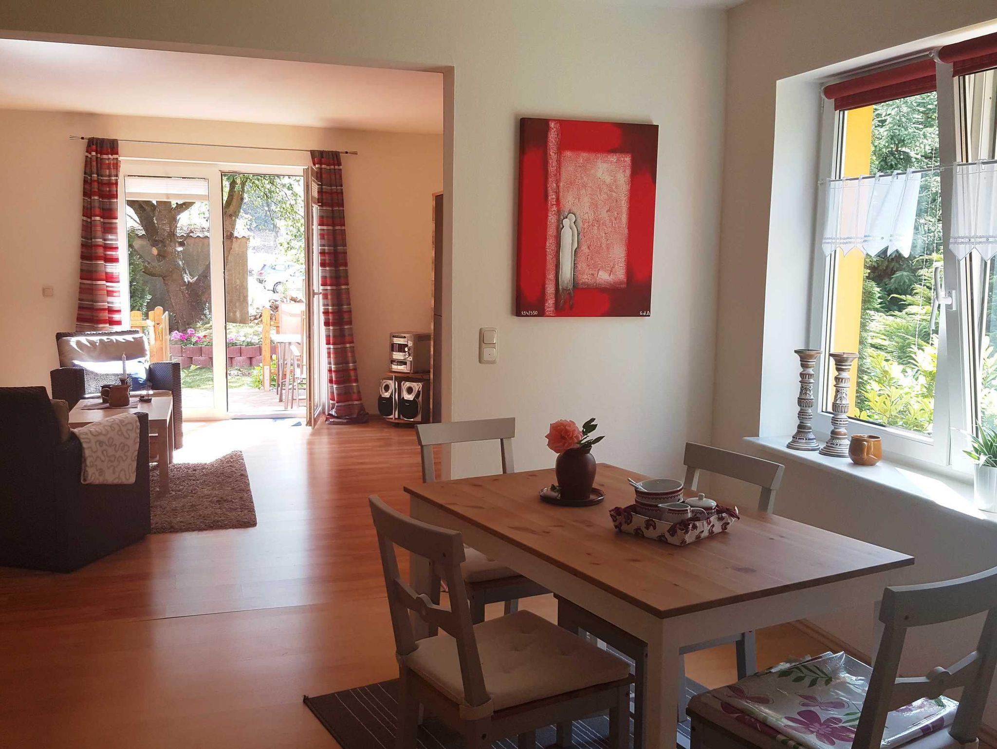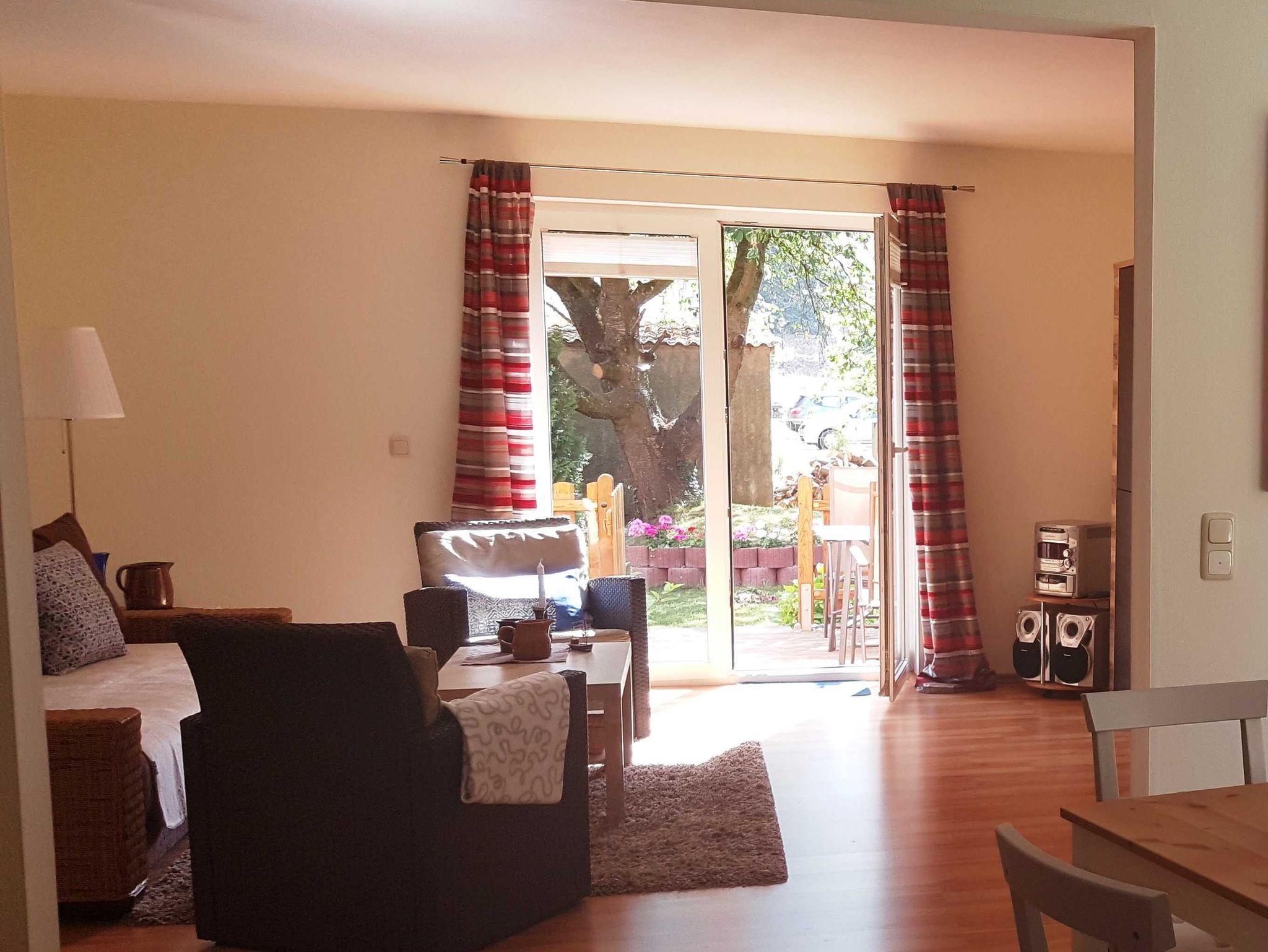 Die 2-Raum-Ferienwohnung ist ca. 60 qm groß und befindet sich im Erdgeschoss des Hauses. Die möblierte Terrasse ist vom Wohnzimmer aus begehbar, davor befindet sich eine zusätzliche Sitzecke im Garten mit einer Grillmöglichkeit. Das Wohnzimmer ist ausgestattet mit TV, Radio mit CD-Player, Sideboard, einer ausklappbaren Rattan-Couch (Liegefläche 1,80 x 2,00m), sowie Esstisch mit Stühlen. Die offene Küchenzeile ist ebenfalls im Wohnzimmer integriert. Sie verfügt über eine Kühl- und Gefrierkombination, 4-Platten-Ceranherd, Backofen, Mikrowelle, Wasserkocher und Kaffeemaschine. Vom Wohnzimmer hat man einen Blick ins Grüne. Im separaten Schlafzimmer steht Ihnen ein Doppelbett zur Verfügung. Bad mit DU/WC. Ein Kinderreisebett (Baby) und Hochstuhl ist auf Anfrage kostenfrei erhältlich, bitte vorbestellen. Die Erstausstattung Bettwäsche ist inklusive. Handtücher sind mitzubringen.