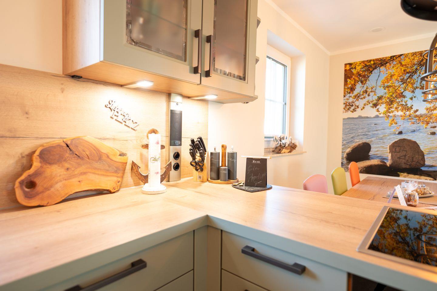 Das reetgedeckte Ferienhaus bietet auf 110 m² Platz für bis zu 6 Personen (5 Erwachsene und 1 Kind) und verbindet modernen Wohnkomfort mit behaglichem Landhausflair. Im offenen Erdgeschoss lädt der großzügige Wohnbereich mit Kamin, gemütlicher Sofaecke und hochwertiger Landhausküche zu gemeinsamen Stunden ein. Auf der überdachten Terrasse lässt sich der Tag wunderbar beim Essen im Freien oder einem Glas Wein ausklingen.
