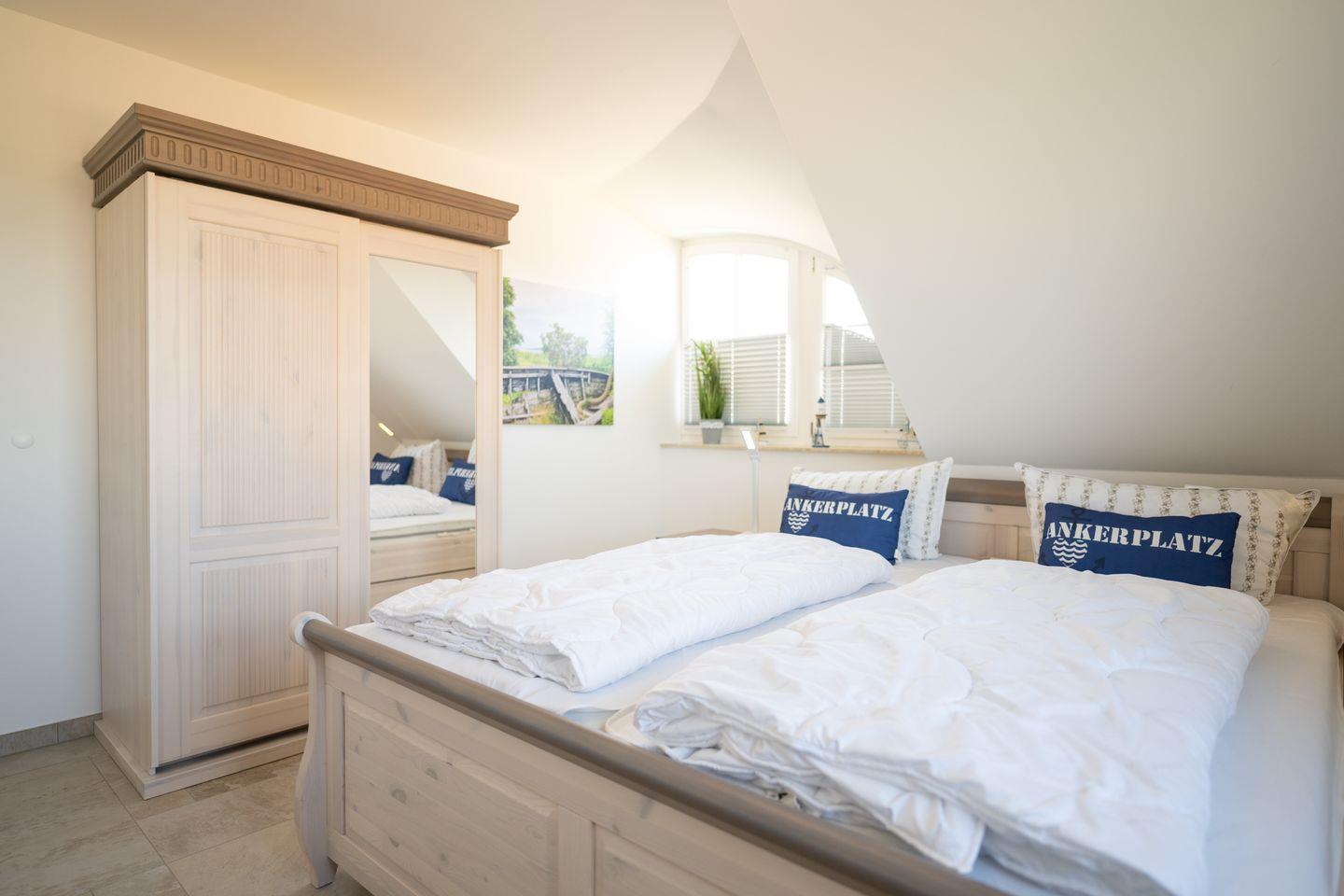 Im Obergeschoss erwarten Sie drei liebevoll eingerichtete Schlafzimmer – zwei mit Doppelbett, eines mit Einzel- und Kinderbett – sowie ein komfortables Tageslichtbad mit Wanne, ebenerdiger Dusche, Doppelwaschtisch und integriertem TV. Von hier aus blicken Sie über die wunderschöne Natur bis zur Üselitzer Wiek.
