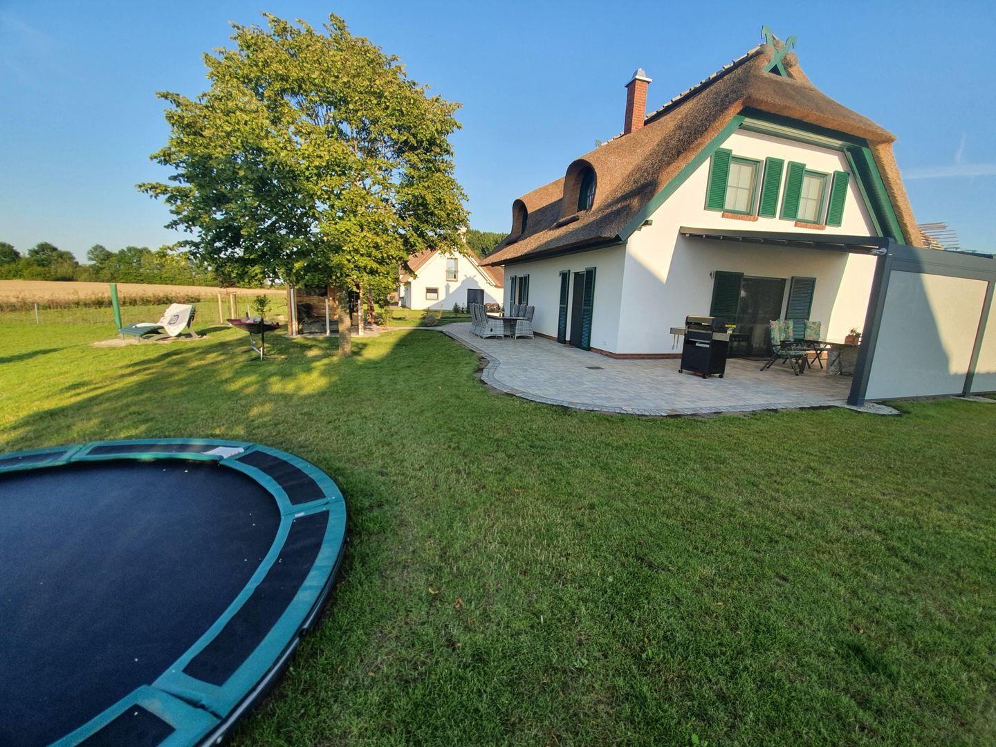 Der große Garten ist ein Paradies für Kinder: mit Spielburg, Trampolin und viel Platz zum Toben. Für die Eltern stehen zwei PKW-Stellplätze, eine abschließbare Fahrradgarage und eine Wallbox bereit – ideal für alle, die mit dem E-Auto anreisen.