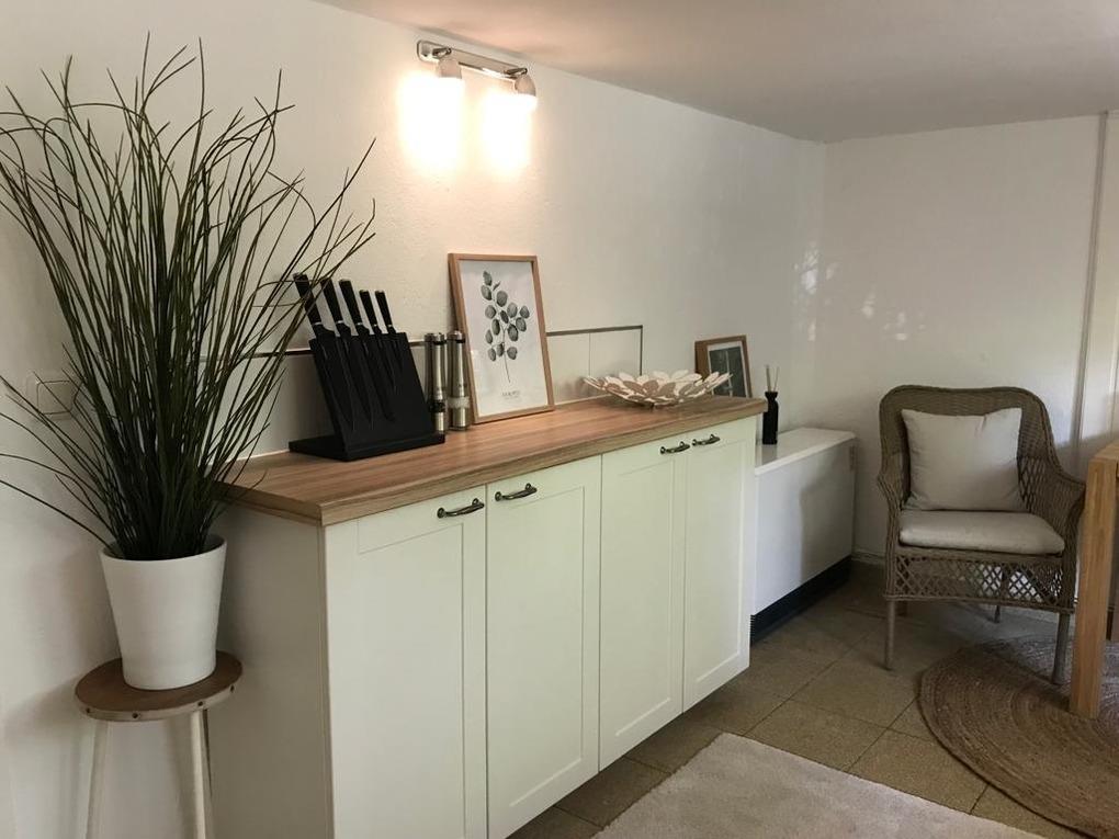 Souterrain: Vom Flur führt eine Treppe ins Untergeschoss. Hier im Souterrain ist die Küche (Stehhöhe nur 183 cm) und das Duschbad mit WC (Stehhöhe nur 190 cm) untergebracht. Beim Durchqueren der Durchgänge muss man den Kopf kurz einziehen, das solltet ihr wissen.