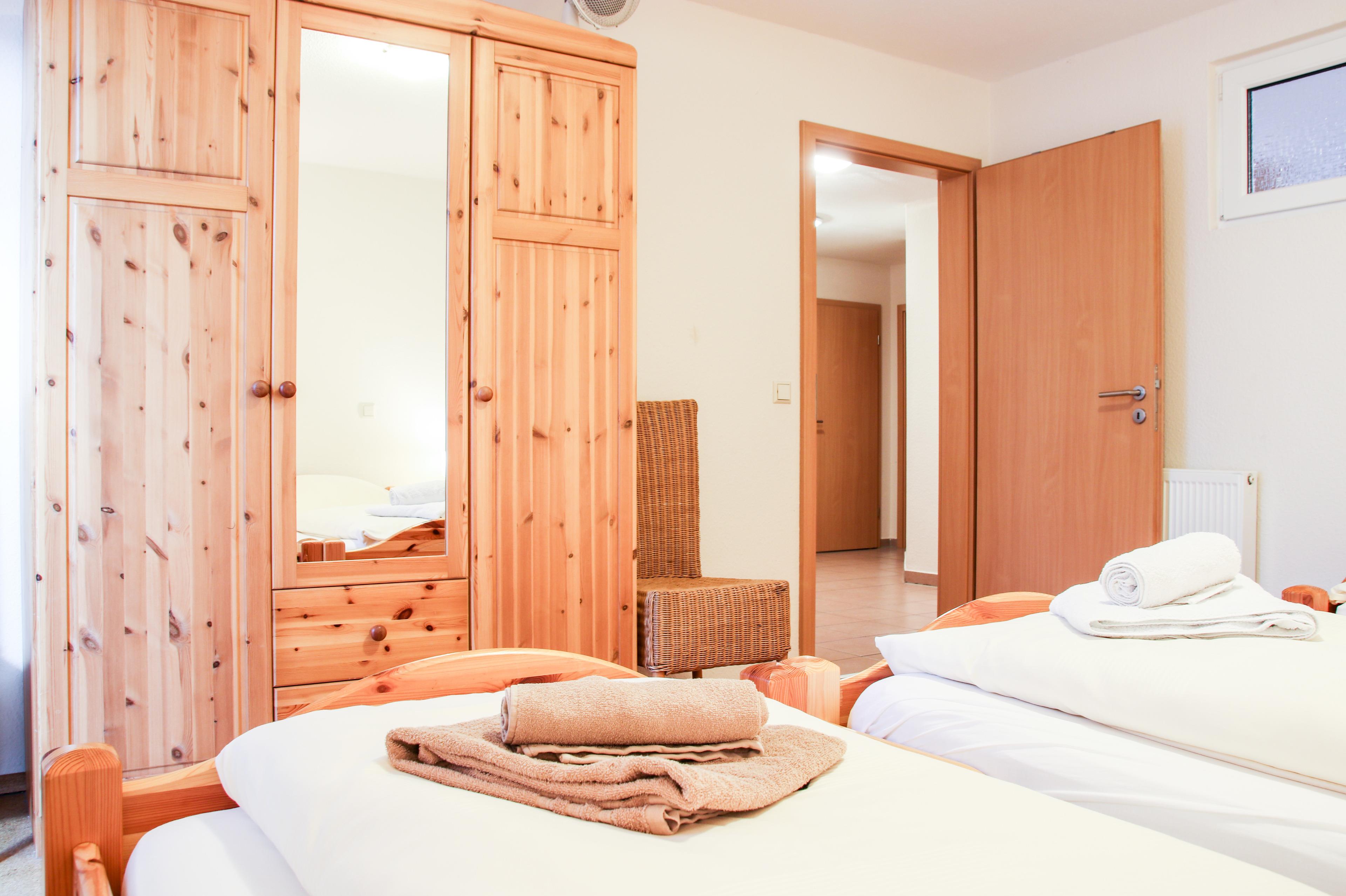 Die Wohnung ist ideal für 3 Personen. Das Schlafzimmer verfügt über 3 Einzelbetten, die man auch zum Doppelbett plus Einzelbett umstellen kann. Zudem gibt es die Möglichkeit, eine zusätzliche Person noch im geräumigen Wohnzimmer im Einzelbett unterzubringen. Sollte noch ein weiterer Schlafplatz benötigt werden, so kann man dafür noch das große Sofa benutzen. In dieser Wohnung gibt es noch ein Gäste-WC, so dass die Person(en) im Wohnzimmer dieses nutzen können, ohne andere dabei in ihrem Schlaf zu stören. Das Bad liegt direkt neben dem Schlafzimmer, und ist auch nur vom Schlafzimmer aus zu betreten.