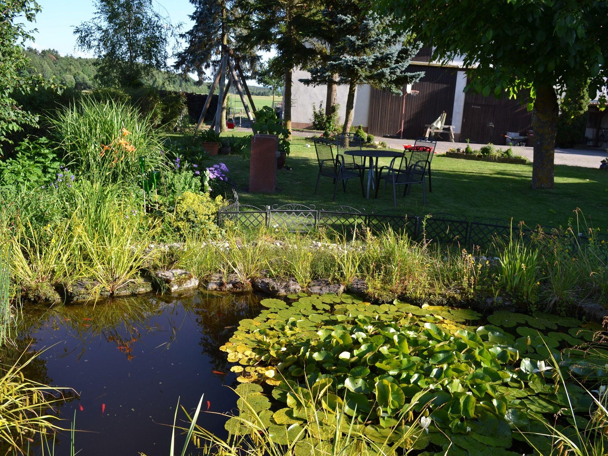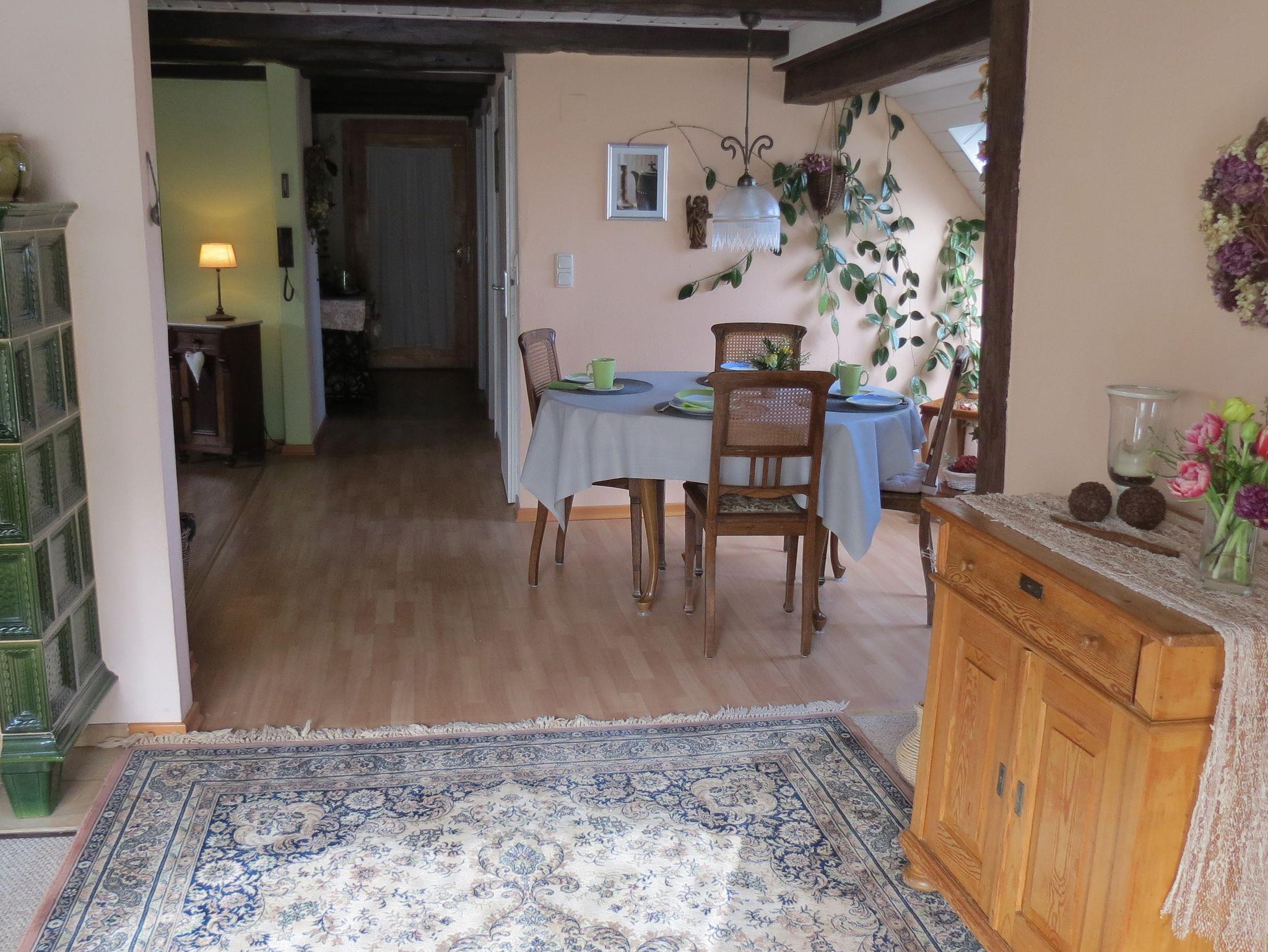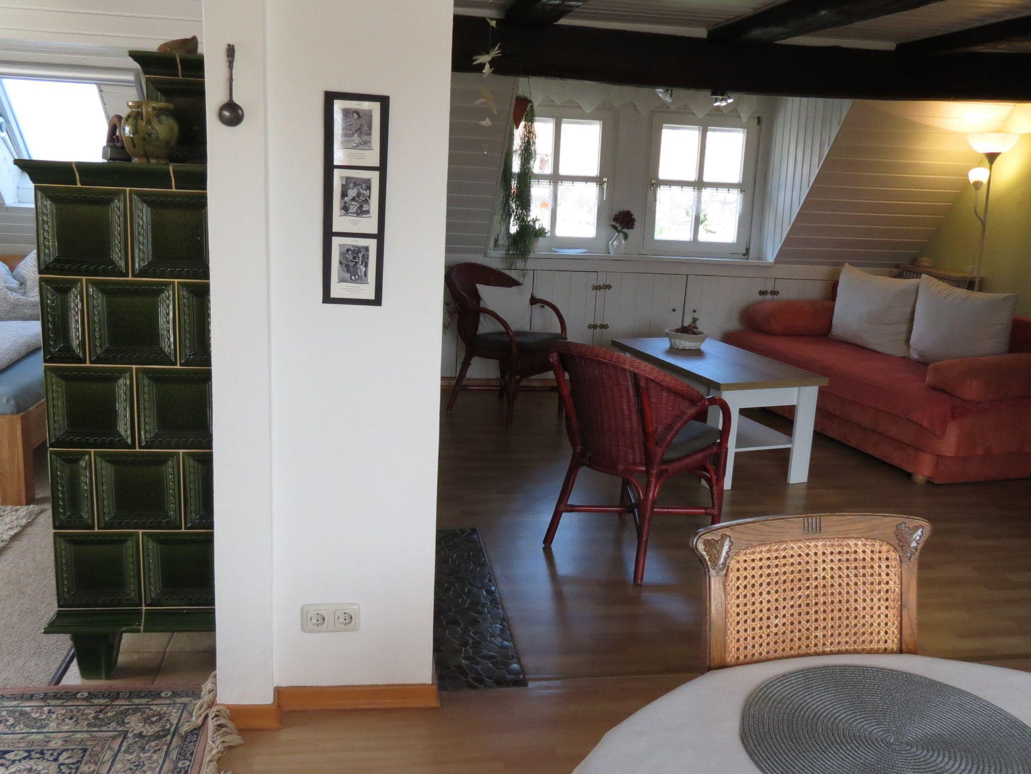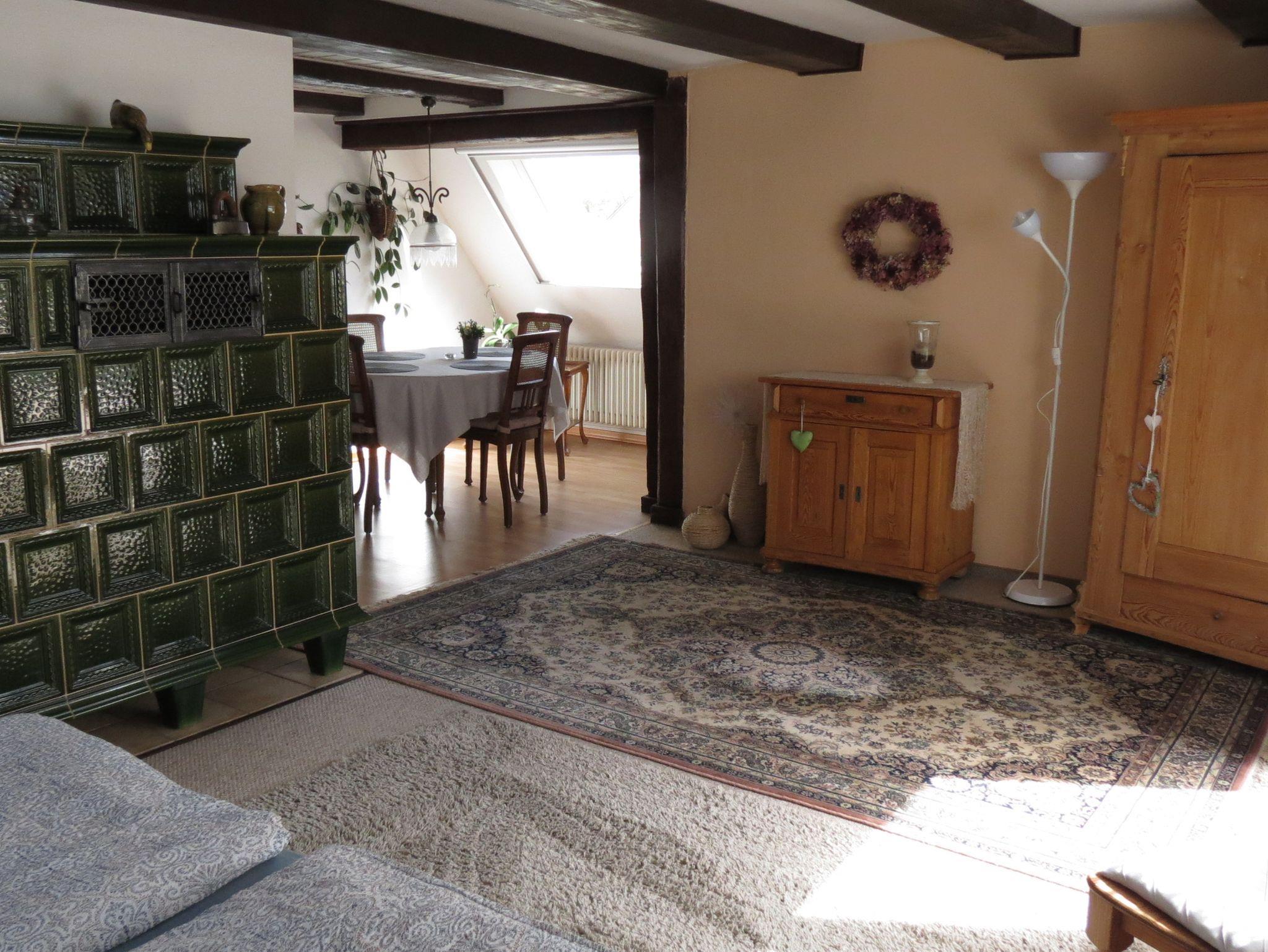 Der große Raum besticht durch die gemütliche Gestaltung mit offenen rustikalen Deckenbalken und einem großen Kachelofen. Der Wohnzimmerbereich hat eine Polsterecke, Essecke und Sat-TV, DVD-Player. Die Schlafecke verfügt über ein Doppelbett. Der Zugang der Ferienwohnung befindet sich im Eingangsbereich über eine 30qm großer Balkonterrasse.