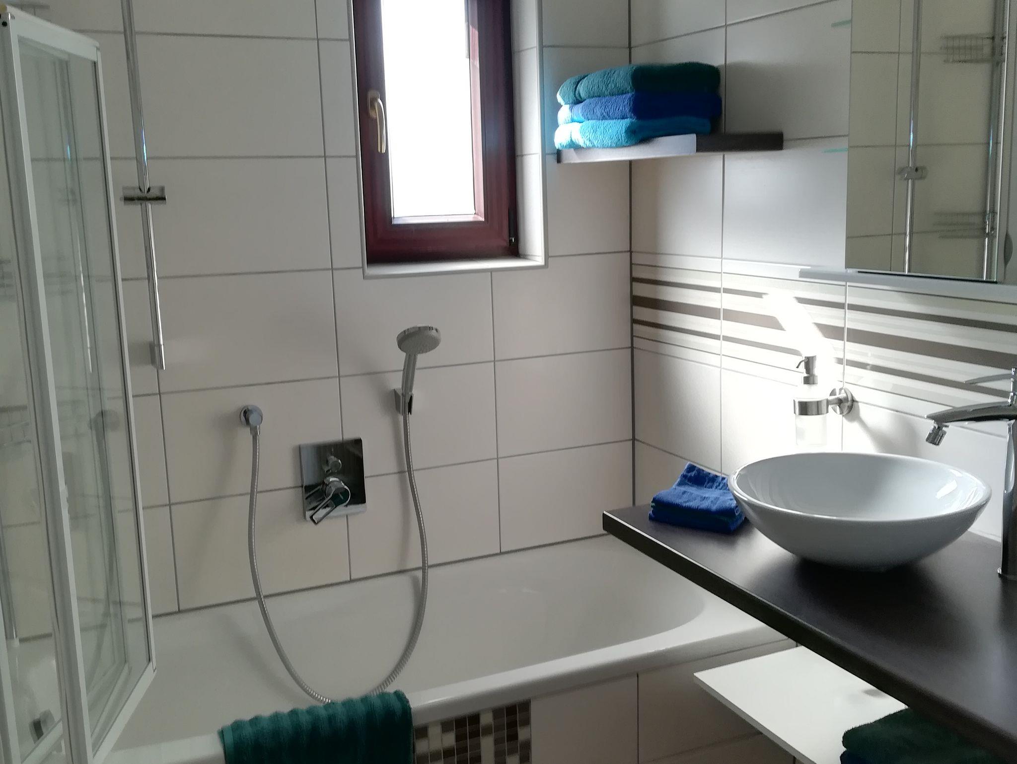 Im neuen Bad mit Dusch-Wanne ist ein Föhn und Duschgel vorhanden. Außerdem gibt es ein separates WC.