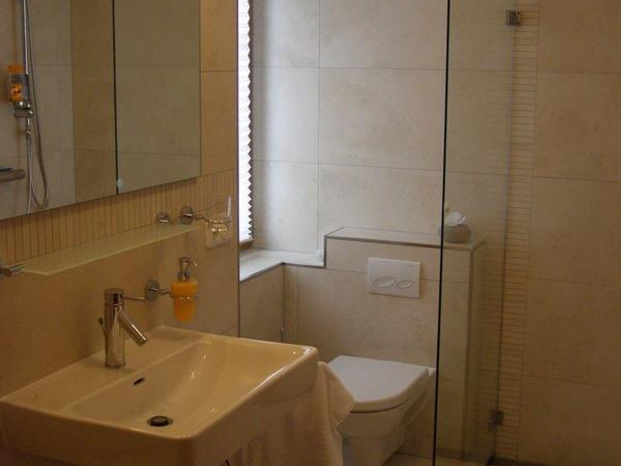 Das Bad hat eine ebenerdige Dusche, deren Trennwand zum Wegklappen ist und sie so zu einer barrierefreien Dusche wird.