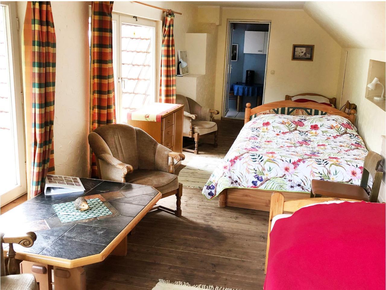 Zweckmäßig eingerichtete Ferienwohnung ca. 60 qm, im Wohnzimmer befindet sich ein Doppelbett und eine einfach eingerichtete Küche und eine Empore mit 2 Matratzen, ein Schlafraum mit 2 Einzelbetten und einem französischen Doppelbett. Lage: 1. Etage