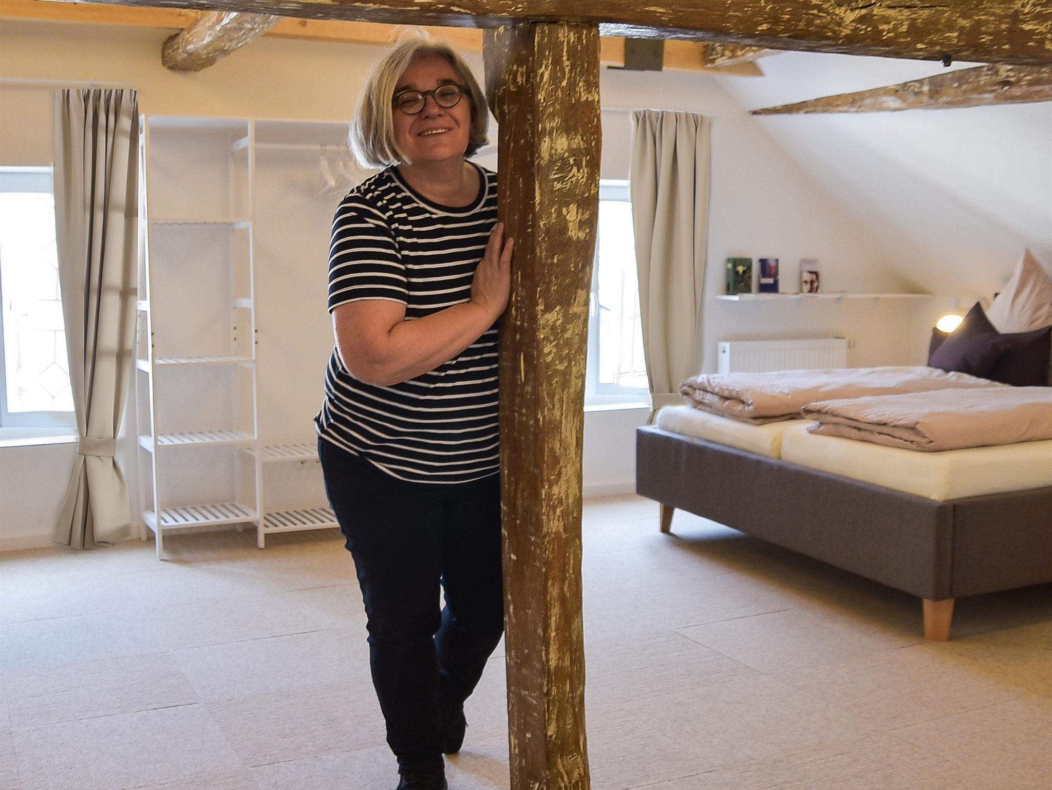 Appartement Bücherliebe ist eine zweigeschossige Maisonettewohnung für 4 Personen in einem denkmalgeschützen Stadthaus. Küche, Essbereich, Wohnzimmmer, Leseecke, Schreibtisch, Gäste WC, kleines Schlafzimmer mit 2 Betten sind unten. Über eine Wendeltreppe erreichen Sie den Schlafbereich mit offenem Sprengwerk. Die alten Balken (obwohl der Raum sehr hoch ist, müssen Sie sich bei einigen Balken leicht bücken) haben wir abgeschliffen. Hier ist ein Doppelbett, Schrank, Sessel und eine Schlafcouch und das Bad. Im Keller sind Waschmaschine und Trockner und ein Fahrradraum. Ausgzeichnet mit 5 Sternen.