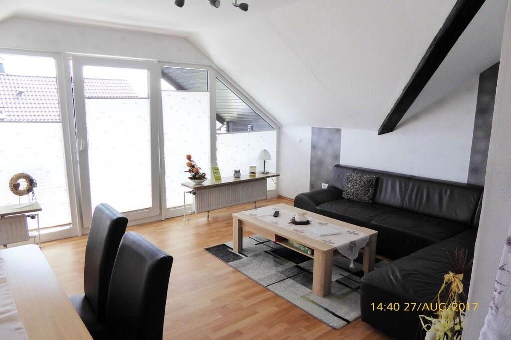 Loft: (Køkken(kakkelovn, kogeplade, elkedel, brødrister, kaffemaskine, ovn, mikrobølgeovn, køleskab, fryser), stue / spisestue(, , Fjernsyn, Fjernsyn, spisebord), soveværelse(, dobbeltseng, barneseng), soveværelse(enkeltseng, enkeltseng, enkeltseng), badeværelse, guest toilet(, toilet, håndvask)) , , Internetadgang, Internetadgang, Førstehjælp, balkon(havemøbler), varme, tørreskab,