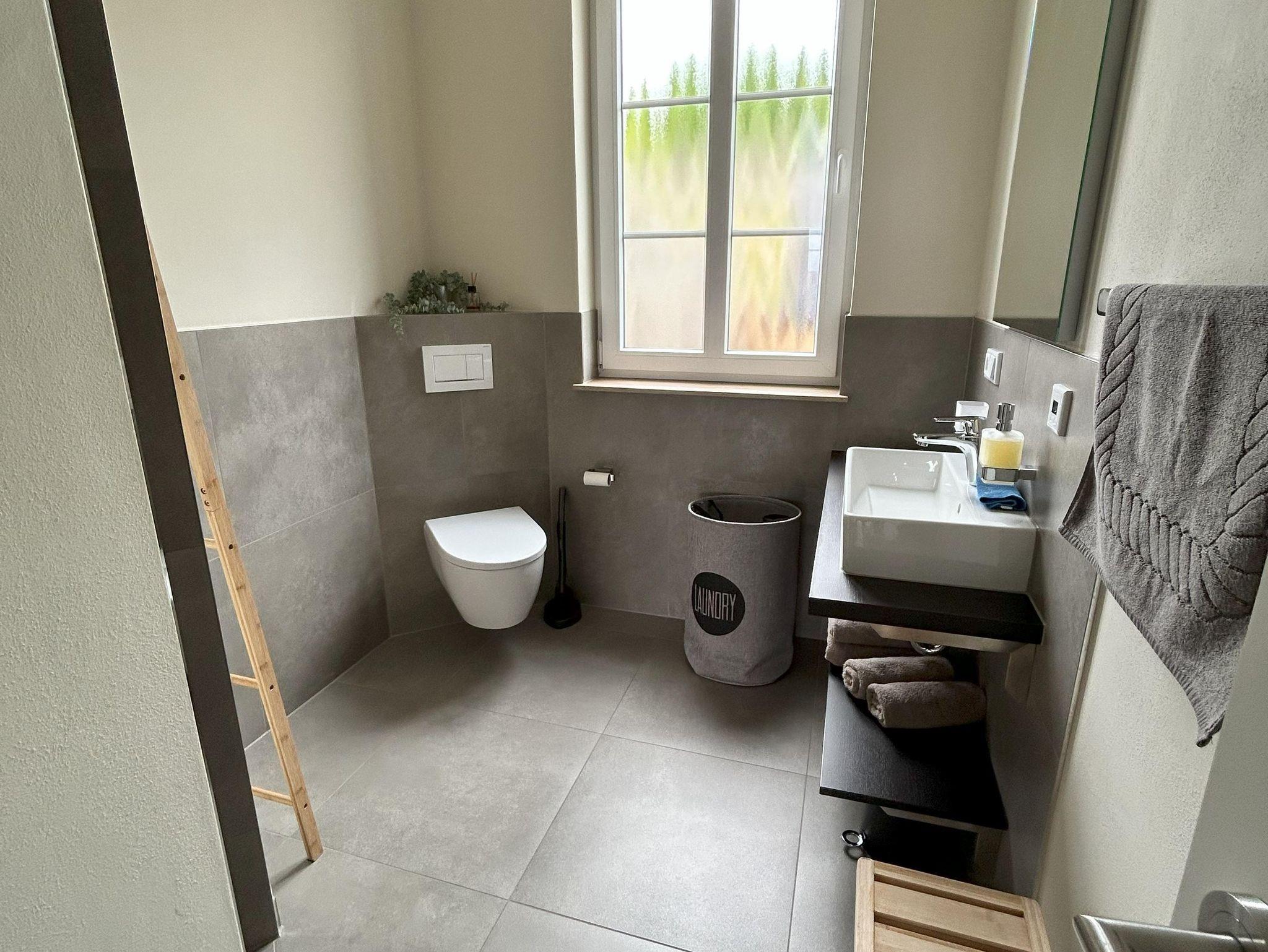 Das Badezimmer ist ausgestattet mit einer hochwertdigen Dusche, Waschtisch und WC.