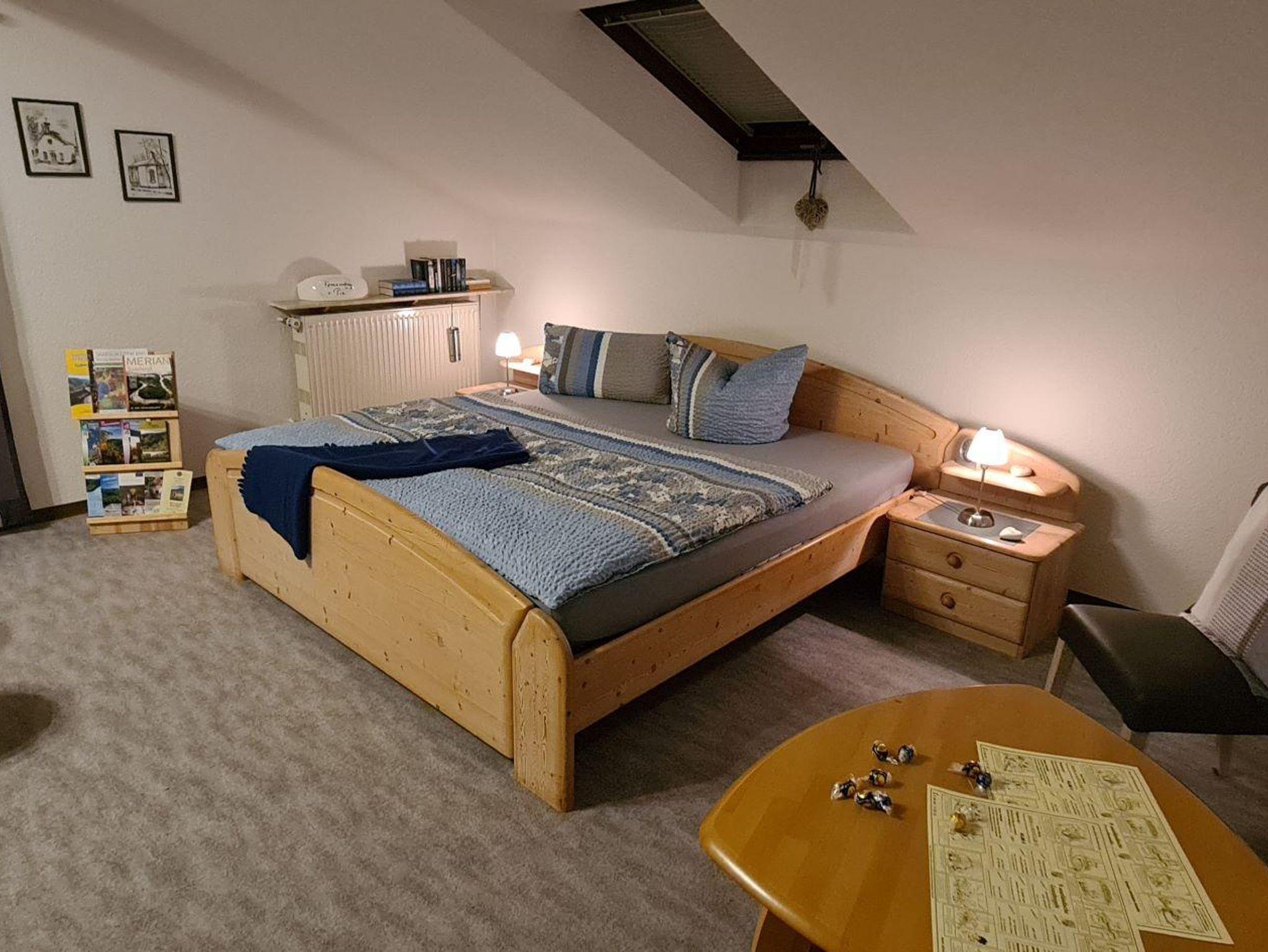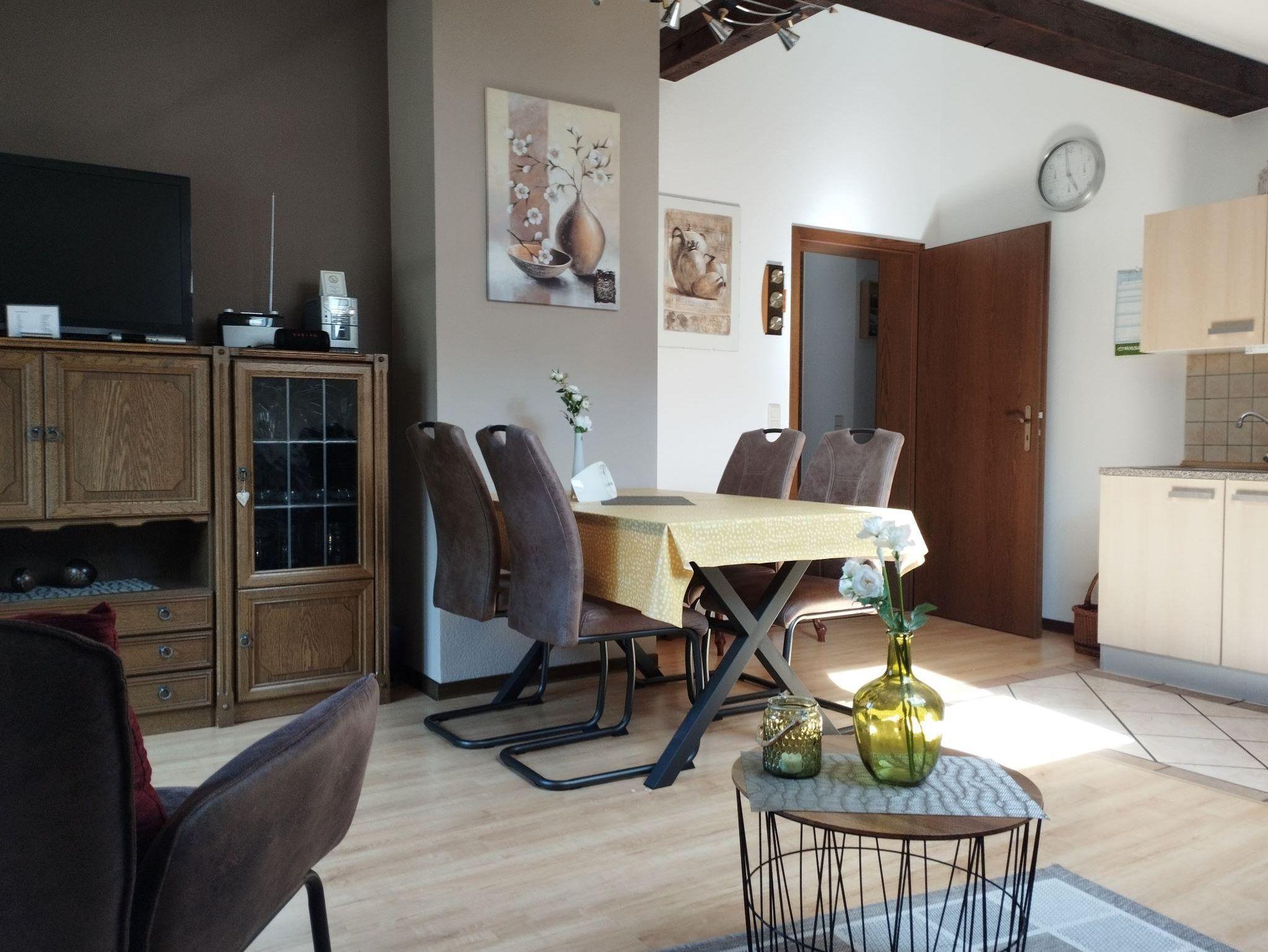 Der lichtdurchflutete Wohnraum ist mit einer gemütlichen Sitzecke, Stereoanlage und TV ausgestattet. Der Essbereich mit integrierter und voll ausgestatteter Küche (Kühlschrank, Herd, Backofen, Mikrowelle, Kaffeemaschine, Wasserkocher etc. ) und der große Balkon (hier darf geraucht und gegrillt werden) runden den Wohnbereich ab. Im geräumigen Doppelzimmer sowie in dem zweiten Schlafzimmer mit getrennten Betten lassen Sie sich von der Sonne wecken. Das Tageslichtbad verfügt über eine Dusche, Handtücher und Bettwäsche sind selbstverständlich vorhanden. Im Keller des Hauses befinden sich Waschmaschine und -trockner sowie Tiefkühlmöglichkeit. Zur Wohnung gehört ein PKW-Stellplatz, eine 11KW- Wallbox zum Laden von E-Fahrzeugen sowie eine abschließbare Unterstellmöglichkeit für Fahrräder und Bikes; Lademöglichkeit für E-Bikes ist selbstverständlich. Unsere Ferienwohnung wurde nach den Kriterien des Deutschen Tourismusverbandes (DTV) mit 3 Sternen bewertet.