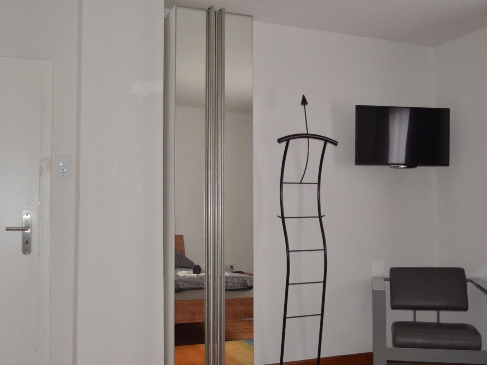 Im Schlafraum mit Doppelbett, 1,80 m x 200 Kleiderschrank, und Beistellsessel fühlen Sie sich gleich sehr wohl. TV mit Streaming Dienst ist vorhanden.