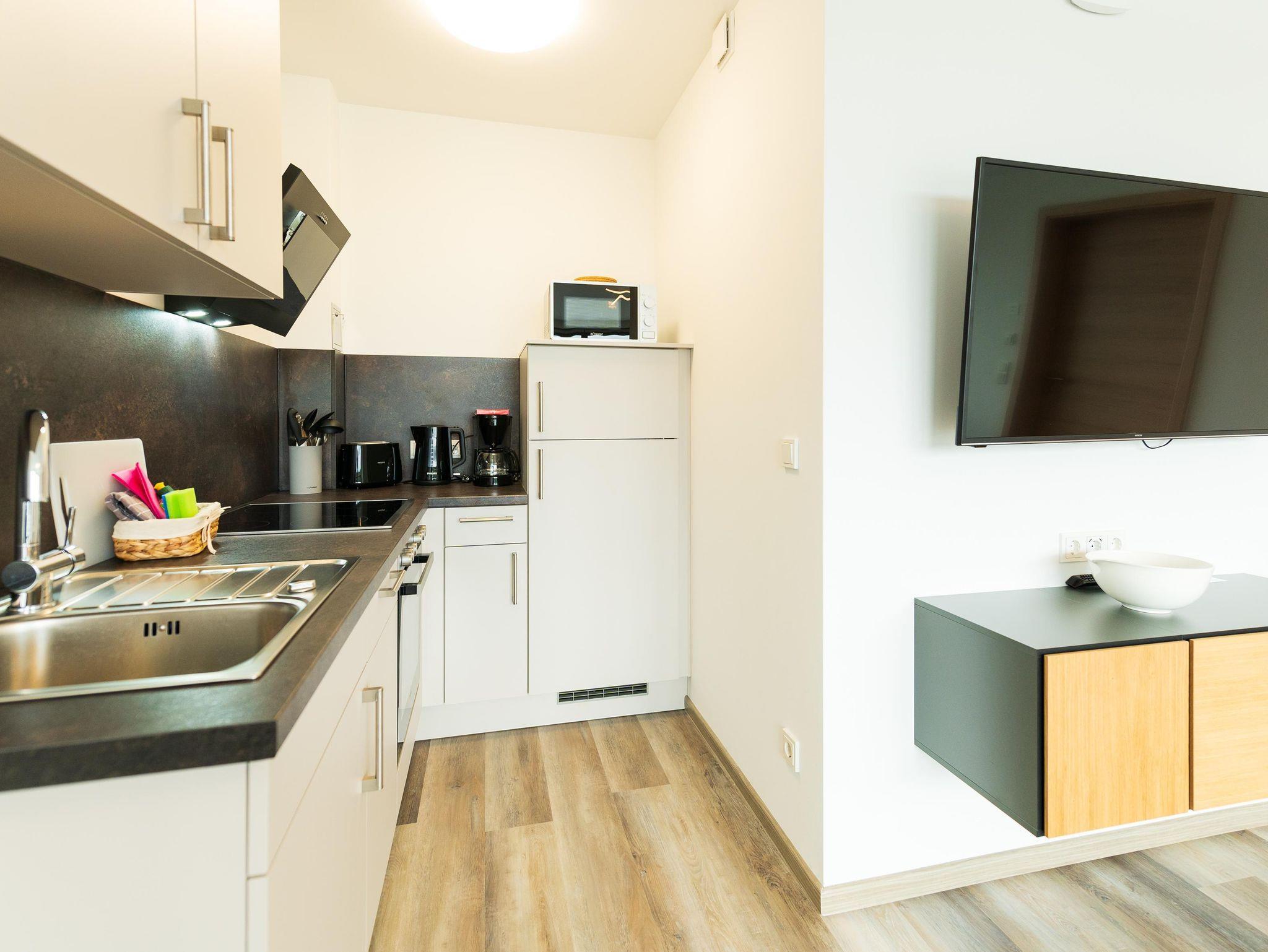 Die modernen Appartements bieten einen gemütlichen Wohn- und Essbereich im Loft Stil: im offenen Wohnbereich finden Sie ein bequemes Sofa, die voll ausgestattete Küche lässt keine Wünsche offen und der freundliche Essbereich bietet viel Platz zum Zusammensitzen. Die Schlafzimmer mit komfortablem Doppelbett sorgen am Ende des Tages für Erholung. Im modernen Badezimmer spiegelt sich das Thema Ihres Appartements in Form einer beeindruckenden Duschrückwand wider.