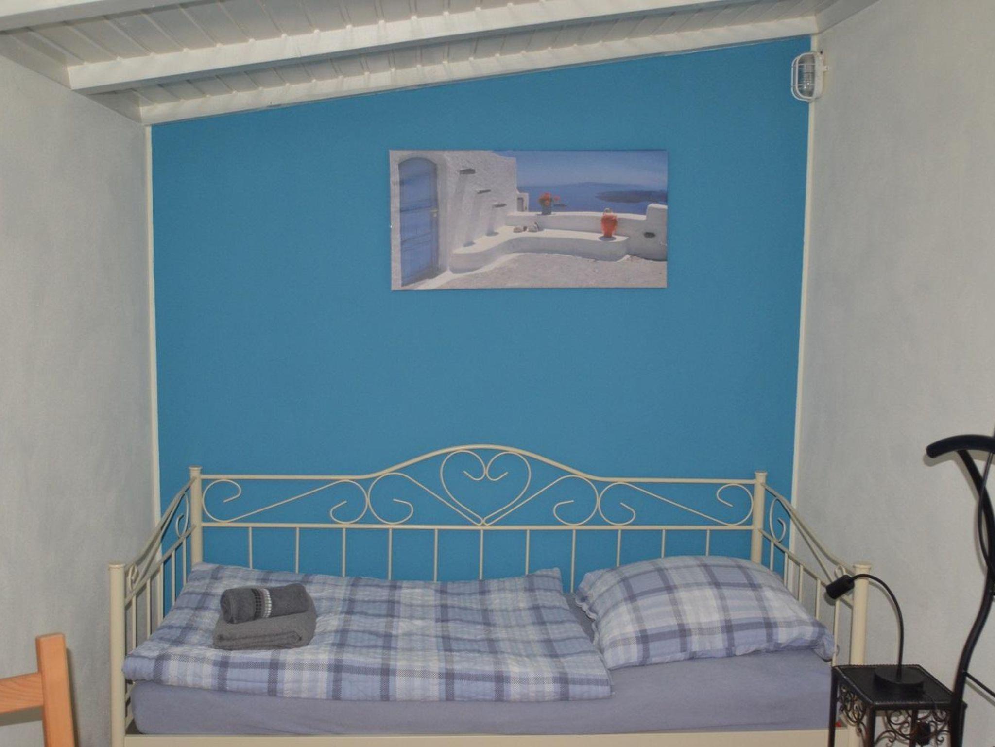 Ein weiteres Schlafzimmer mit Einzelbett haben wir im mediterranen Stil eingerichtet. Dieses Zimmer hat einen schönen Blick in den Garten.