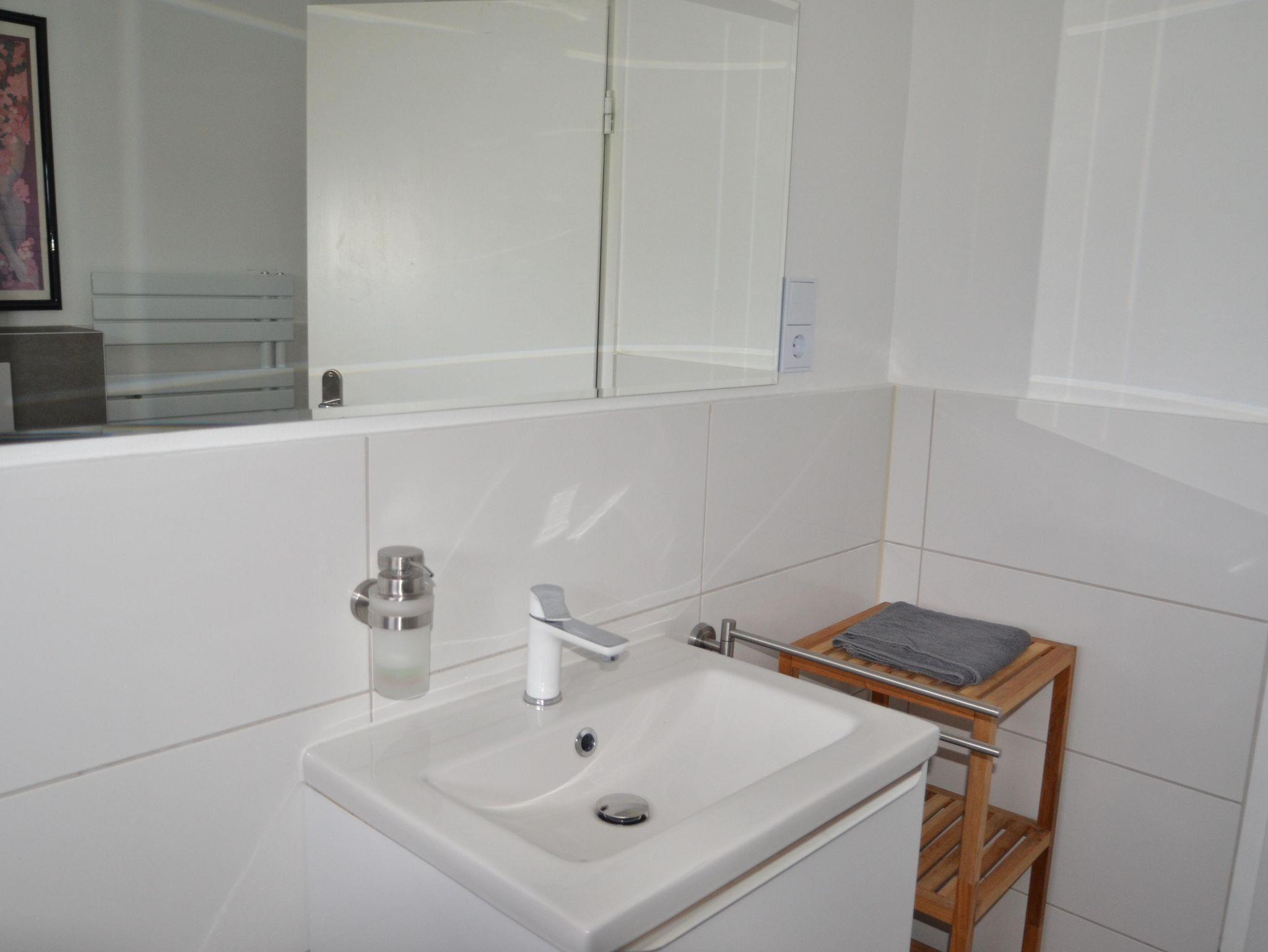 Im Obergeschoss befindet sich weiter das neu und modern gestaltetes Badezimmer mit bodengleicher Dusche, Waschtisch, Toilette und Föhn.