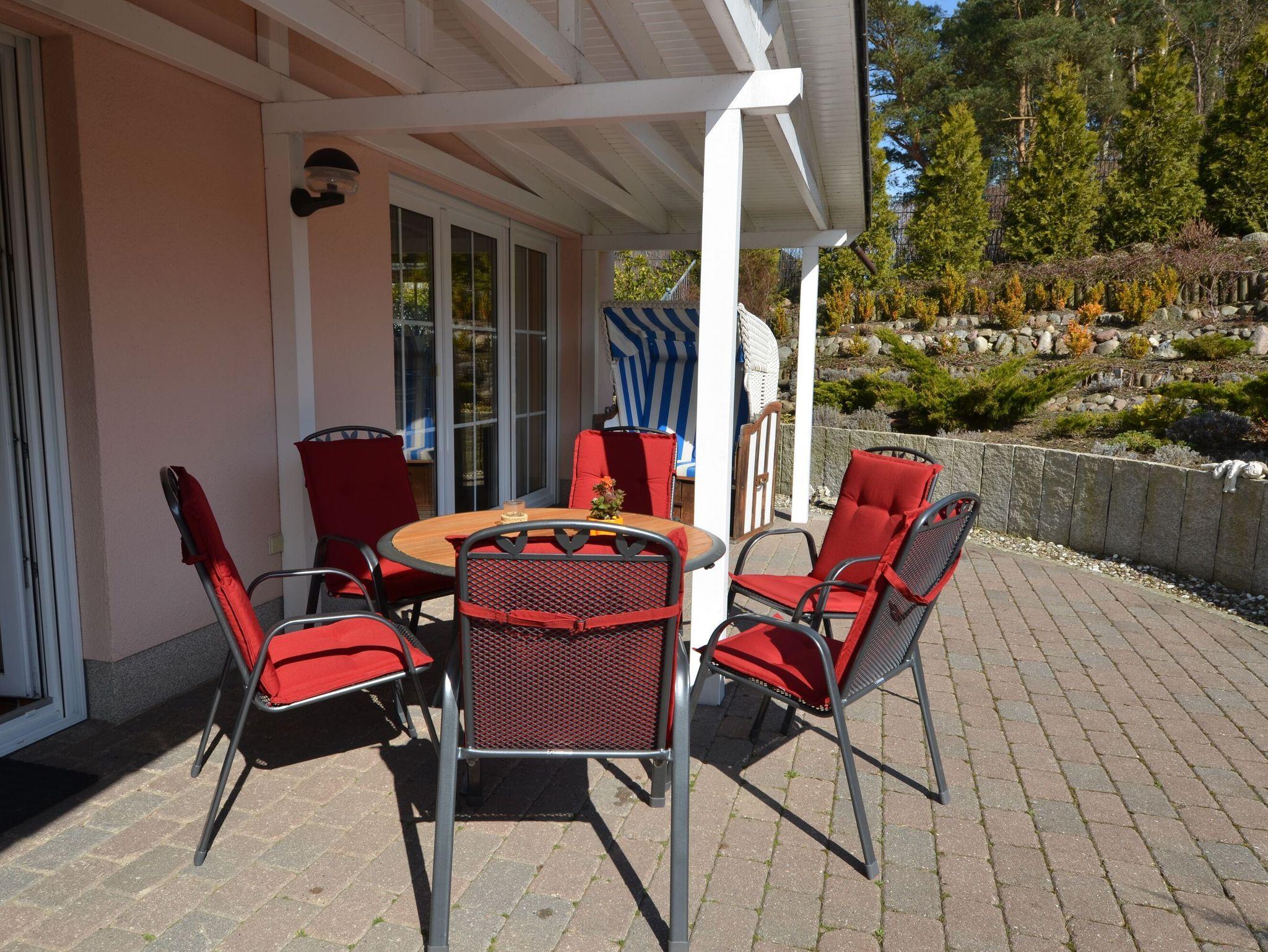 Die große Terrasse zur Südseite ist mit hochwertigen Terrassenmöbeln, Sonnenliegen sowie einem Grill versehen.