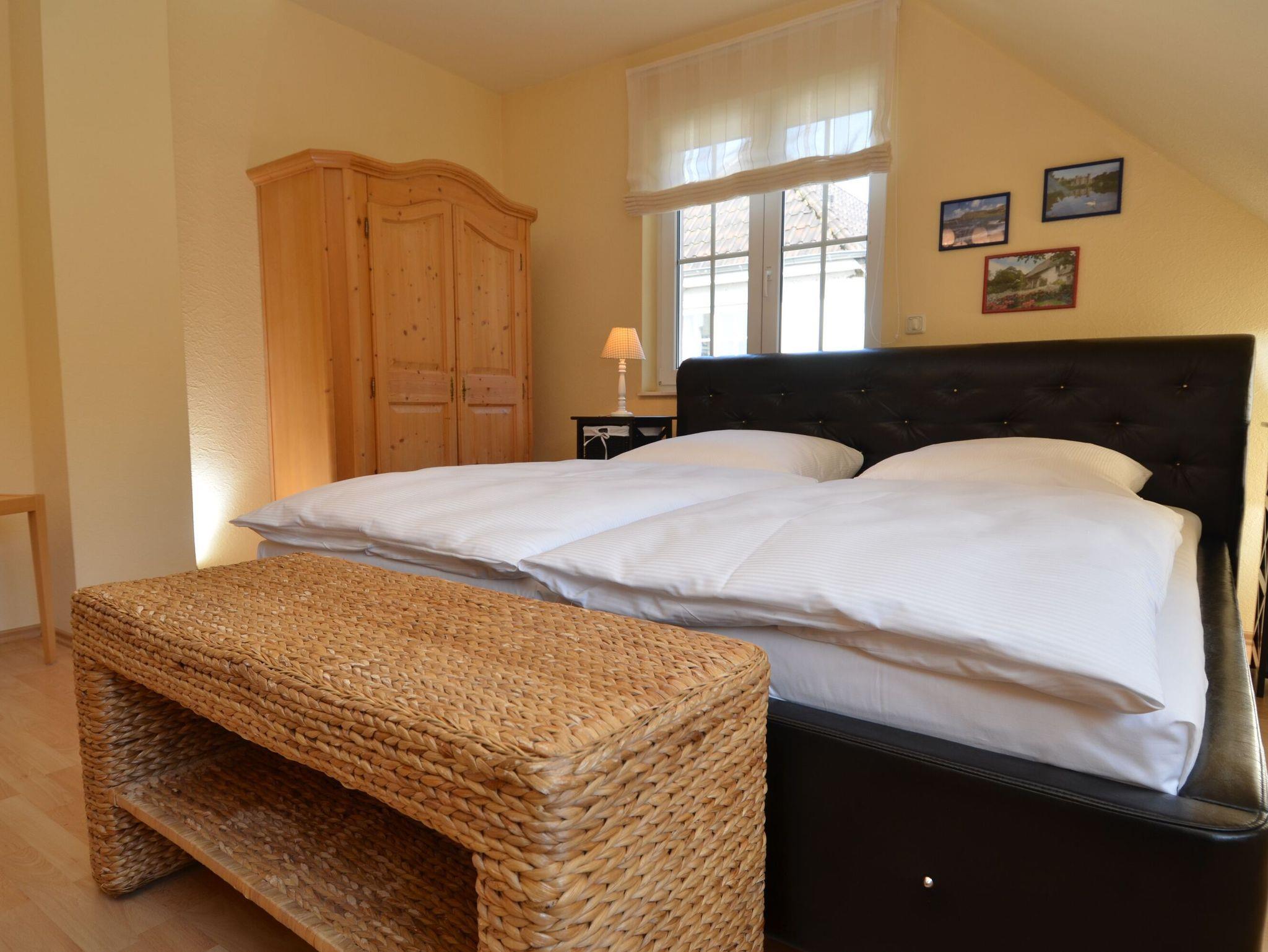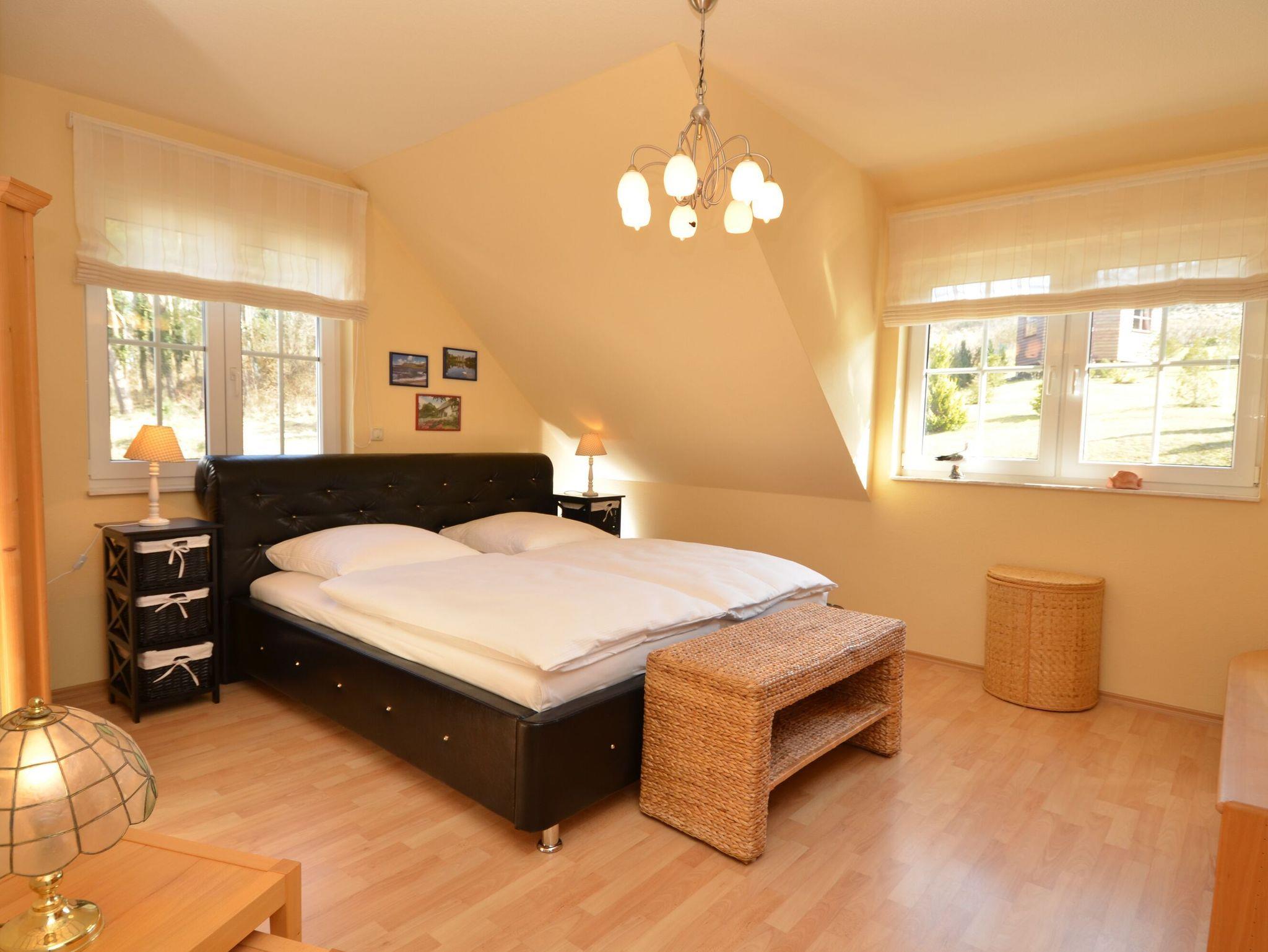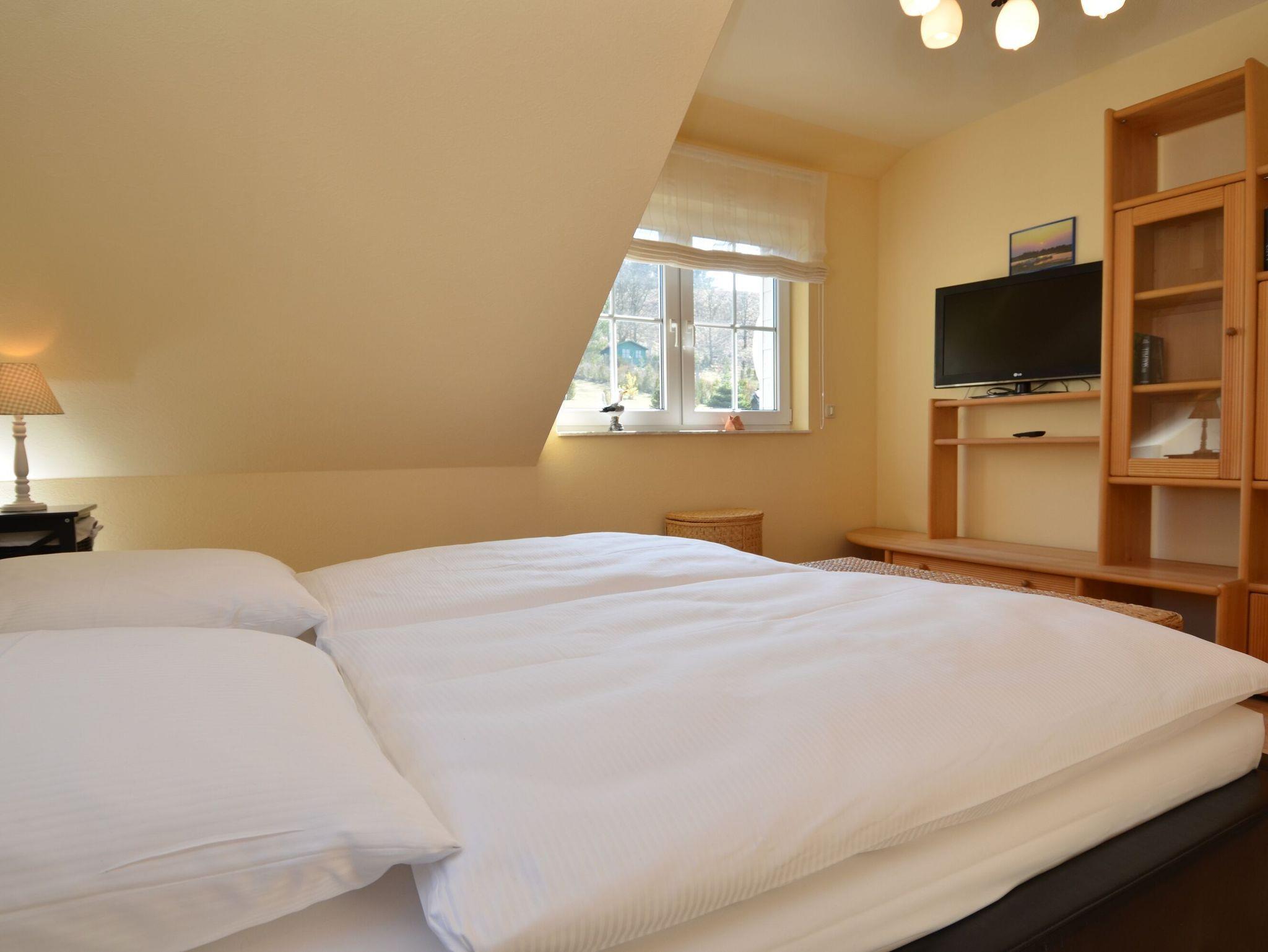 Im Obergeschoss sind die beiden Schlafzimmer und das große Badezimmer untergebracht. Beide Schlafzimmer sind mit modernem Laminat ausgelegt und verfügen je über ein Doppelbett der Größe 1,80 x 2,00 m sowie genügend Stauraum für Ihre Urlaubsgarderobe. Eines der Schlafzimmer verfügt über einen weiteren Flachbild-TV.
