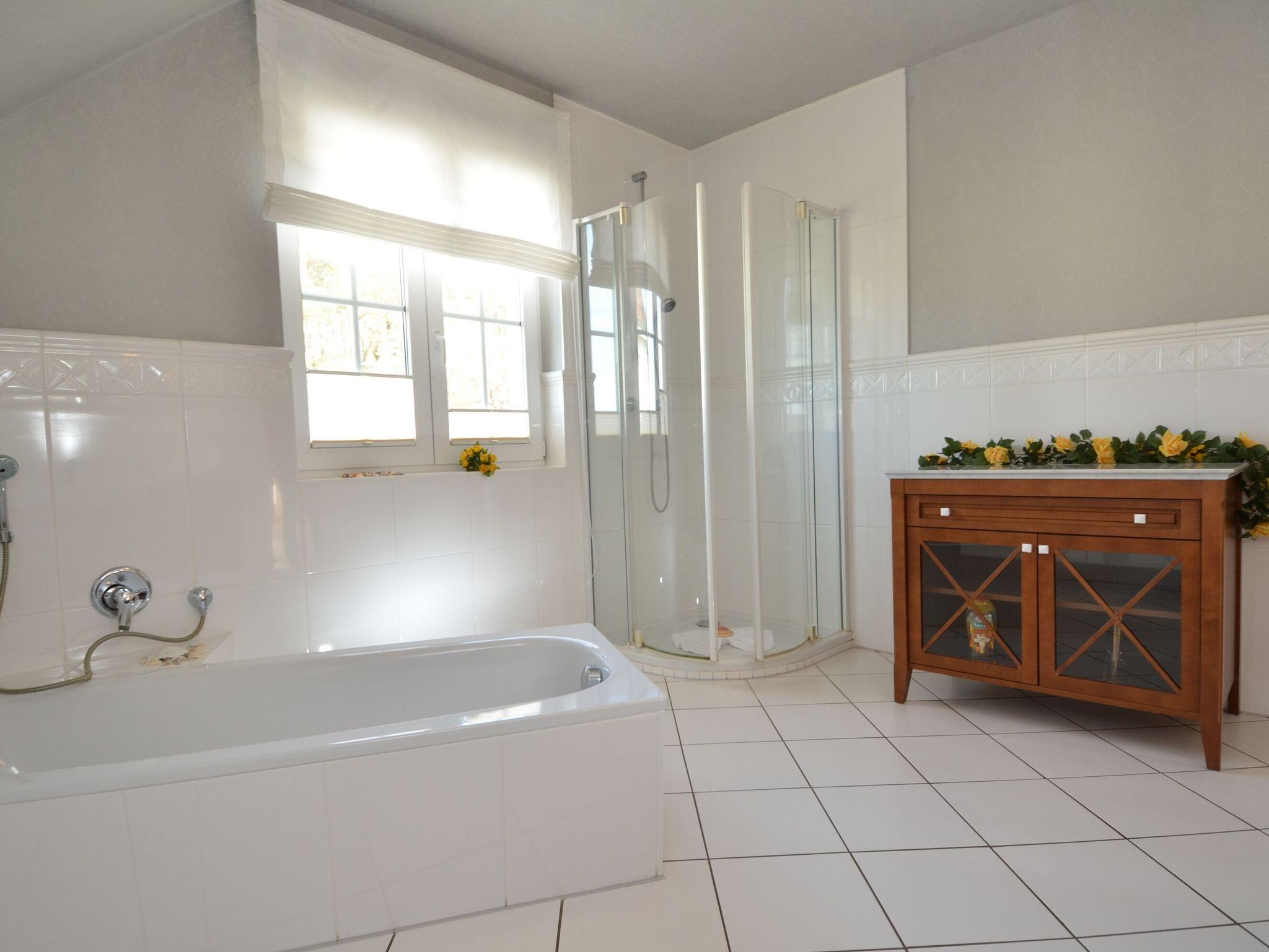 Das Badezimmer ist voll gefliest und mit einer Badewanne, einer separaten Dusche, einem Haartrockner und WC ausgestattet.