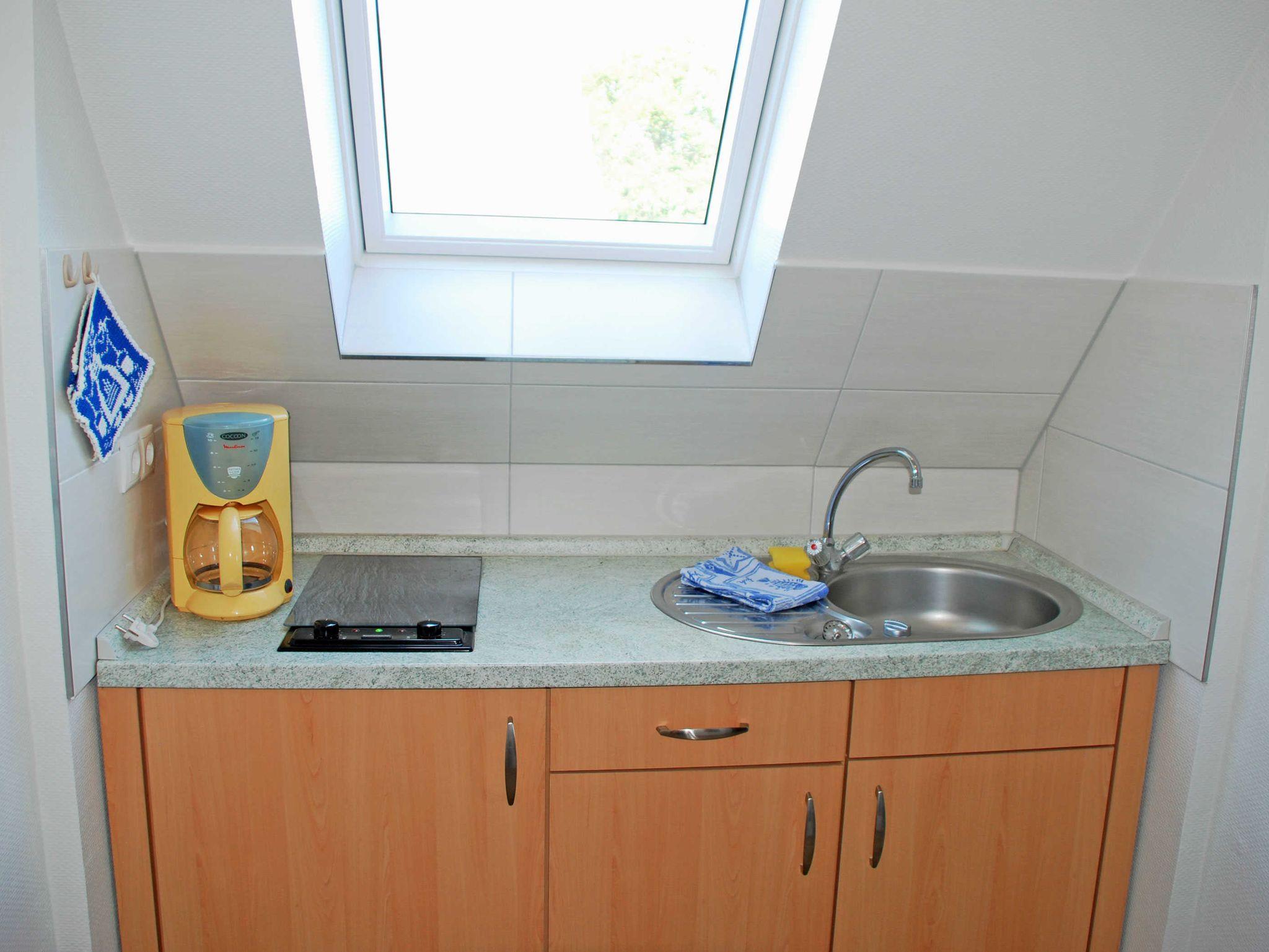 Zur Ausstattung der kleinen Pantryküche im Flur gehören ein kleines Cerankochfeld, Spüle, Kühlschrank, Wasserkocher und Kaffeemaschine. Aus dieser Wohneinheit haben Sie einen herrlichen Blick auf den Bodden. Auf der Wiese mit Gartenmöbeln können Sie die Sonne genießen oder bei einem Gläschen Wein entspannen. Ein Kinderreisebett und Hochstuhl können auf Wunsch gern gegen eine kleine Gebühr bereitgestellt werden. Auf Wunsch sind gegen Aufpreis bei Ihrer Anreise die Betten mir Bettwäsche bezogen und es liegen frische Handtücher bereit, bitte dann mitbuchen! Das Bad ist mit Dusche, WC, Fön und Waschtisch ausgestattet.