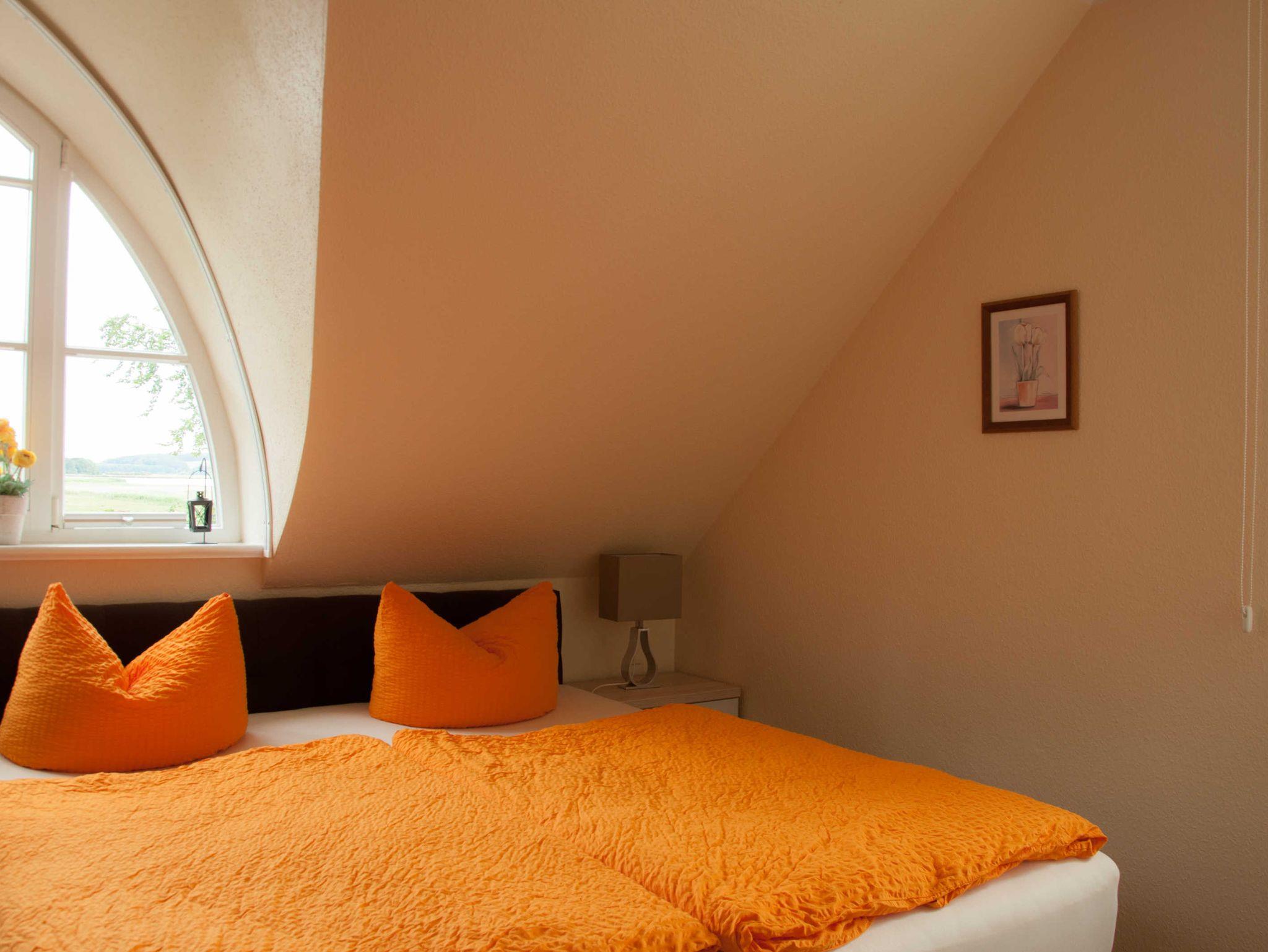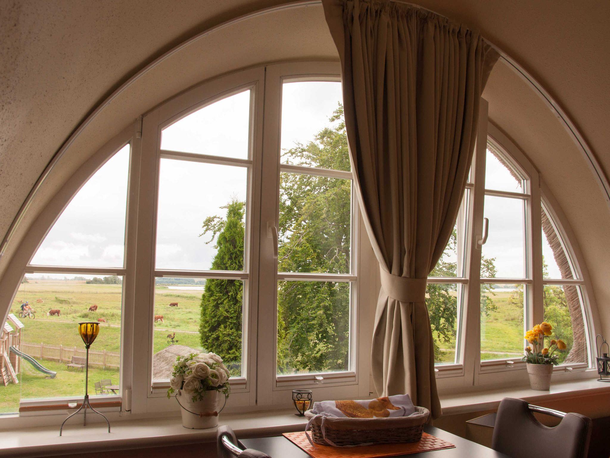 Das durchdachte Farbkonzept mit warmen Farben und aufeinander abgestimmten Möbeln verleiht der Wohnung ihren besonderen Charme. Relaxen Sie auf der riesigen Sofaecke beim Lesen, Fernsehen oder vor dem Kamin oder genießen Sie schon zum Frühstück den herrlichem Blick aus dem großen Panoramafenster auf die Hagensche Wiek.