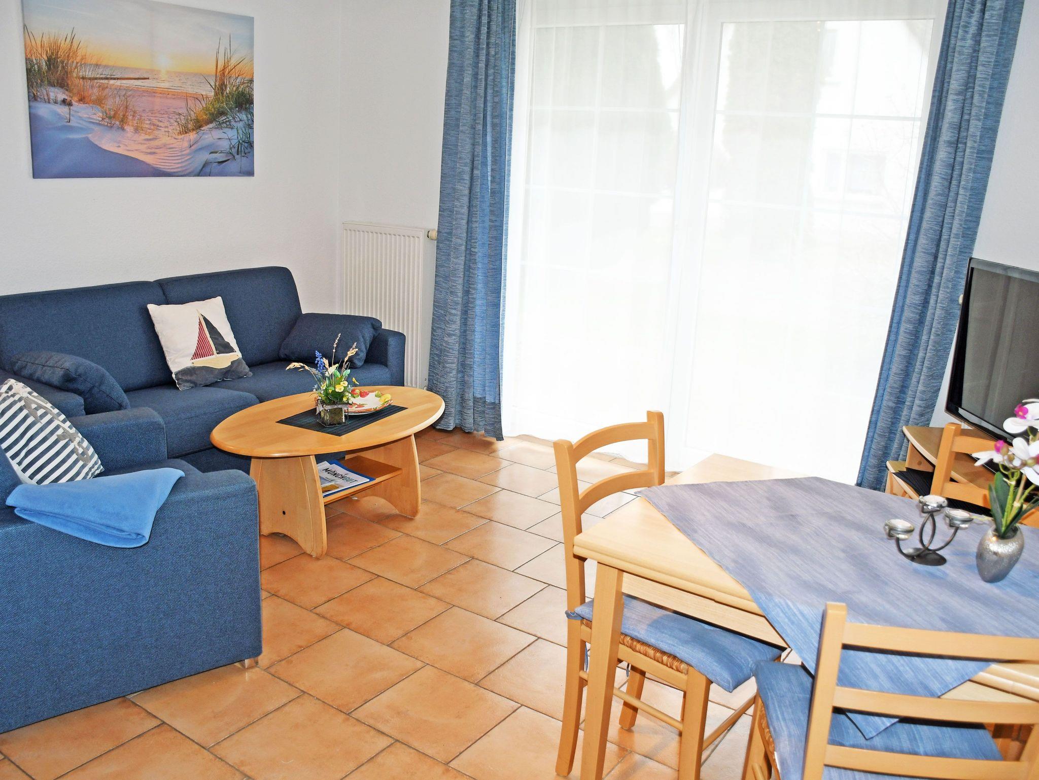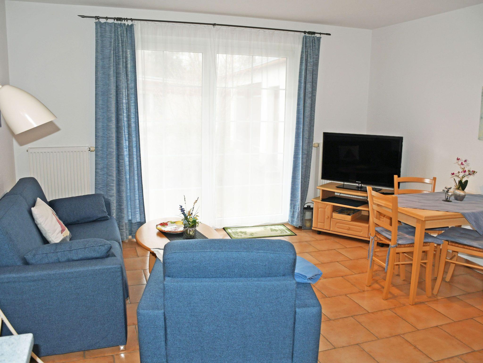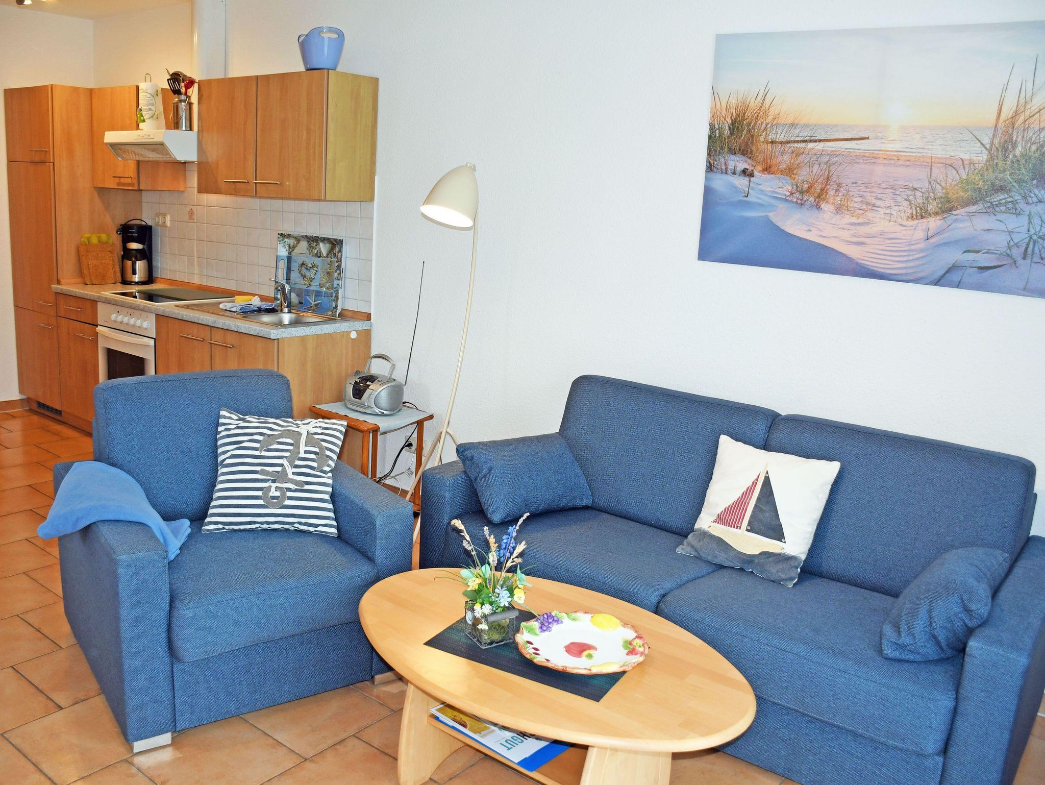 Die Ferienwohnungen Vilm und Ruden liegen im Erdgeschoss des Appartementhauses und verfügen über einen separaten Eingang. Sie sind ca. 35 qm groß, haben Platz für maximal 2 Erwachsene und ein Kind bis 3 Jahre im Kinderreisebett. Sie wurden modern sowie liebevoll eingerichtet und bietet ein WLAN-Internetzugang. Im Wohnraum befinden sich eine bequeme Sitzcouch mit Tisch und ein modernes Flachbild-TV-Gerät und Radio. Hier steht auch ein Esstisch mit Stühlen.