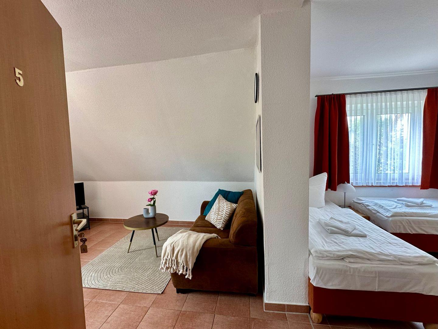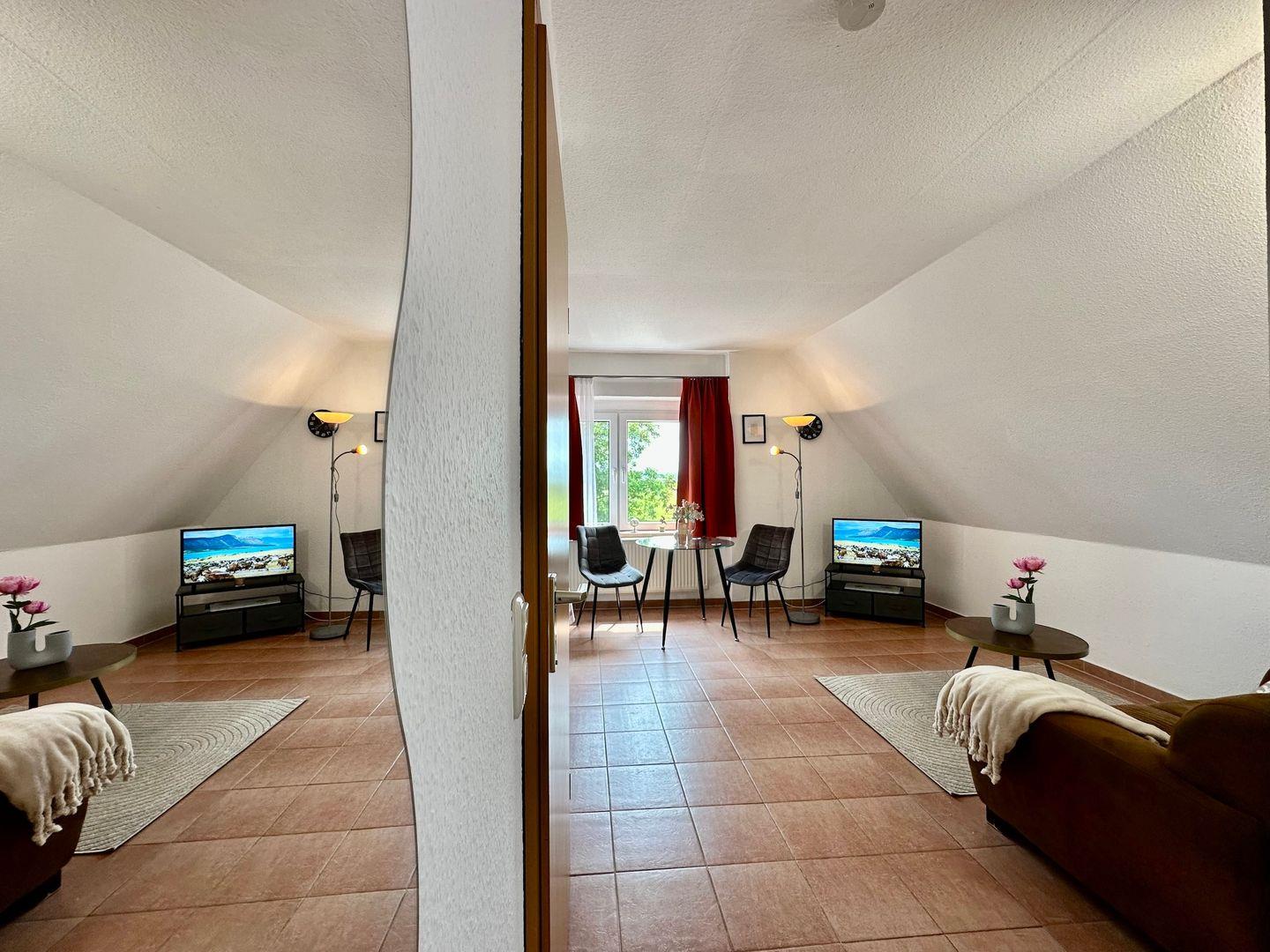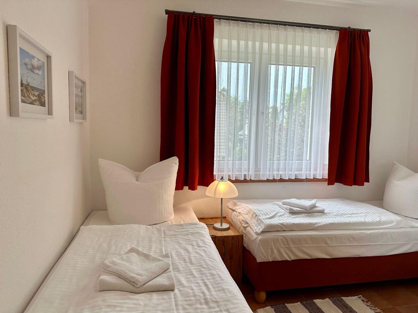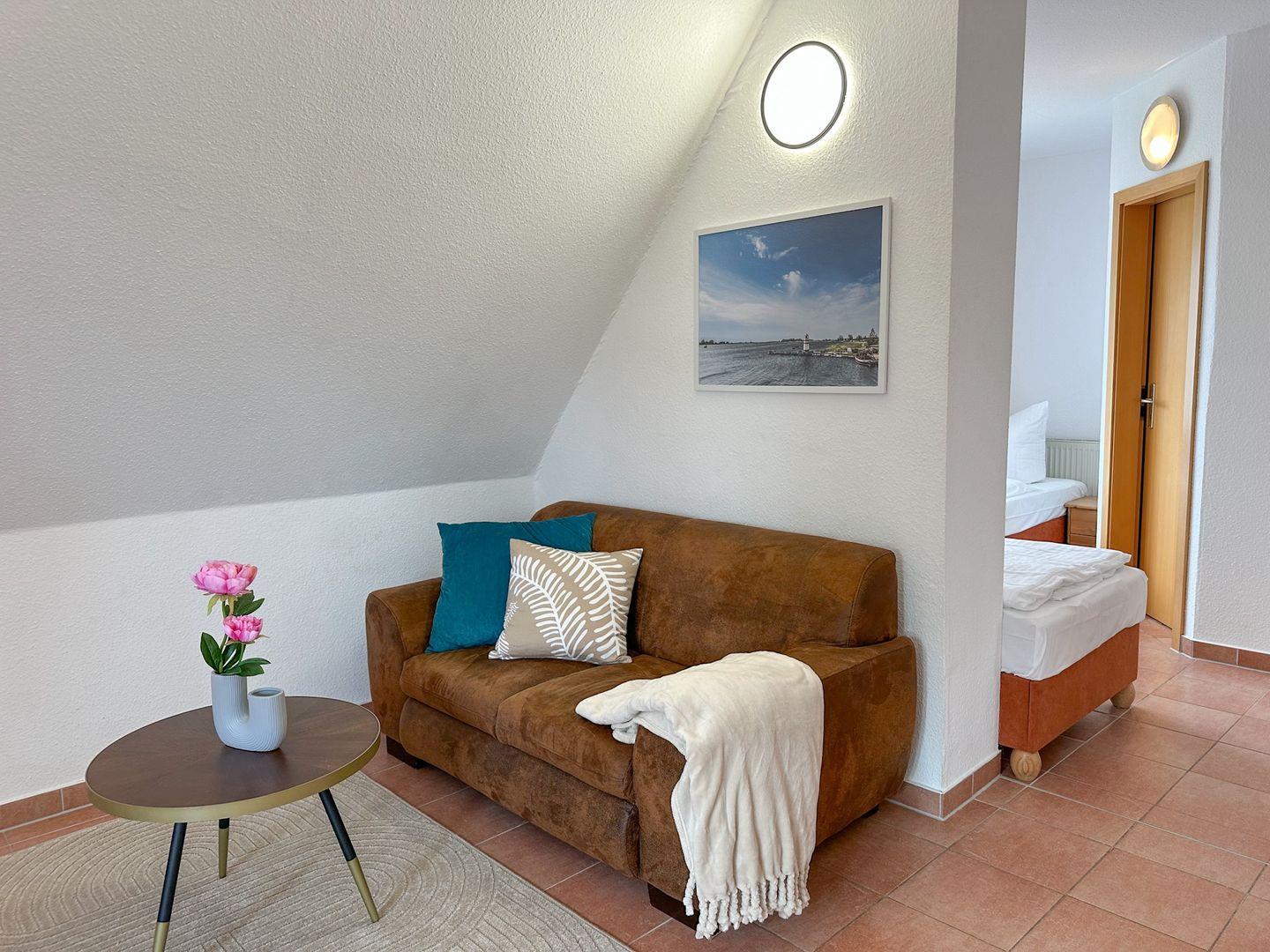 Das Apartment verfügt über zwei Einzelbetten, einen kleinen Essbereich sowie eine gemütliche Sitzecke. Die Atmosphäre ist offen und hell – ideal für erholsame Urlaubstage.