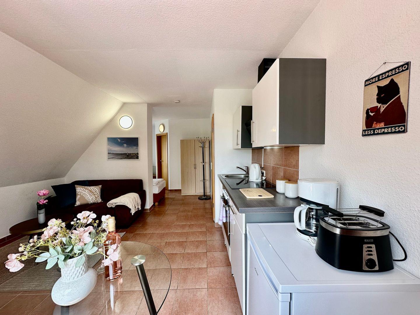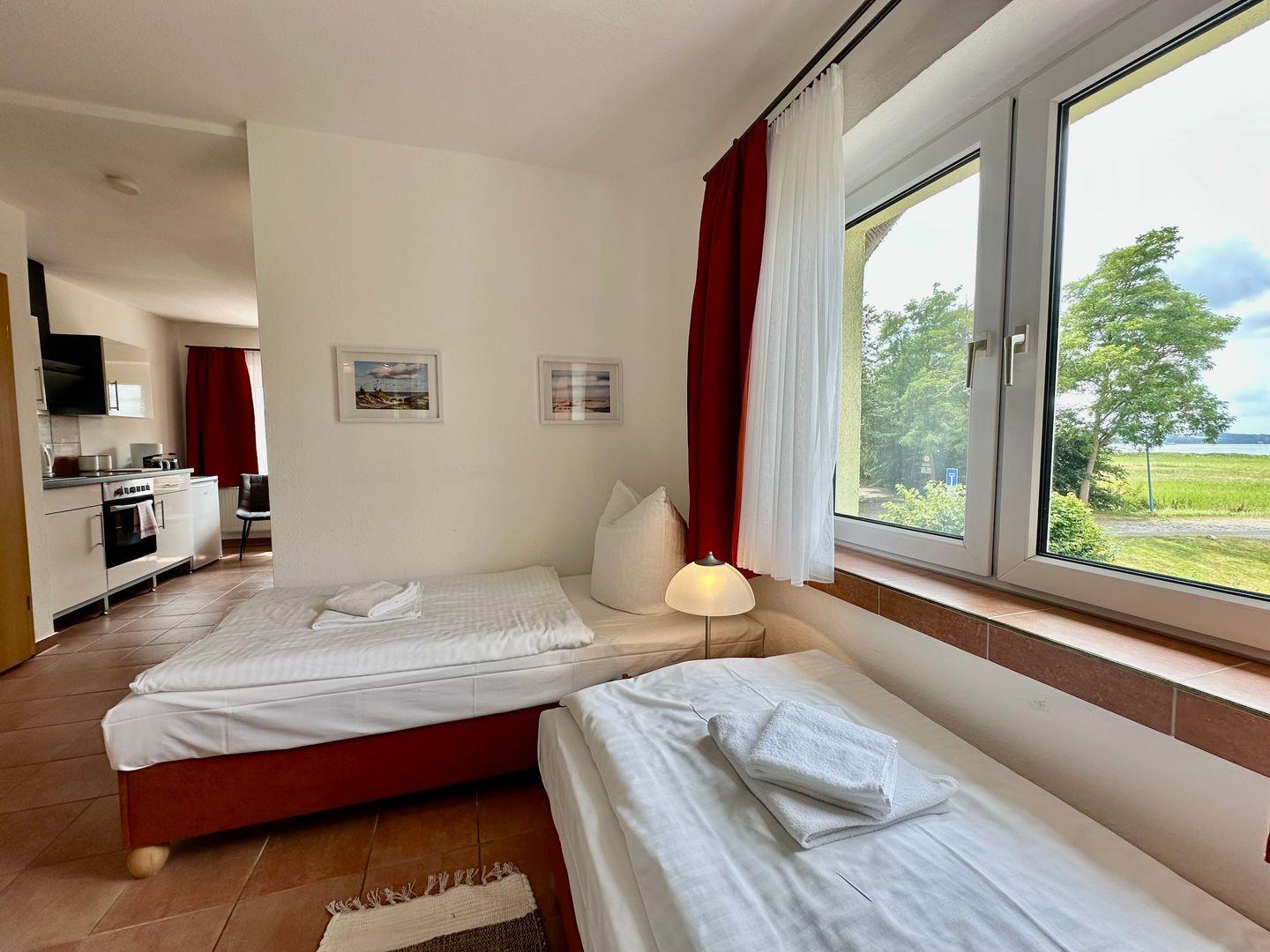 Dieses charmante 28?m² große Studio im Obergeschoss ist ideal für zwei Gäste, die Weitblick und Gemütlichkeit suchen. Besonders hervorzuheben ist der Balkon mit traumhaftem Blick auf den Bodden, der morgens wie abends zum Verweilen einlädt.