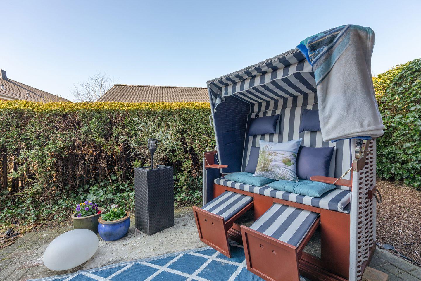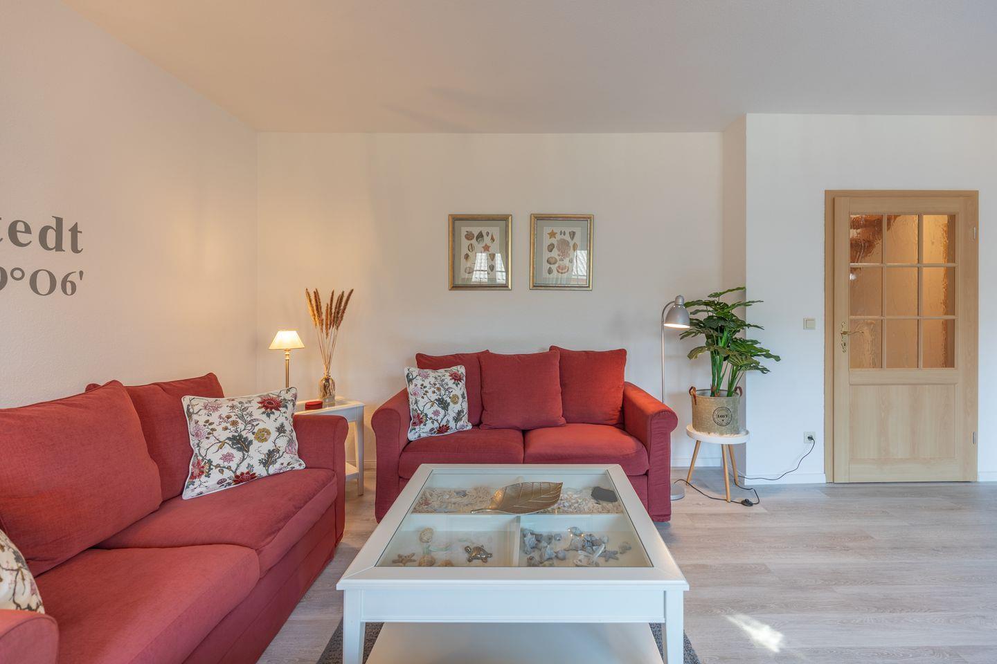 Die großzügige Doppelhaushälfte "Vier Jahreszeiten" bietet auf rund 120 Quadratmetern ausreichend Platz für bis zu vier Personen. Der Wohnbereich ist großzügig geschnitten und bietet eine helle, freundliche Atmosphäre. Große Fensterflächen, helle Vorhänge und eine Terrassentür sorgen für viel Tageslicht und schaffen eine angenehme Verbindung zwischen Innen- und Außenbereich. Von hier aus gelangen Sie direkt auf die möblierte Terrasse mit eigenem Strandkorb – ein geschützter Platz für ruhige Stunden im Freien. Die Sitzecke ist mit zwei komfortablen Sofas und einem gemütlichen Sessel ausgestattet. Ein Flachbild-TV sorgt für Unterhaltung, ebenso wie eine kleine Auswahl an Büchern im offenen Regal. Liebevoll gesetzte Details wie der Glastisch mit Muscheldeko und stilvolle Dekorationen verleihen dem Raum eine persönliche, wohnliche Note.